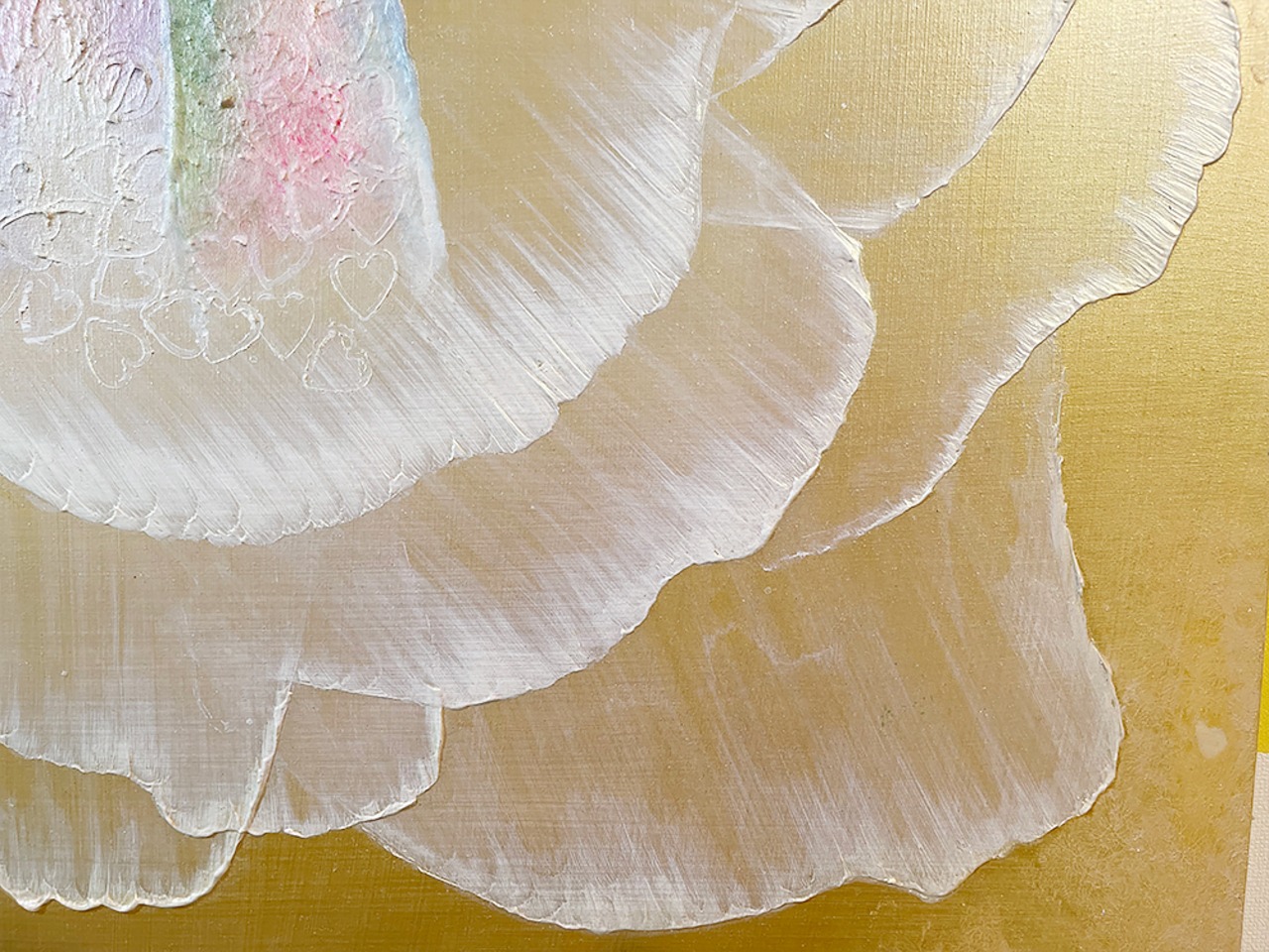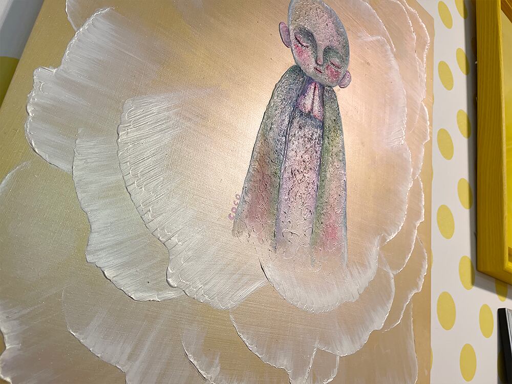 木製パネルを金色位に染め、レリーフの様な横顔のモチーフが花びらの様に折り重なりその中心に極彩色のお地蔵様を描きました。過去最大のサイズだったので、ブラックライトで反応する絵の具を使っています。お地蔵さんも少し立体的になっているので、照明の当て方で全く違う表情を見せてくれるかも知れません。