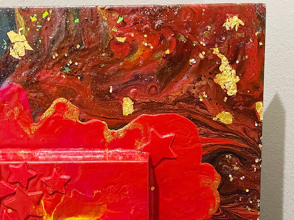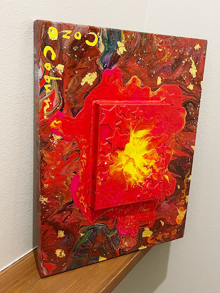 こうぶんこうぞうのポーリングを基調とした抽象画です。木製パネルに小さなパネルを重ねるという立体的なパネルの上からのポーリングにエネルギーを感じられる唯一無二の一枚です。