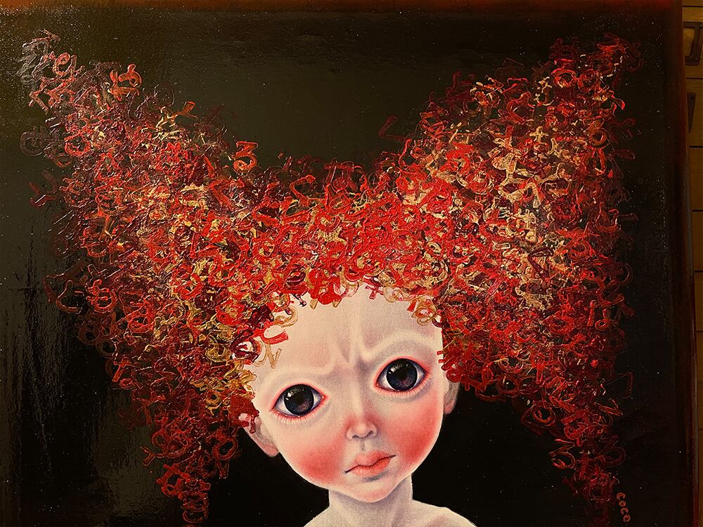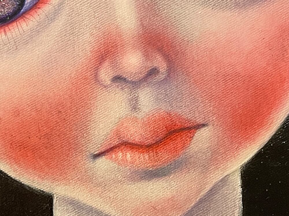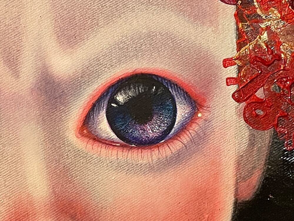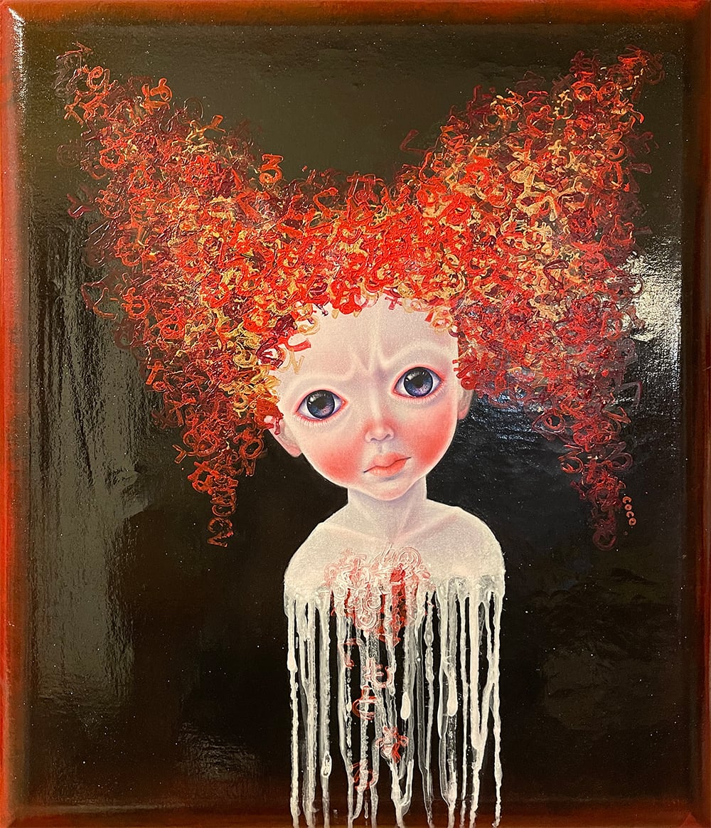 日本の大和言葉「雲となる」からインスパイアされ、その意味を自分なりに探求し表現しています。キャンバスを鮮烈な漆黒に染め、その上に真紅のスタンプを被せ、抽象的で混沌な世界を創り出しました。蝶が舞うかのような独特な髪型を持つ人物は、子供のような無邪気な表情と同時に、深い混乱や複雑な感情を秘めた存在として描いています。静謐で上品な感情の複雑さを象徴、混沌と秩序が交錯する喜びと悲しみ、複雑な人間の感情の多様性を含めこの「雲となる」という言霊を独自の感性の世界で描き出す試みをしました。