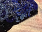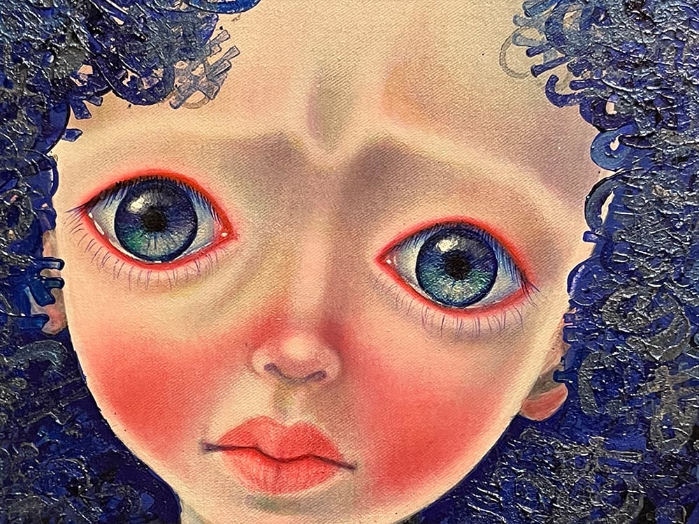 日本の大和言葉「暁」からインスパイアされ、その意味を探求し表現しています。キャンバスを漆黒に染め、その上に群青や藍色を被せ、まるで宇宙のような深遠な色調を創り出しました。独自の文様を形成した独特な髪型を持つ子どもは無邪気な表情と同時に、深い混乱や複雑な感情を秘めた存在として描いています。蒼黒が夜深い刻限の感情の象徴、混沌さと静けさが交錯する喜びと悲しみ、複雑な人間の感情の多様性含めこの「暁」という言霊を独自の感性の世界で描き出す試みをしました。