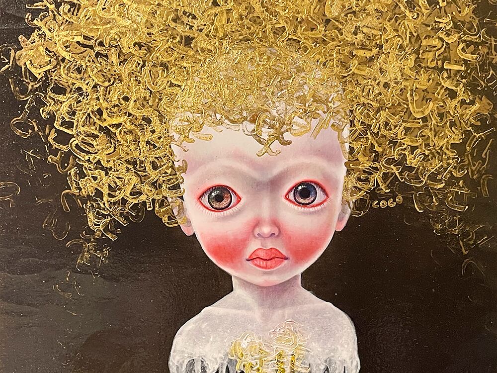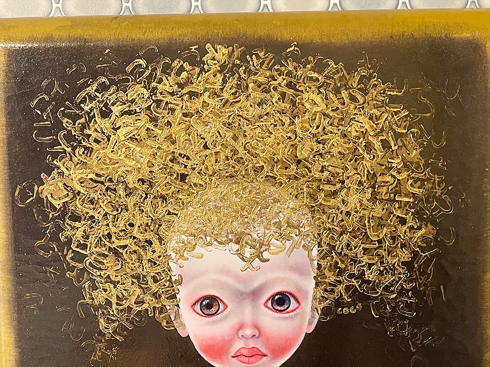 日本の大和言葉「とこしえ」からインスパイアされ、その意味を自分なりに探求し表現しています。キャンバスを漆黒に染め、その上に黄金色を被せ、抽象的で混沌な世界を創り出しました。蝶が舞うかのような独特な髪型を持つ人物は、子供のような無邪気な表情と同時に、永遠に続く時間の流れを指す一方で、すべての瞬間がその流れの中に刻まれていることを示唆する複雑な感情を秘めた存在として描いています。
