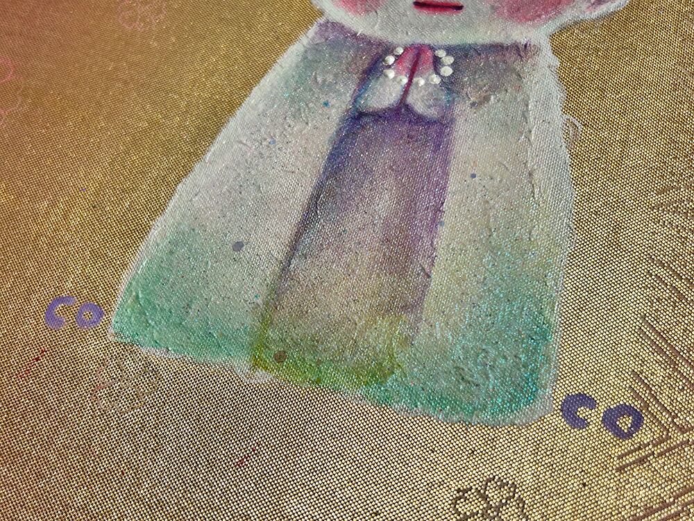 過去から未来への流れを祈りと共に描いた象徴的な作品で、日本の伝統的な着物生地を背景に用いることで、作品全体に文化的な深みと時の流れを表現し、その上に黄金と赤が滲み合った色彩が重ねられ、日のを思わせる壮麗な輝きが、希望と再生の物語を紡ぎます。