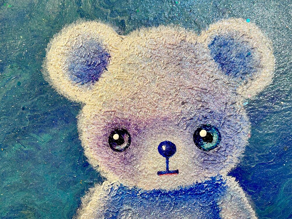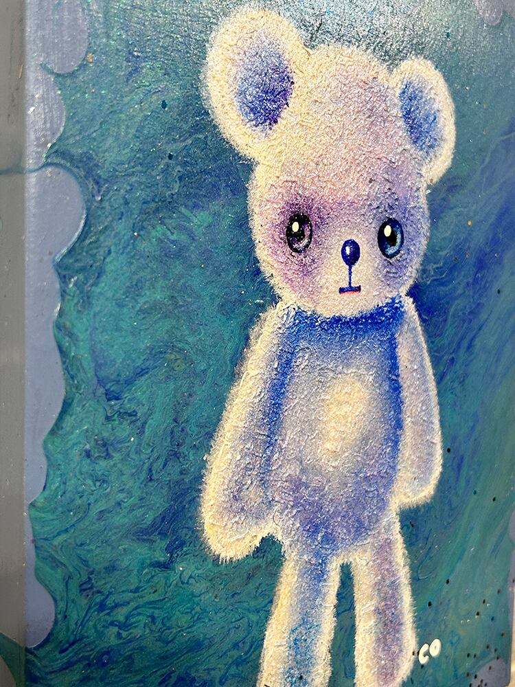 静寂の中に輝きを見出すような、美しい対比が魅力のアートピースです。深みのある青色が流れるように描かれたポーリングの土台は、夜空や大海原のような広がりを思わせ、観る者をどこか遠くの静謐な世界へ誘います。その中にそっと佇むのは、青に染まりそうな影をまとった白いcocoくまのぬいぐるみ。