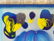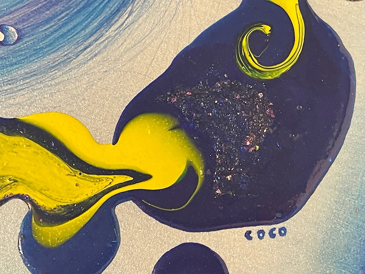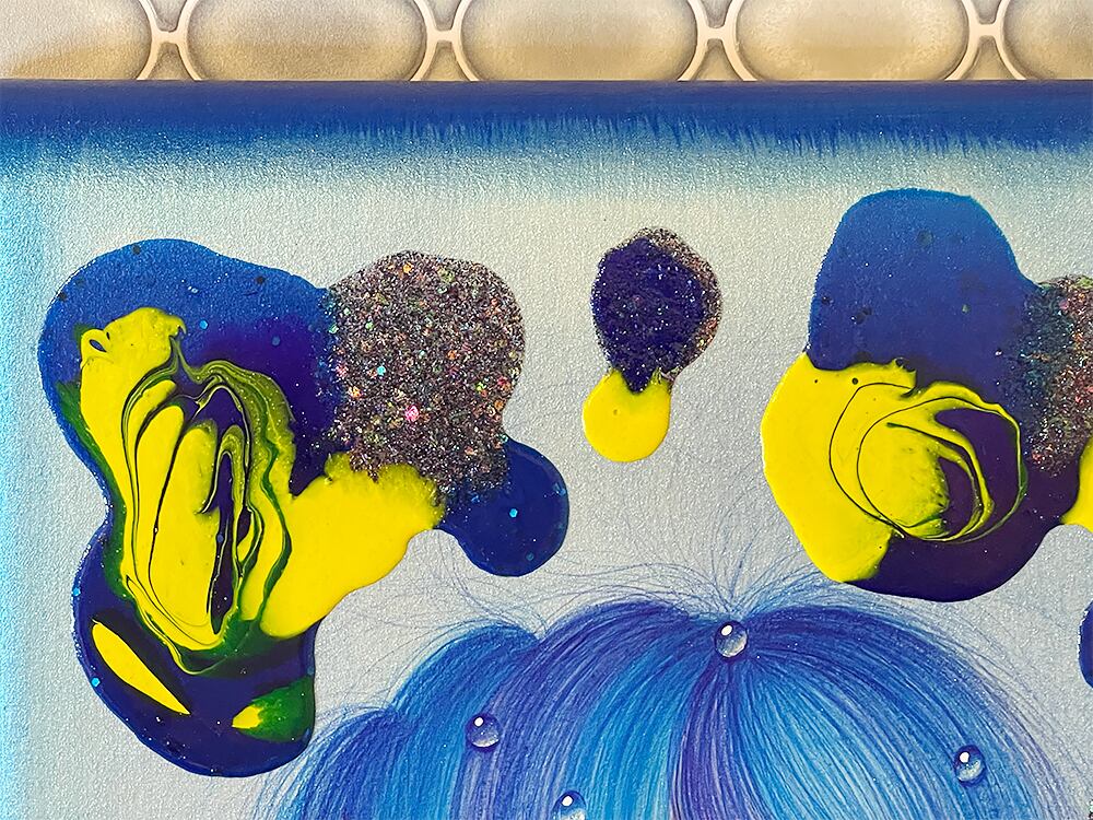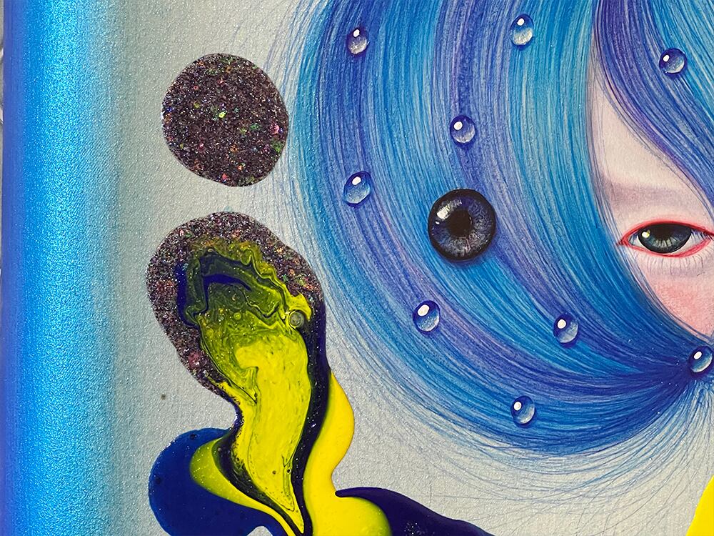 淡く輝くブルーに染められたキャンバスは、無限の広がりを持つ空間を象徴し、思考と感情の波に包まれた現代の存在そのものを映し出している。青い髪は、流動する水や風のように動的で、固定された形を持たない。口元を覆い隠したその髪は、言葉にできない思考や未整理の感情を暗示し、「伝えたいけれど伝えられない」人間の本質的なジレンマを物語っている。