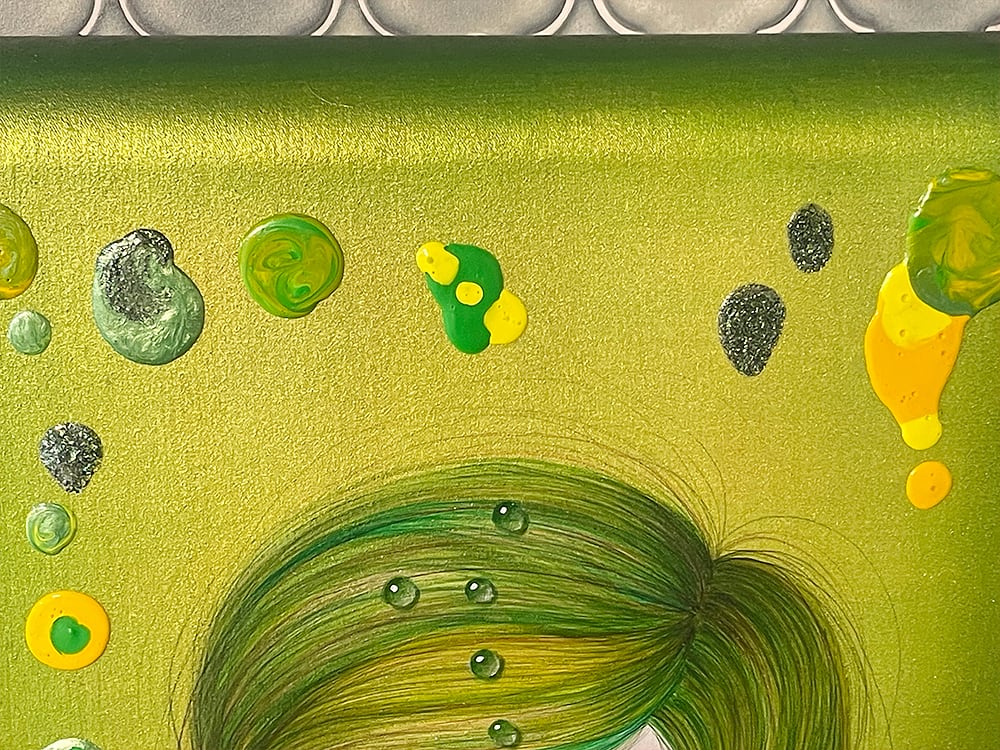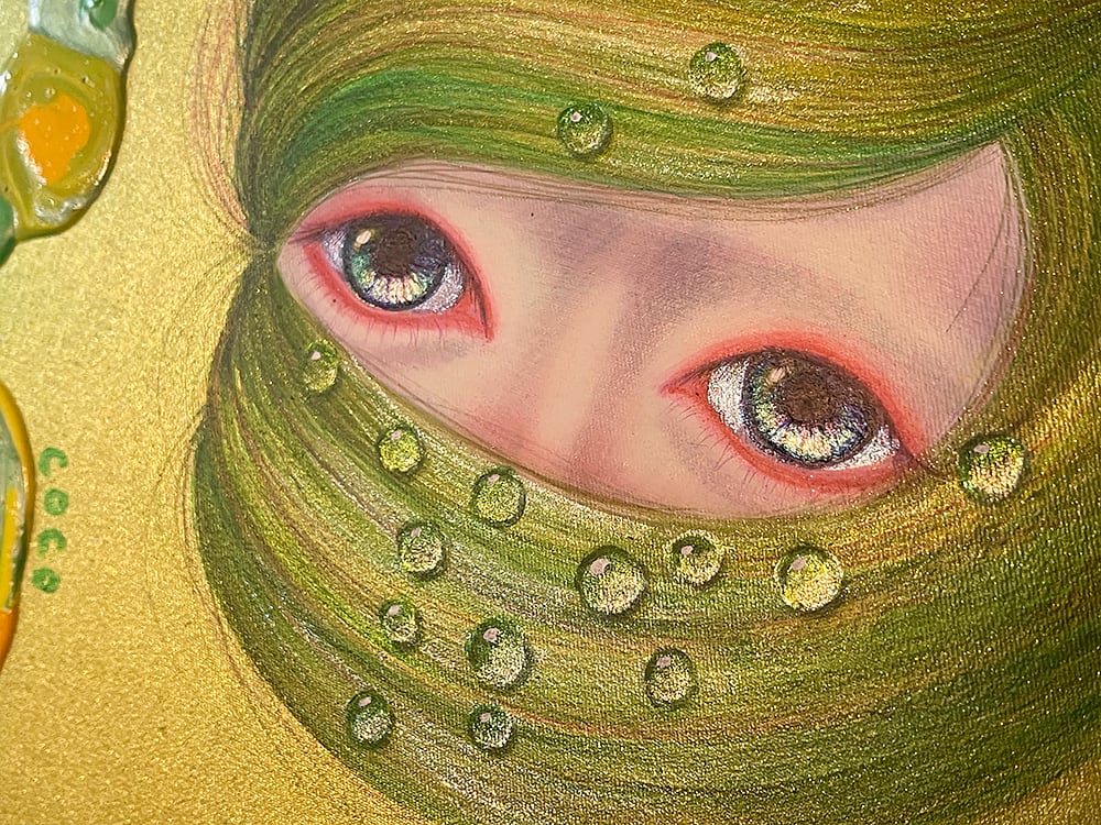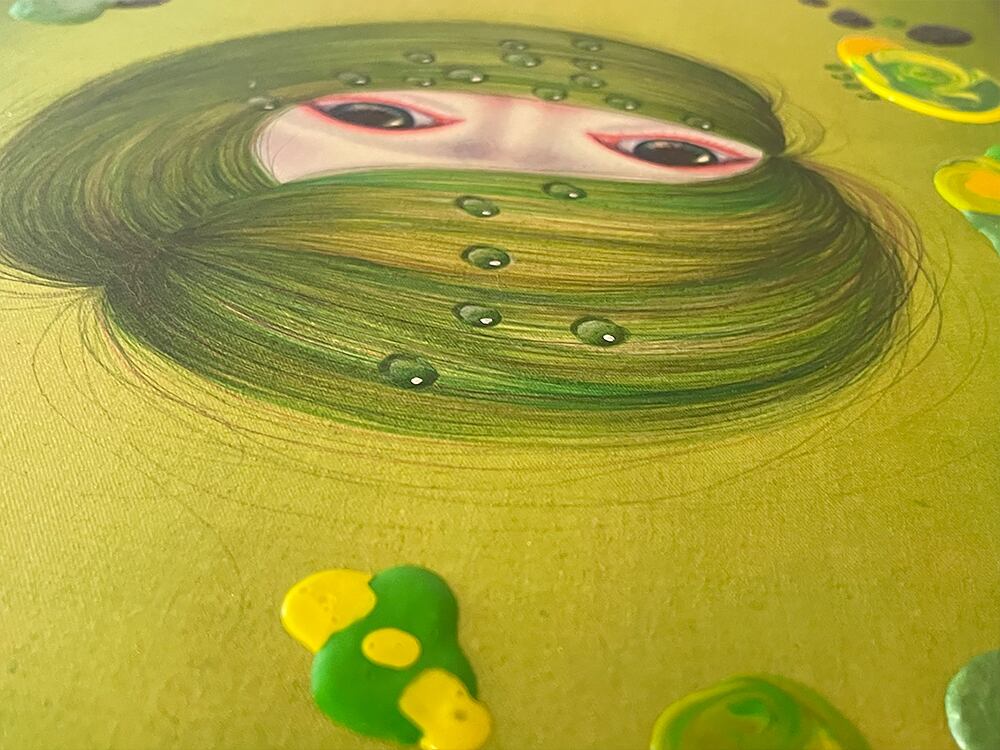 内面の選択や決断を視覚的に探求します。黄緑色の偏光螺鈿色に染まったキャンバスに描かれた少女は、玉虫色の髪で口元を覆い隠し、目と鼻筋だけが覗くことで、無言の葛藤や秘めた意志を表現。髪の上に並ぶ丸い水滴は、瞬間的な決断と涙のコレクションを象徴し、周囲に浮かぶ立体的な絵の具は、心の動きや感情の変化を視覚的に示しています。色の重なりと立体感が、意思決定の複雑さを美しく映し出す作品です。