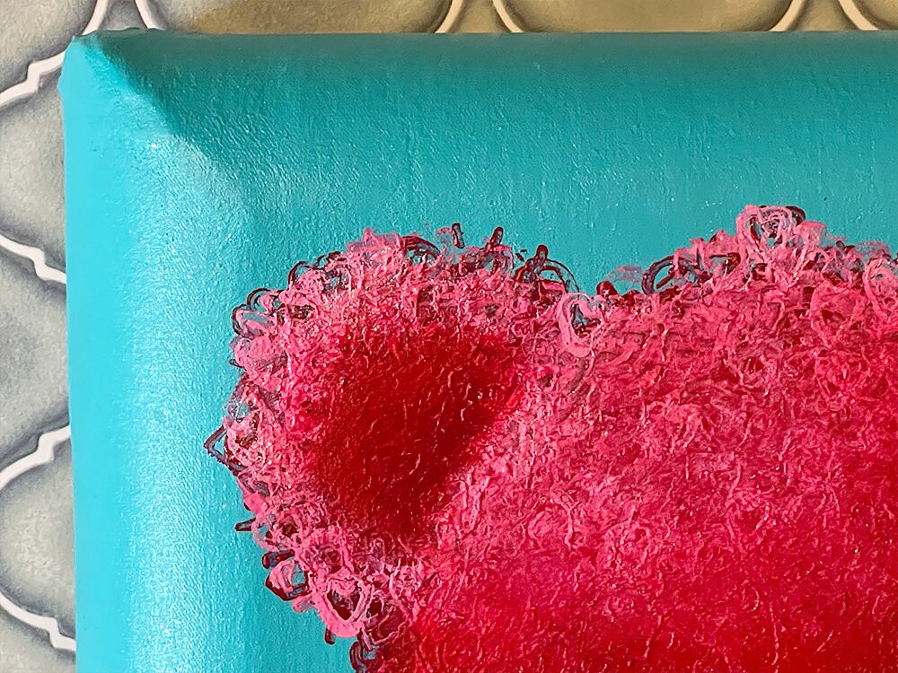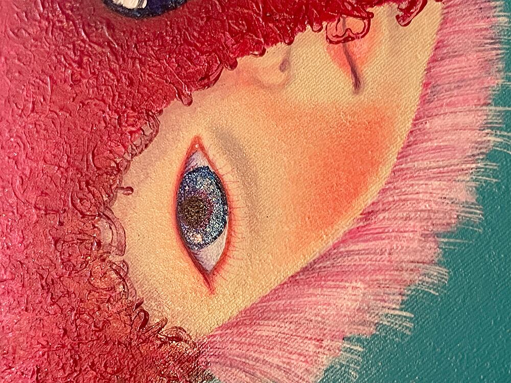 鮮やかな水色のキャンバスが象徴する無垢さと広がる可能性の中に、真っ赤なクマのぬいぐるみの顔をまとった少女という、視覚的に衝突する存在が佇む作品。水色の背景は清涼感と透明性を思わせる一方で、その上に描かれたクマの鮮烈な赤色は感情の波や社会的なプレッシャーを象徴しています。