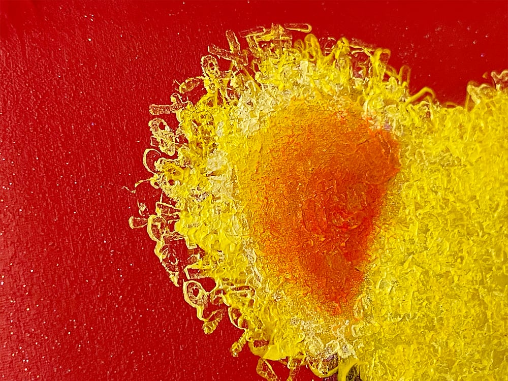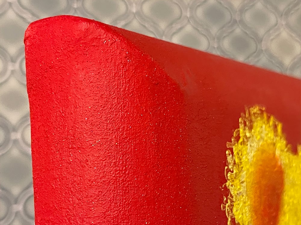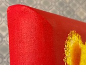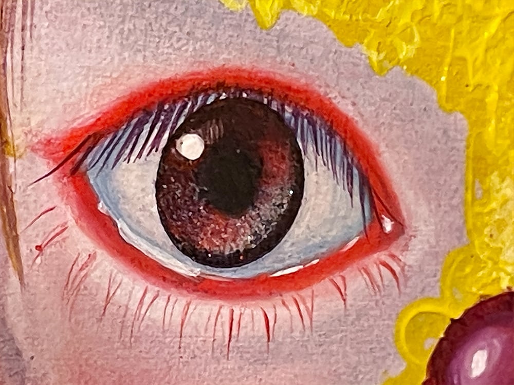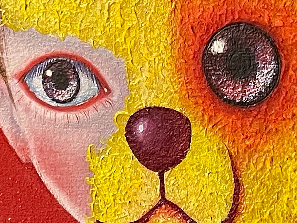 真紅のキャンバスに広がる感情の象徴、その中心に描かれた黄色のクマのぬいぐるみの顔をまとった子ども。無機質な表情と鋭い視線が、仮面の裏に隠された「本当の自分」を問いかけます。愛らしさと不調和が織りなすこの作品は、現代社会における「真実」と「仮面」の矛盾を鮮烈に描き出します。