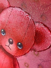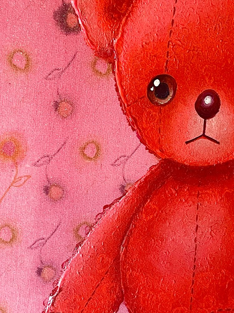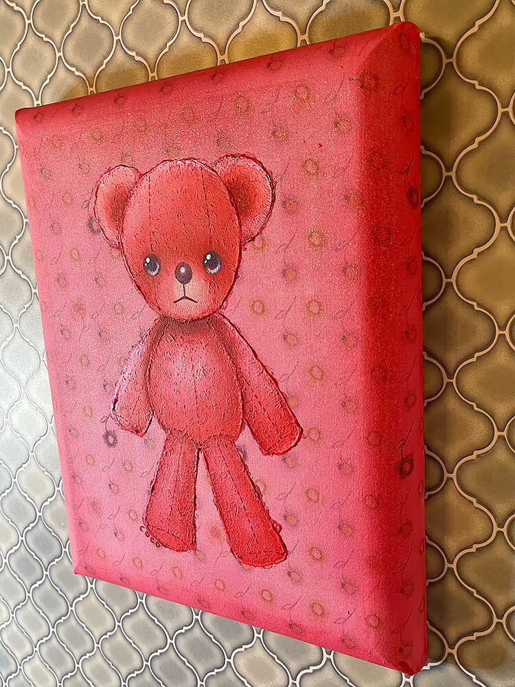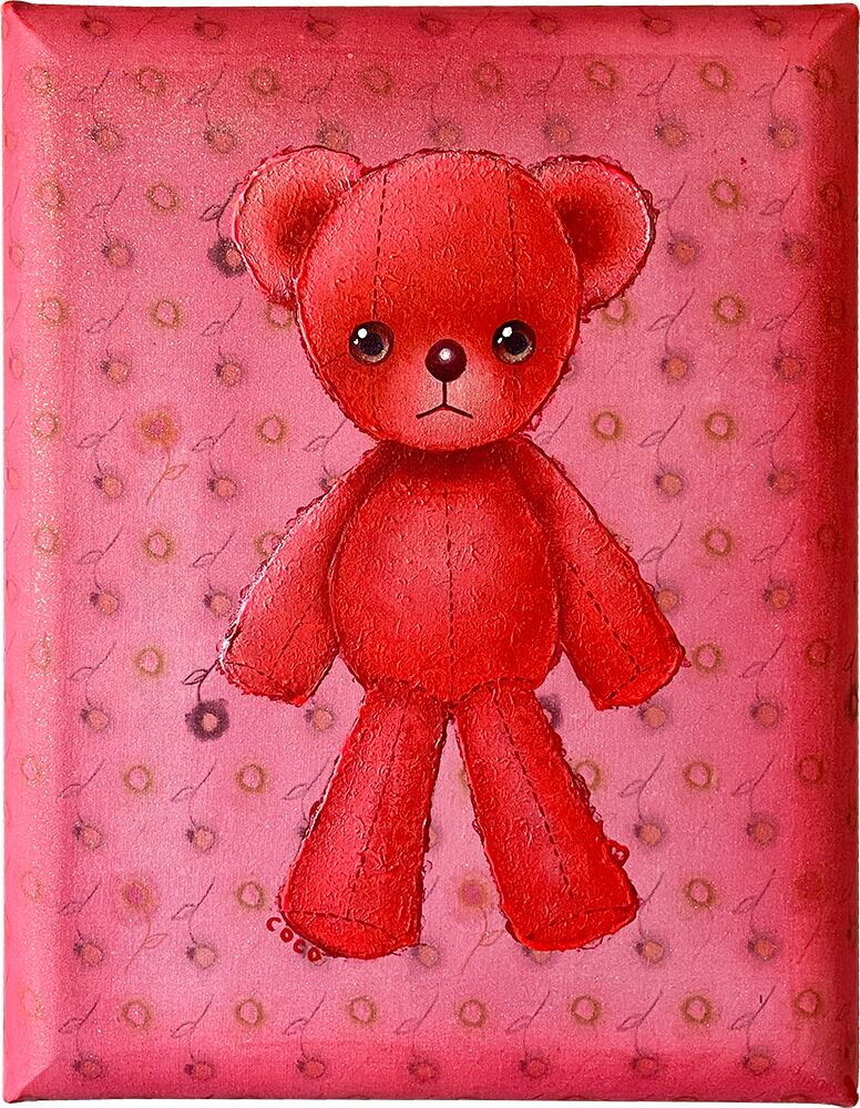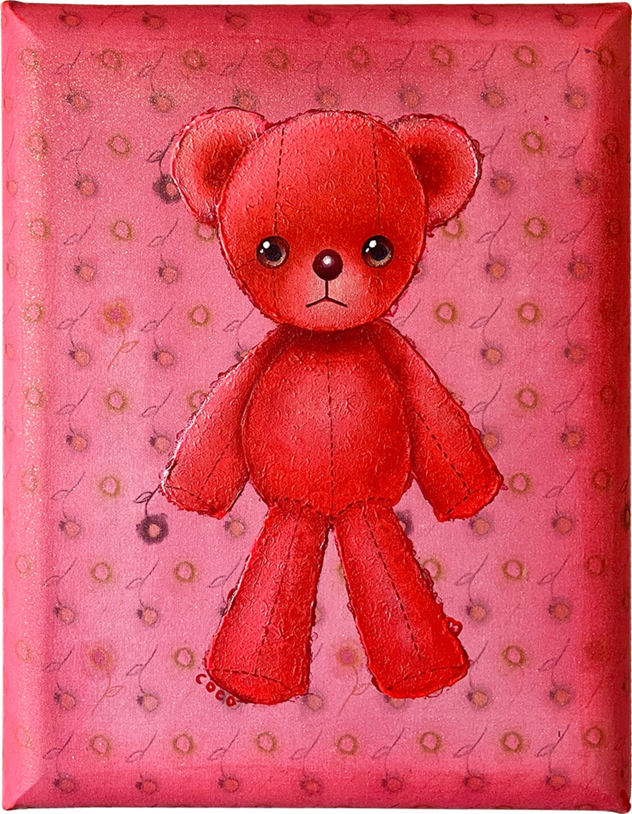 レトロフラワーのテキスタイル生地を濃いピンクに染め上げた温かみのあるキャンバスが、懐かしさと新しさの狭間を映し出します。その中心に立つのは、少し寂しげな表情を浮かべたcocoくまのぬいぐるみ。縁を盛り上げた絵の具のテクスチャーが、作品全体にほのかな立体感を与え、まるでくまがキャンバスの中から語りかけているかのような印象をもたらします。