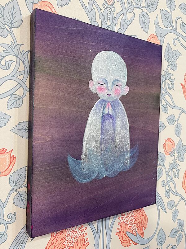 パネルの木目を生かして描いたお地蔵作品。