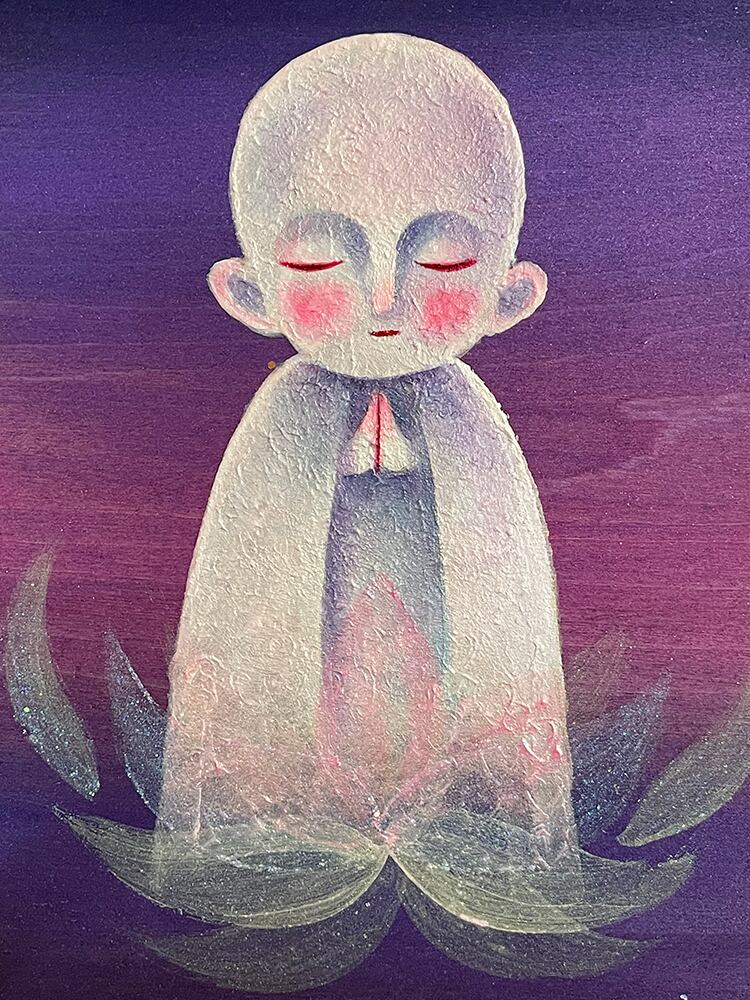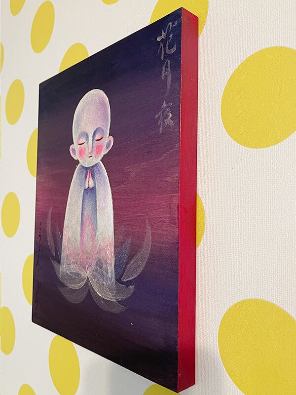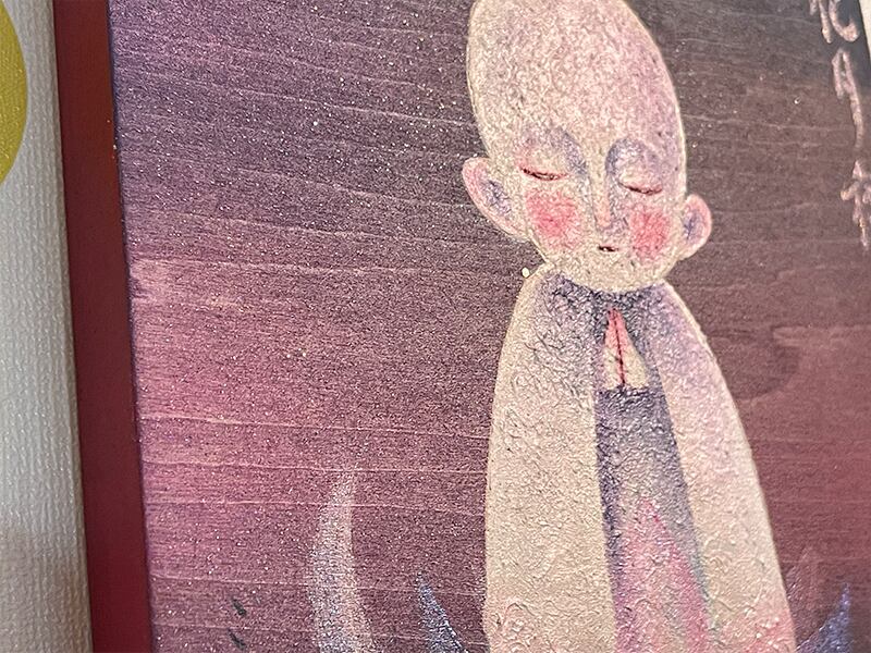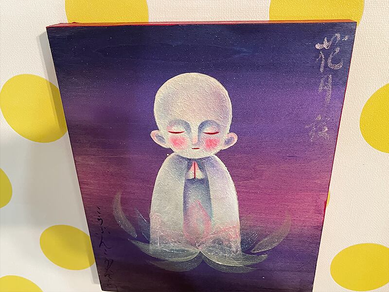 パネルの木目を生かして描いたお地蔵作品。