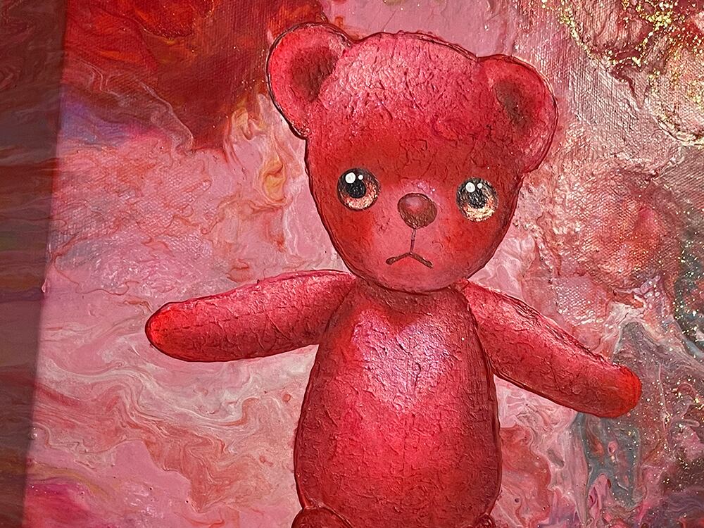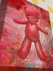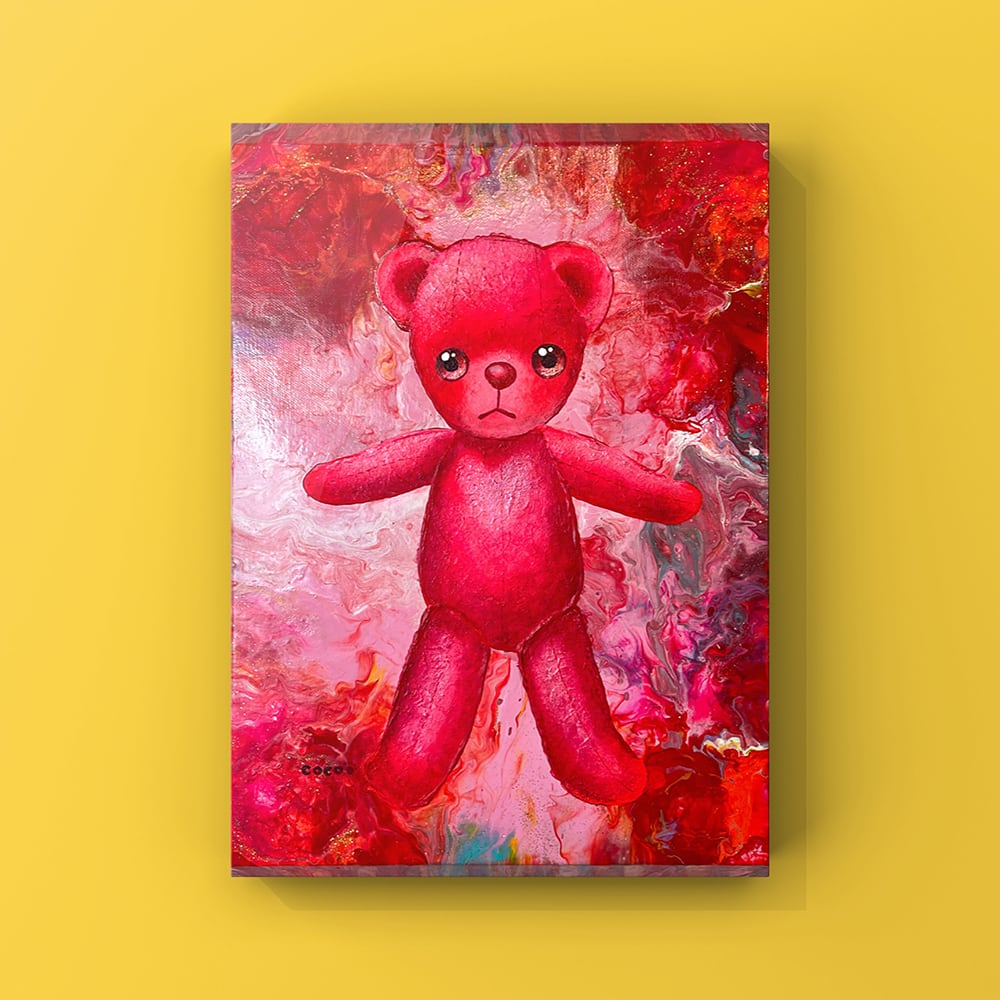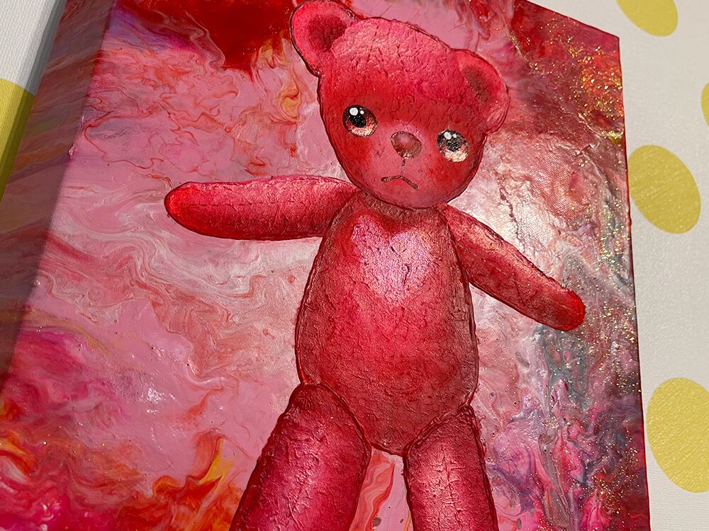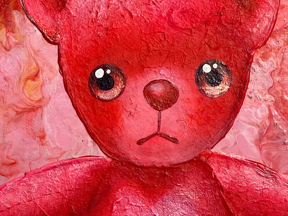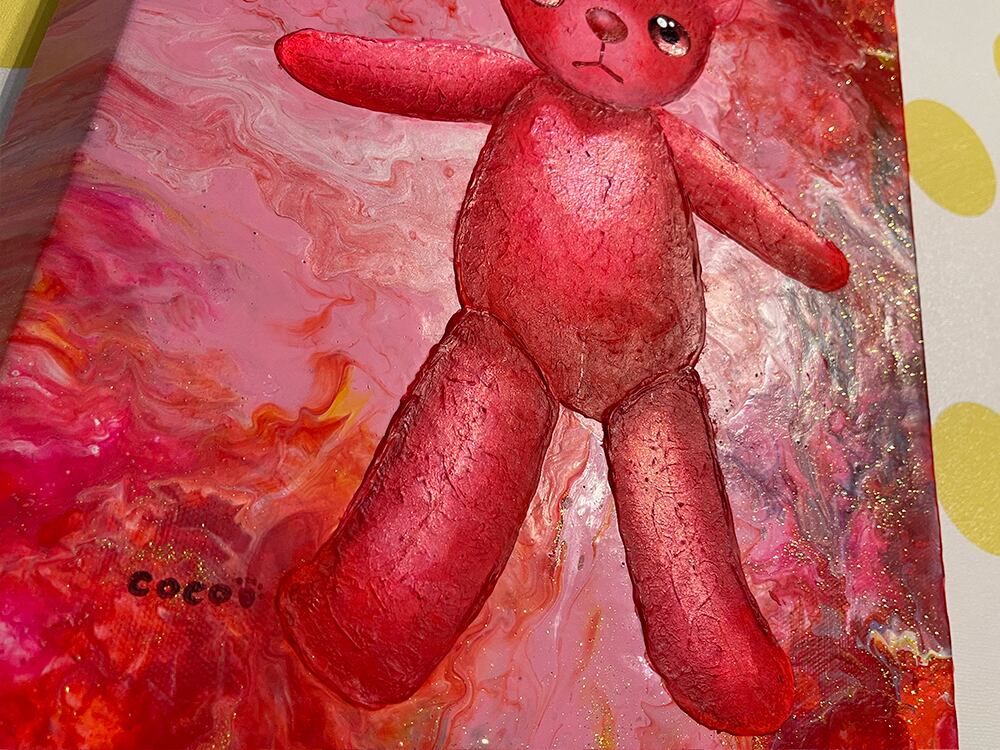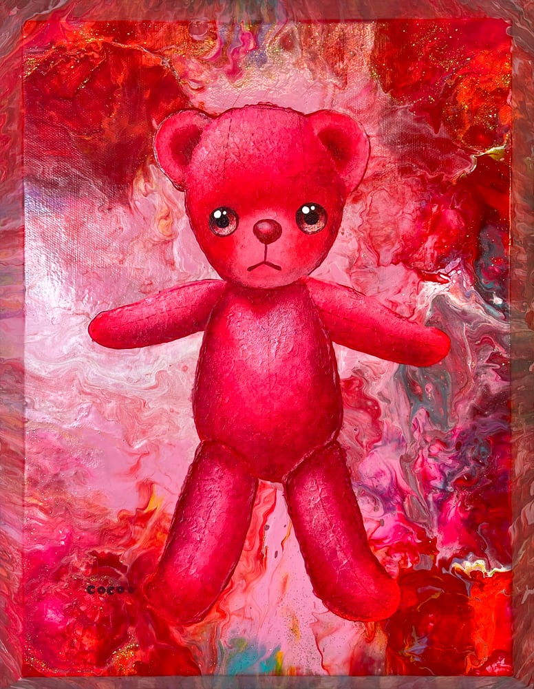 赤とピンクを基調としたポーリングを背景に真っ赤なココくま!暗い場所でブラックライトを当ててみて!背景がまるで燃え上がる炎の様です!
