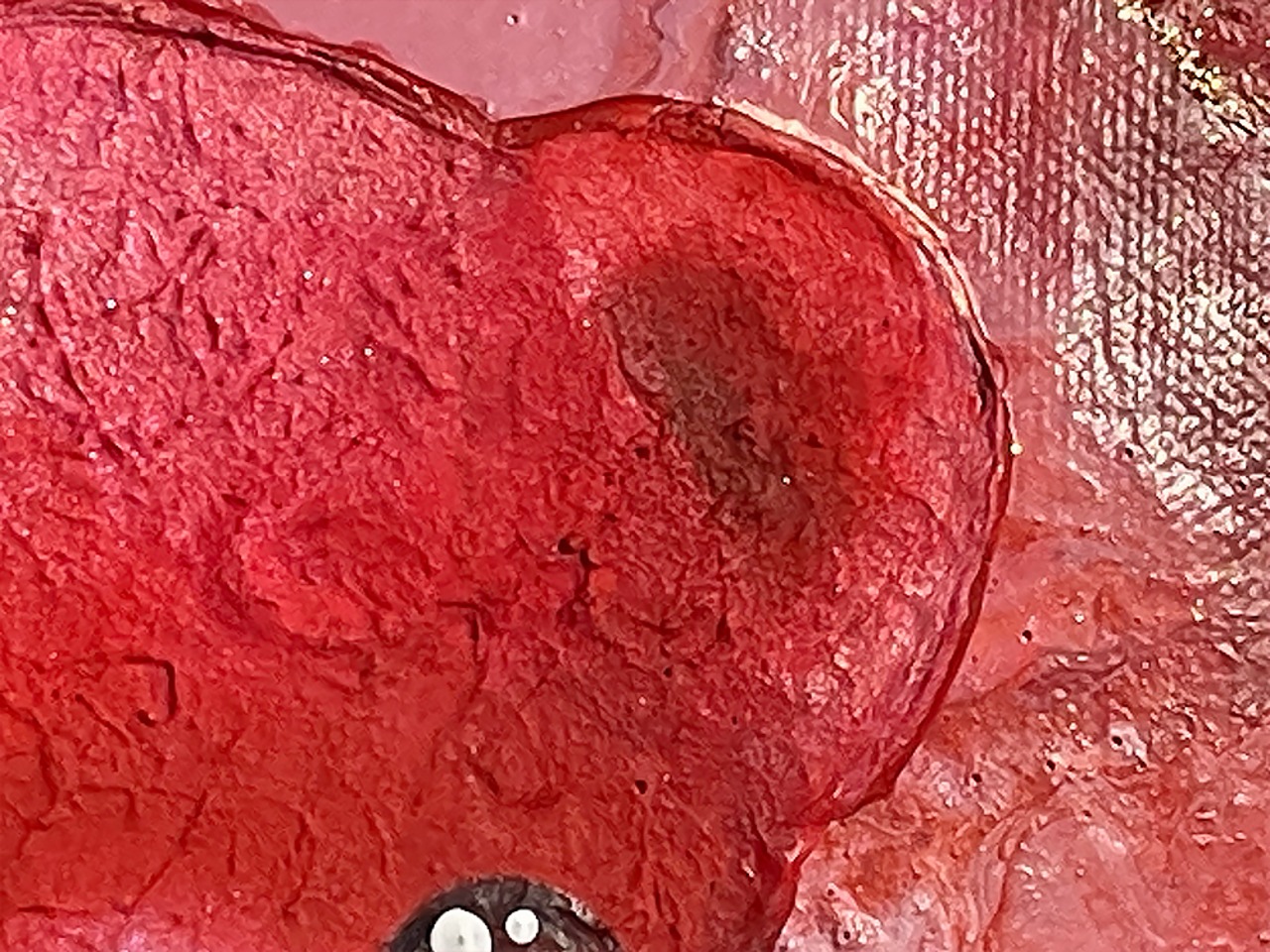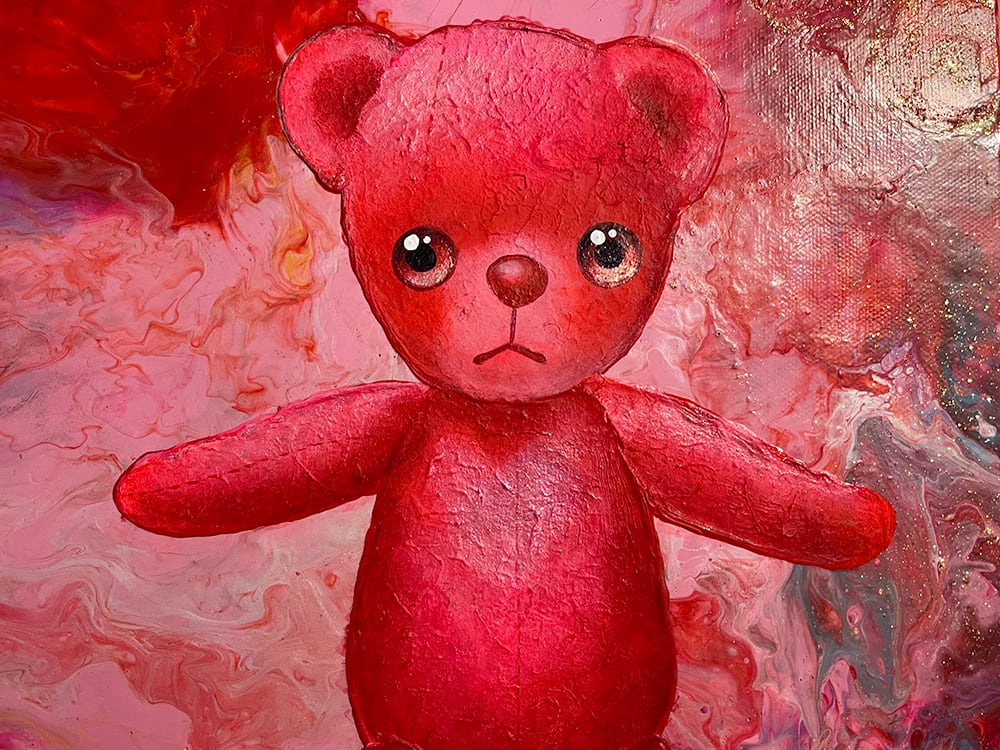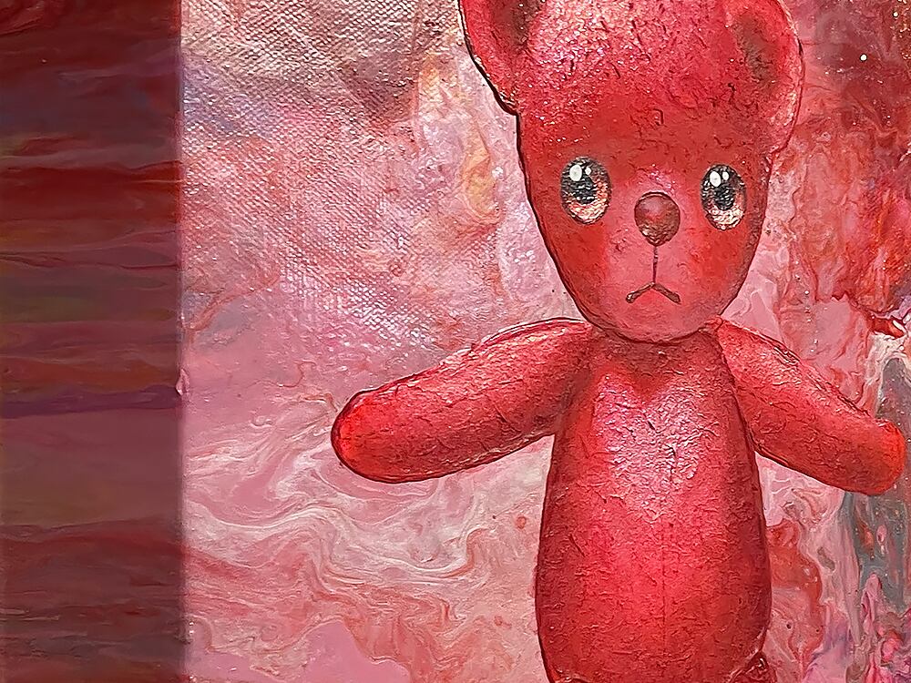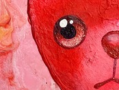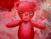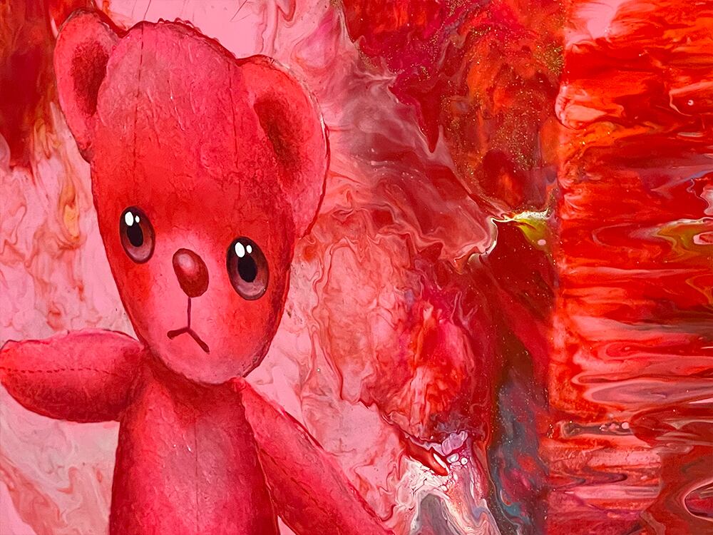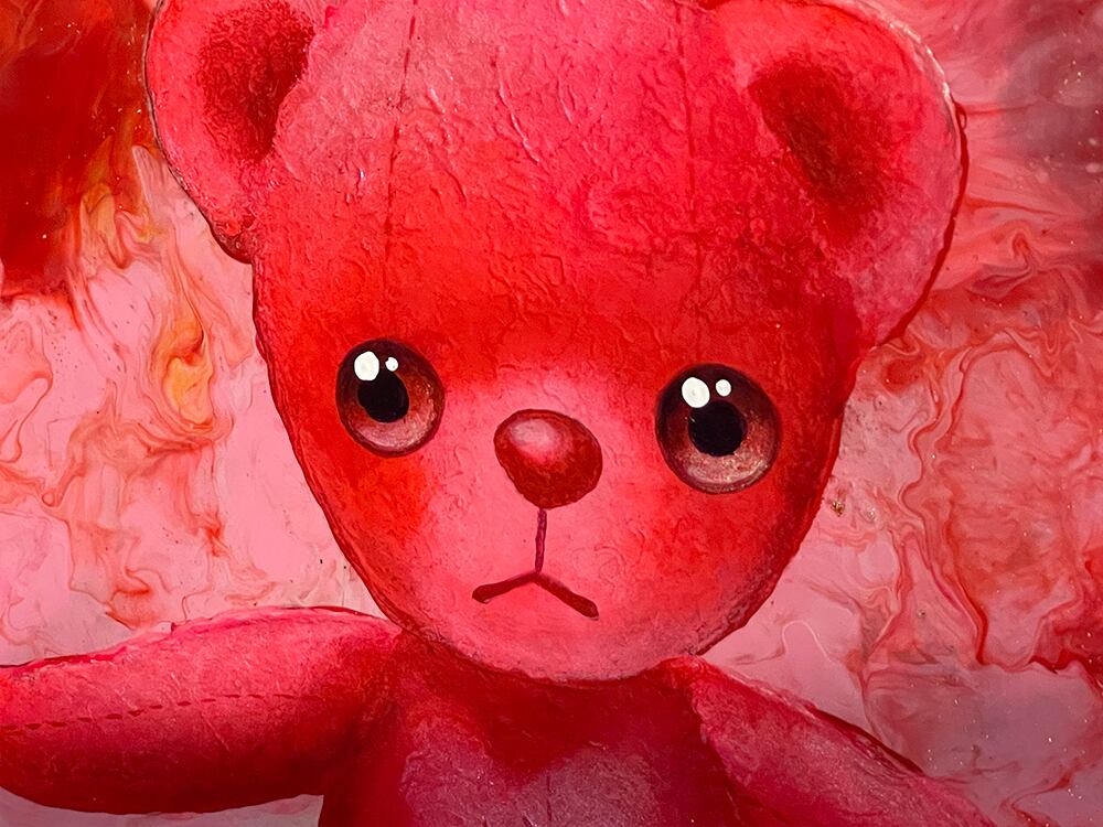 赤とピンクを基調としたポーリングを背景に真っ赤なココくま!暗い場所でブラックライトを当ててみて!背景がまるで燃え上がる炎の様です!