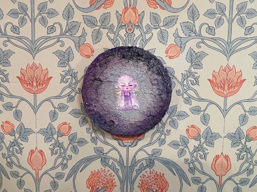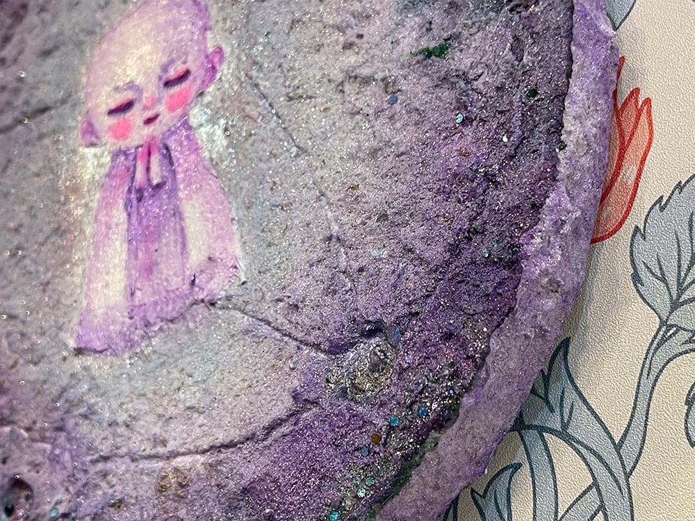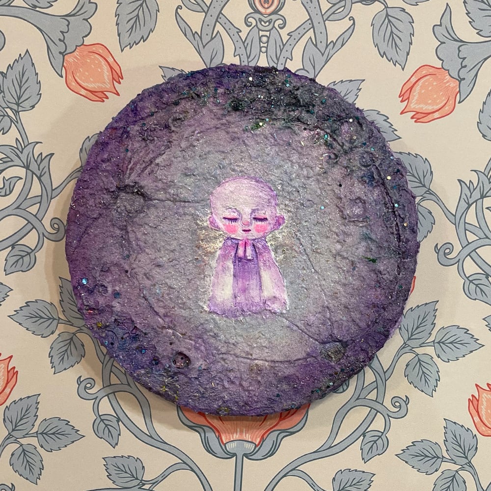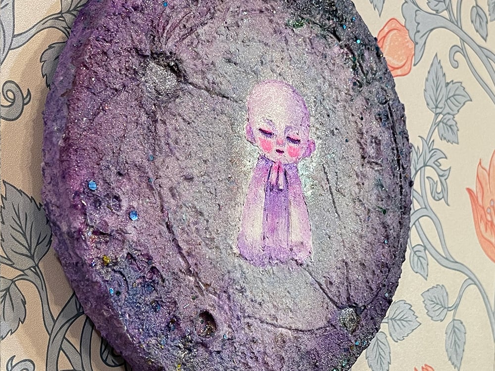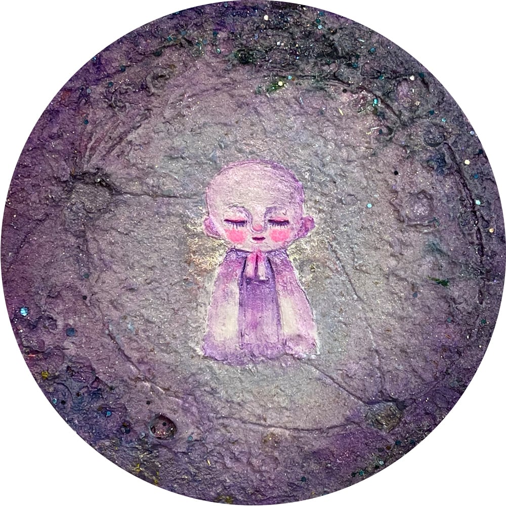 新月の日にライブ配信にて描いた思い出深い作品。円形キャンバスに描いたお月様に小さなお地蔵様を描きました。砂の入ったモデリングペーストでお月様をリアルに表現してみました。光の当たり方でテクスチャのイメージやラメの光、変更色の絵の具が変化して見えると思います。