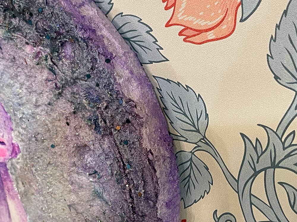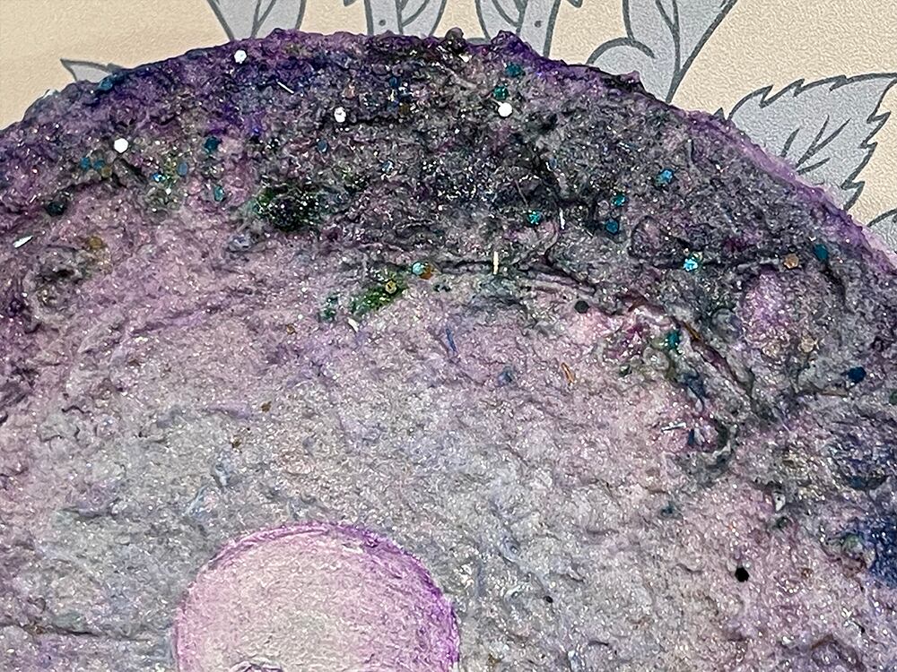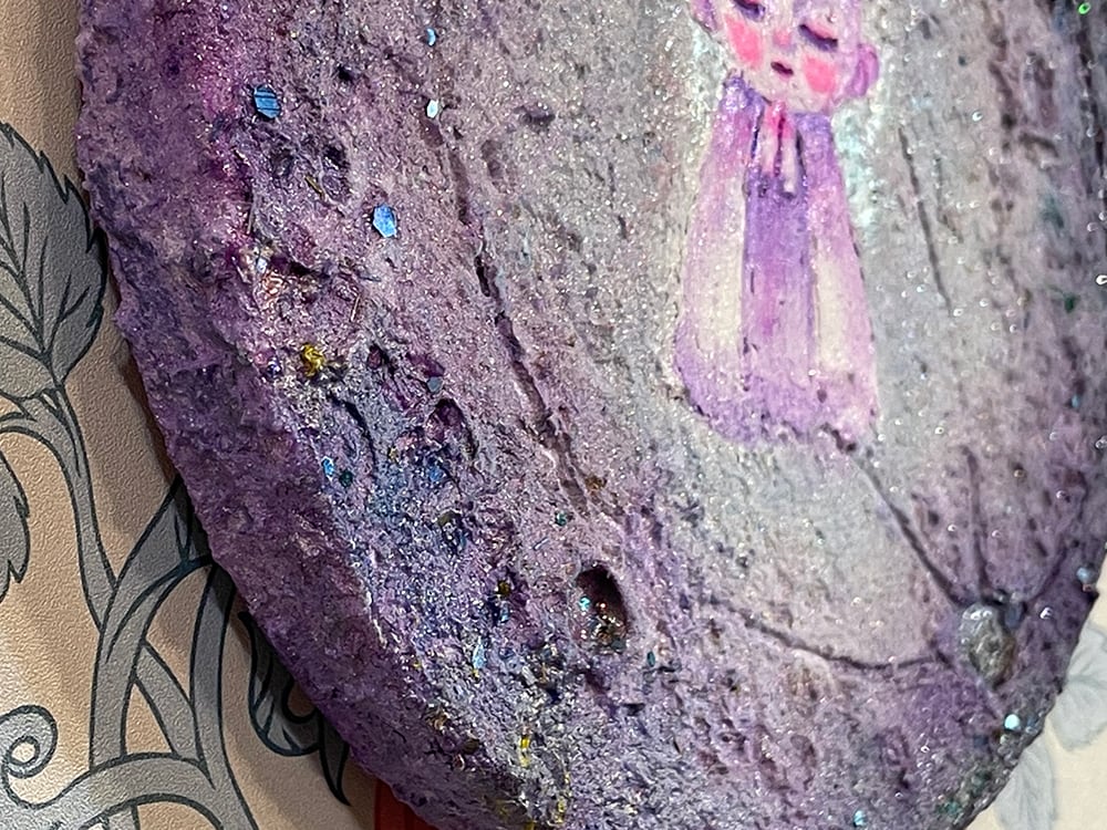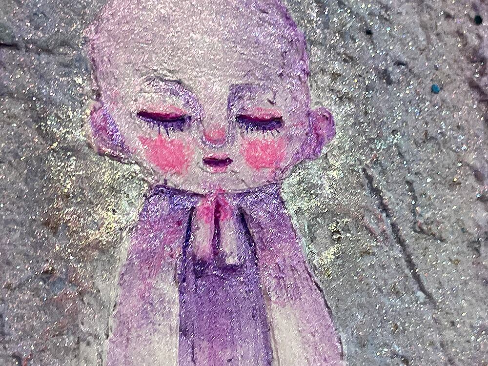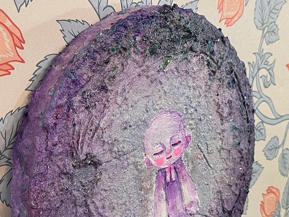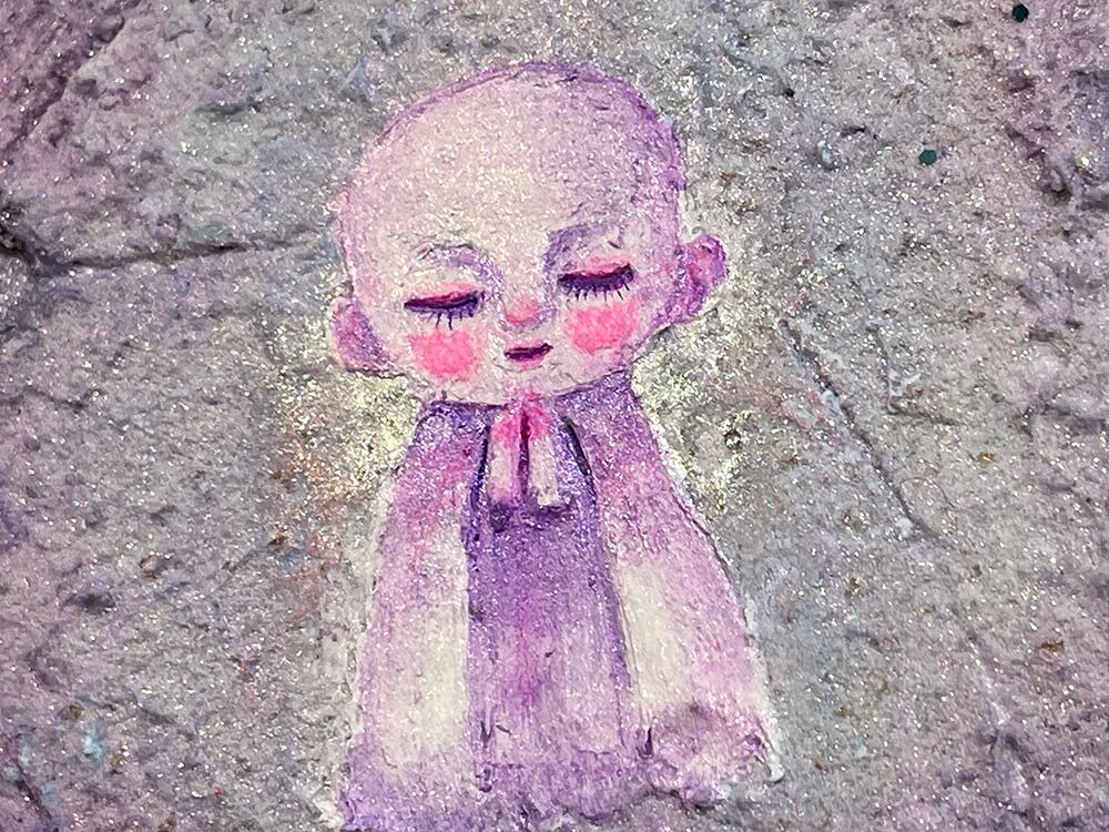 新月の日にライブ配信にて描いた思い出深い作品。円形キャンバスに描いたお月様に小さなお地蔵様を描きました。砂の入ったモデリングペーストでお月様をリアルに表現してみました。光の当たり方でテクスチャのイメージやラメの光、変更色の絵の具が変化して見えると思います。