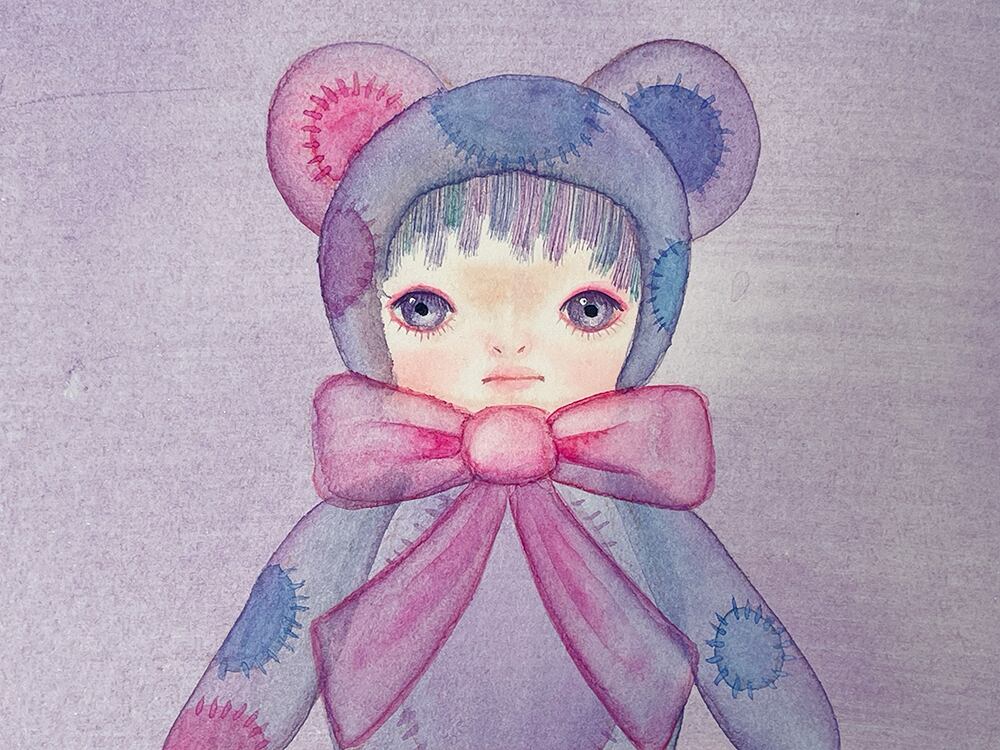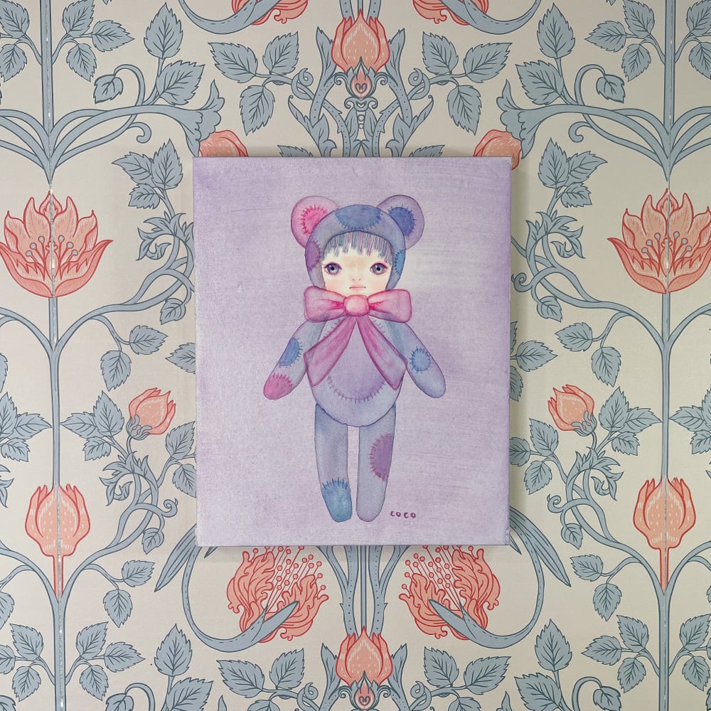 YouTube生ライブ配信で描いた着ぐるみの人物作品です。透明水彩で描かれておりアクリルとはまた違った透明感をお楽しみください。また、この作品には同じく水彩画のcocoくま作品と蝶をモチーフとした作品をお付けしています。今回、プレゼントとして額をお付けしてお届けします。お手元に届きましたら、アクリル板の裏と表のビニール剥がしてお飾りください。