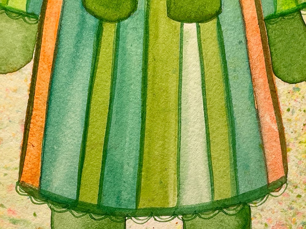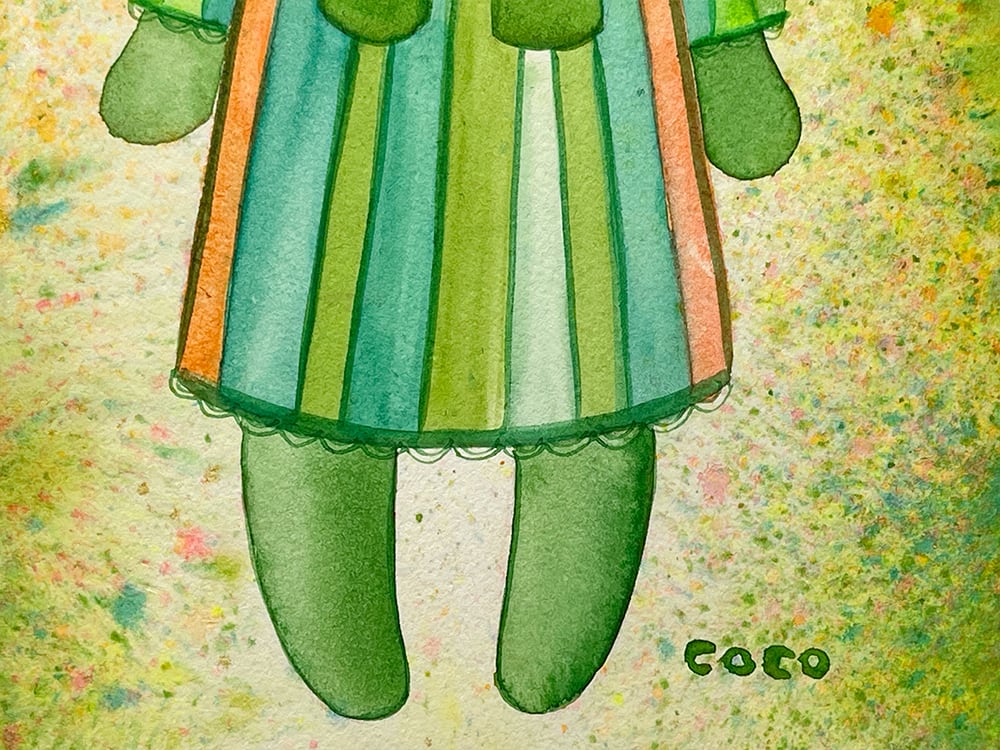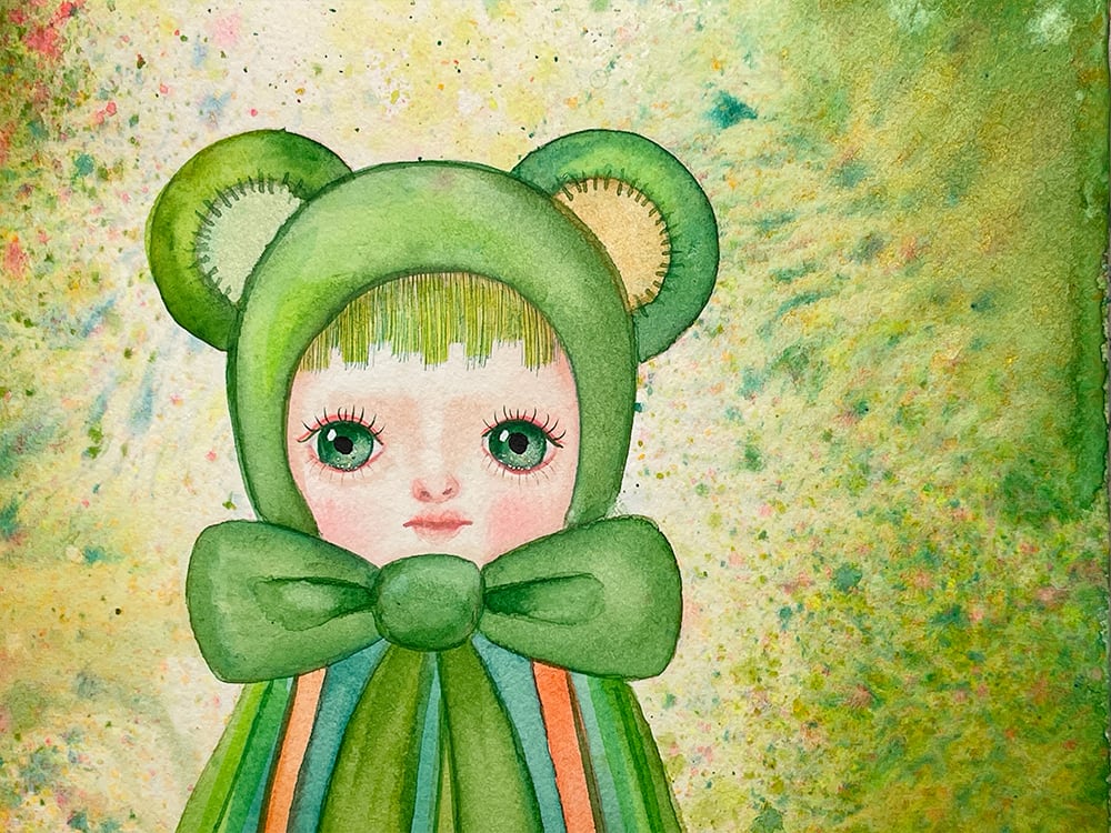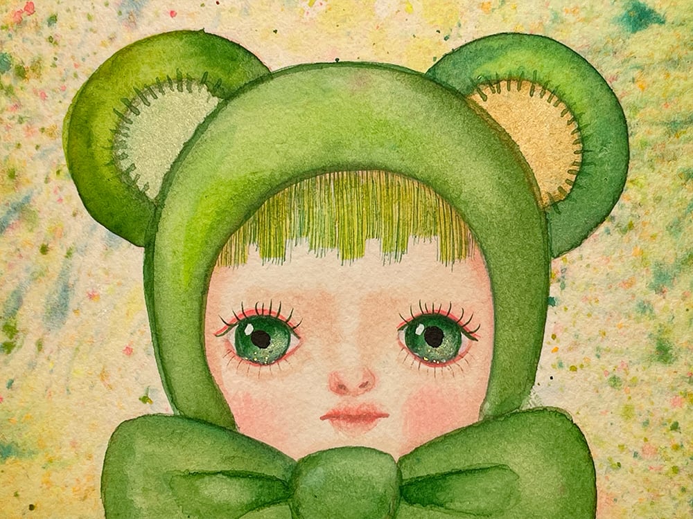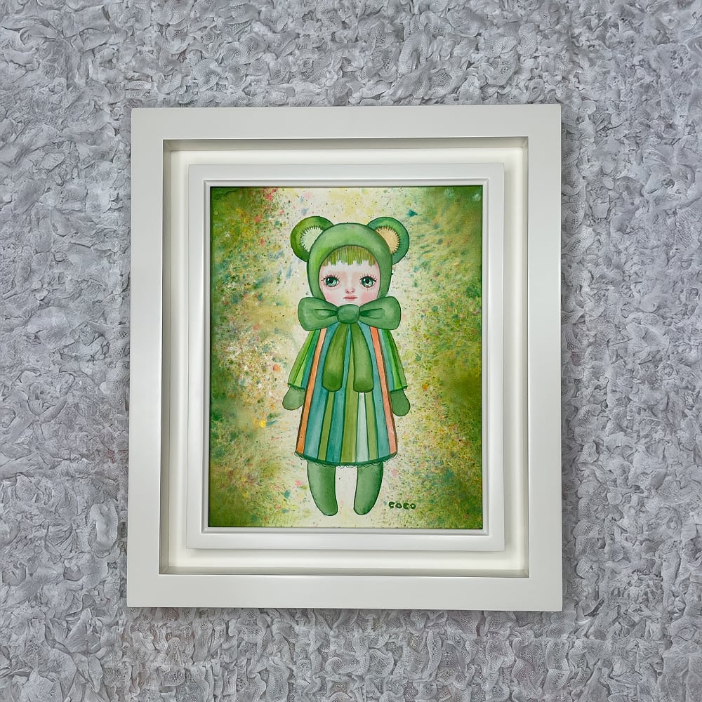 YouTube生ライブ配信で描いた着ぐるみの人物作品です。透明水彩で描かれておりアクリルとはまた違った透明感をお楽しみください。また、この作品には同じく水彩画のcocoくま作品と蝶をモチーフとした作品をお付けしています。今回、プレゼントとして額をお付けしてお届けします。お手元に届きましたら、アクリル板の裏と表のビニール剥がしてお飾りください。