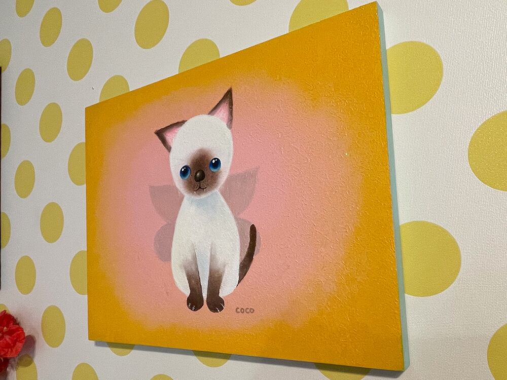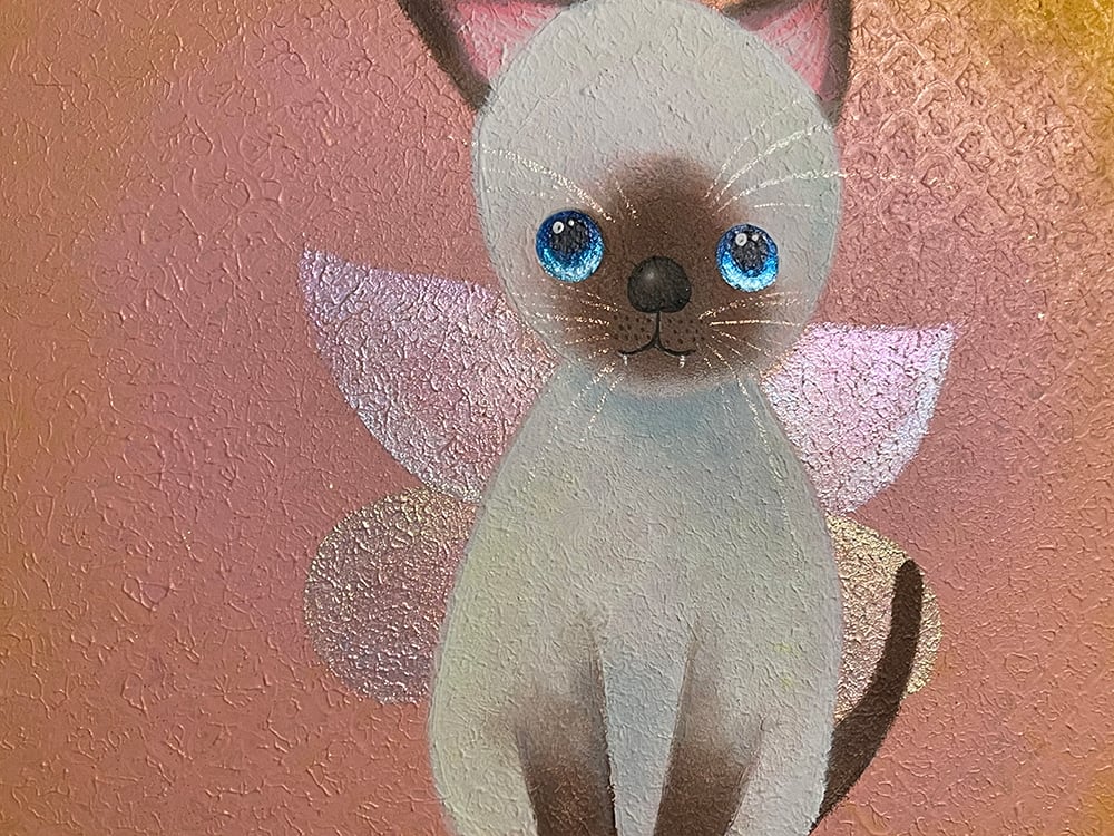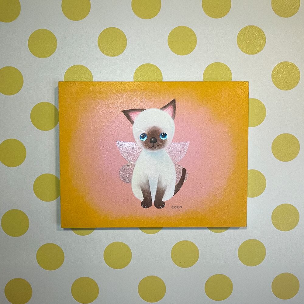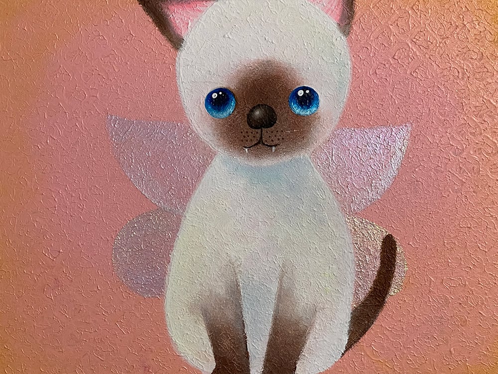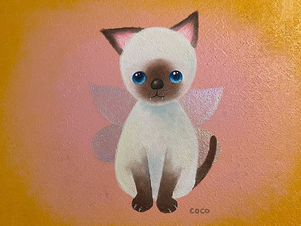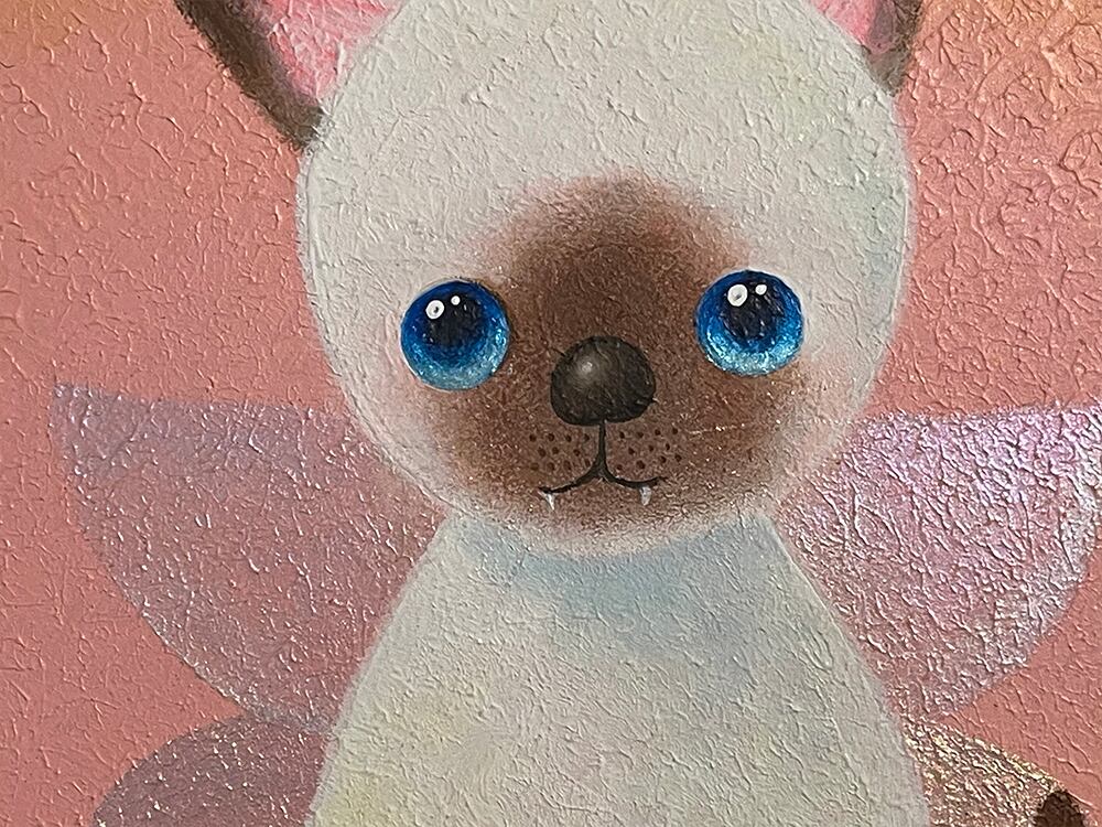 猫の爪を抜く人がいるという話を聞いて断固反対の思いでYouTube生ライブ配信で描いた猫の作品です。初めて描いたシャム猫で、なぜかオーロラの蝶の羽が付いている不思議な作品です。