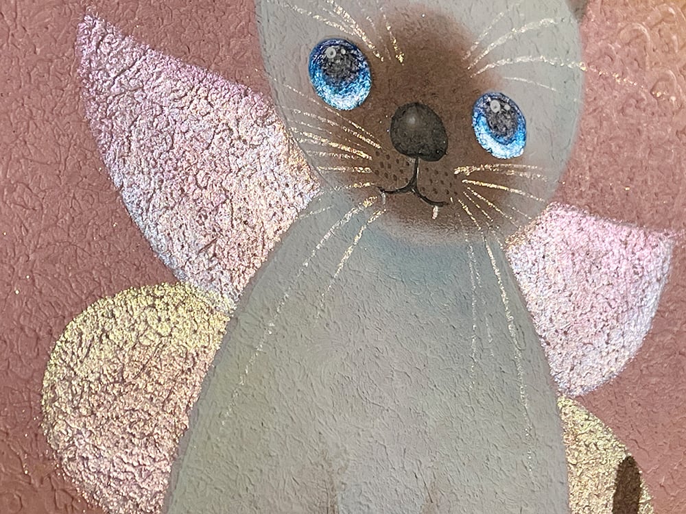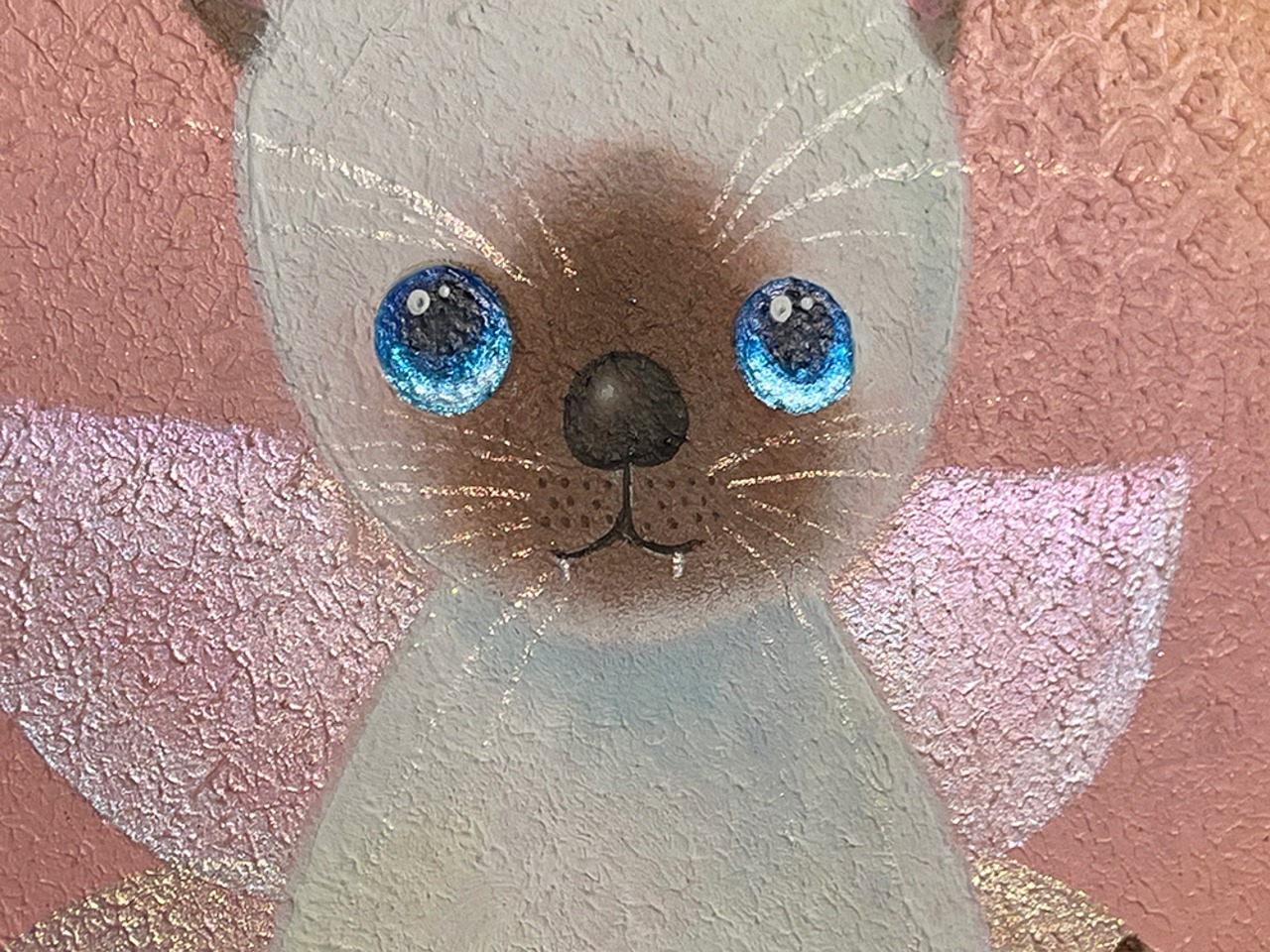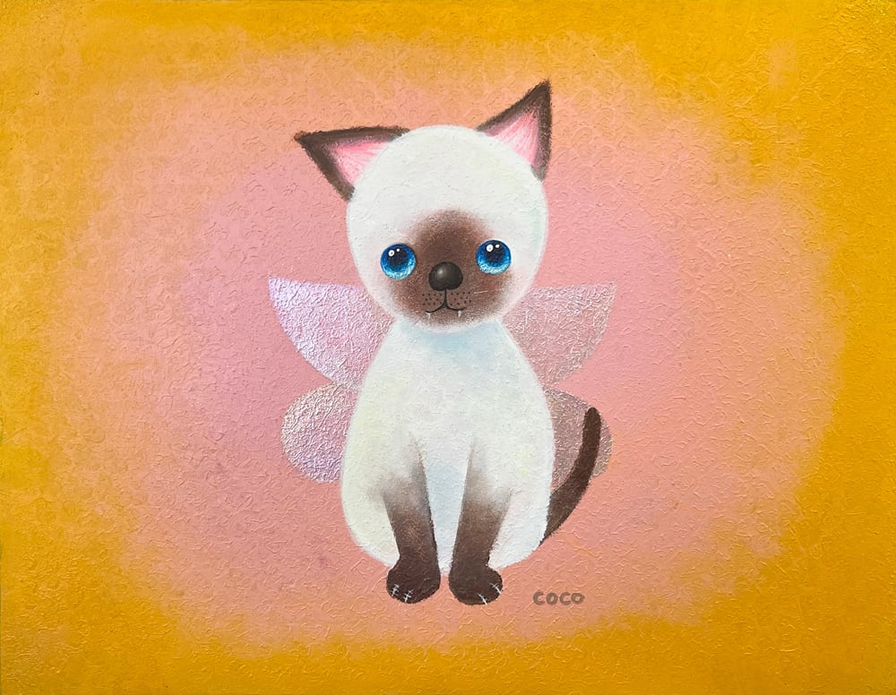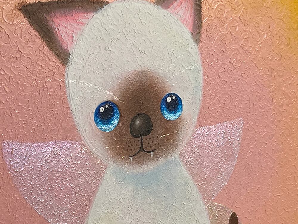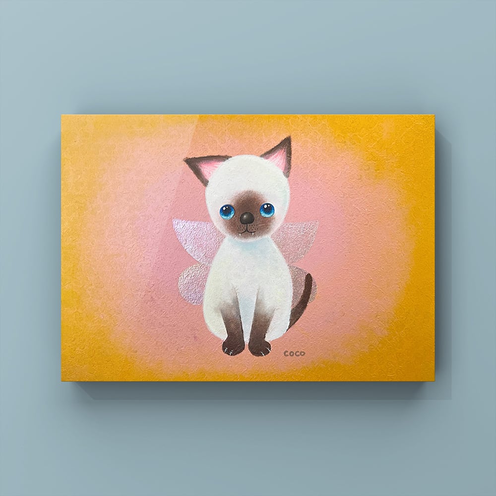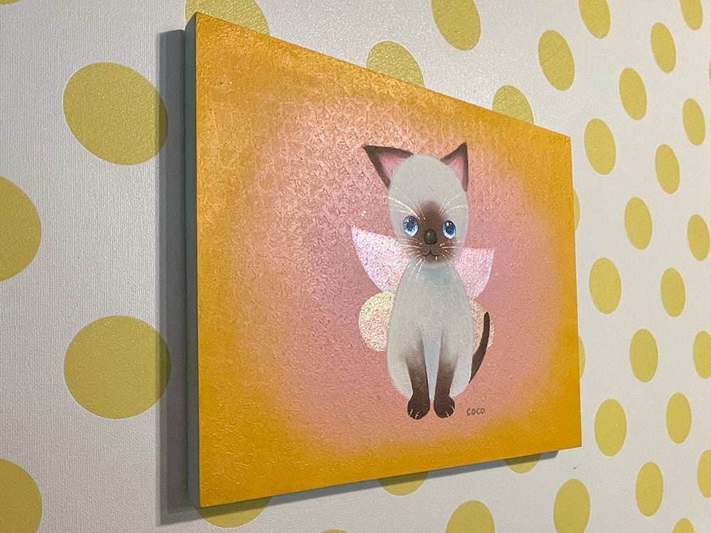 猫の爪を抜く人がいるという話を聞いて断固反対の思いでYouTube生ライブ配信で描いた猫の作品です。初めて描いたシャム猫で、なぜかオーロラの蝶の羽が付いている不思議な作品です。