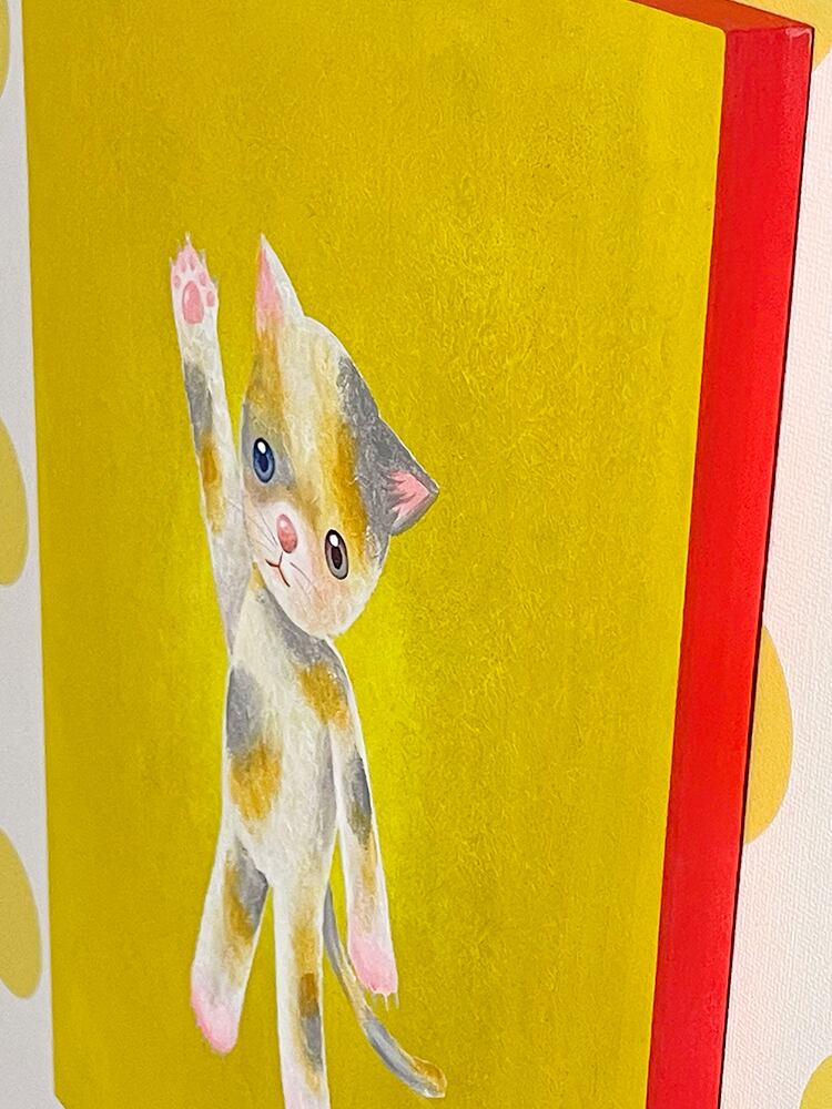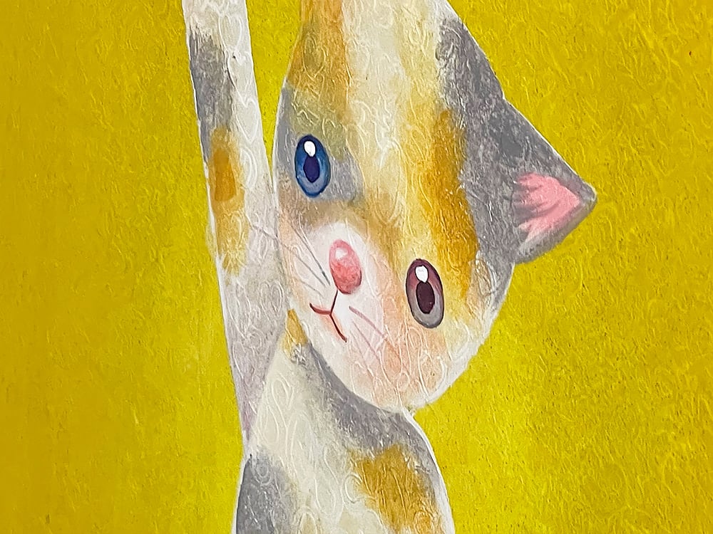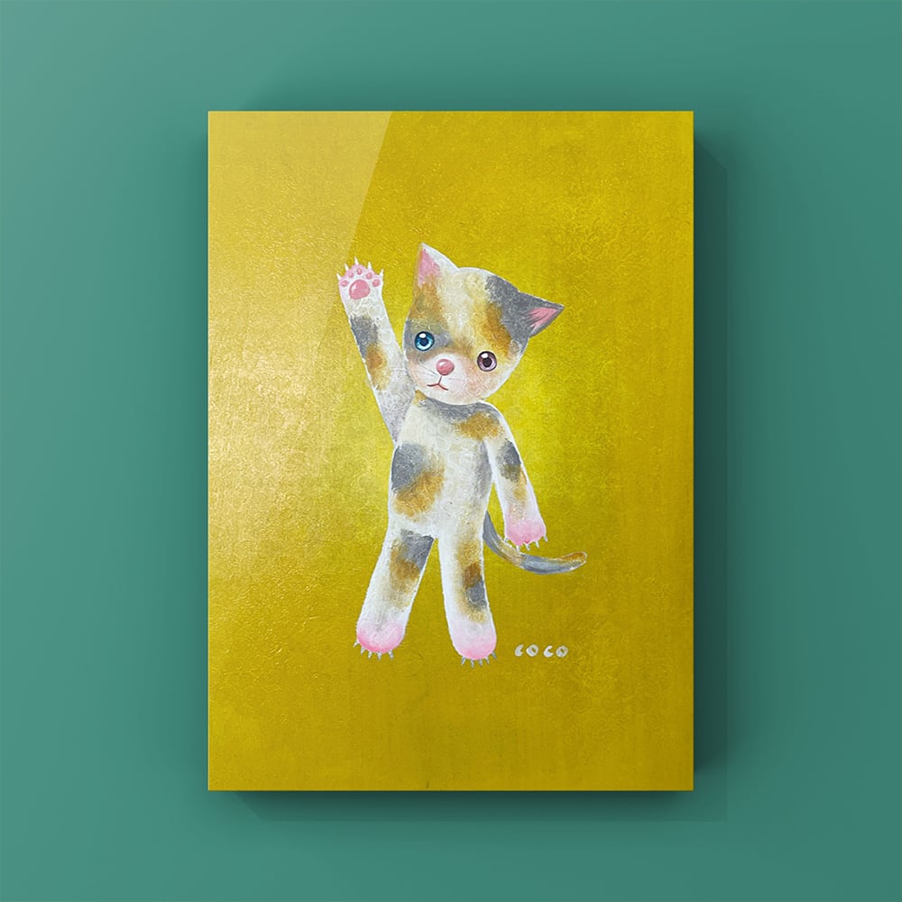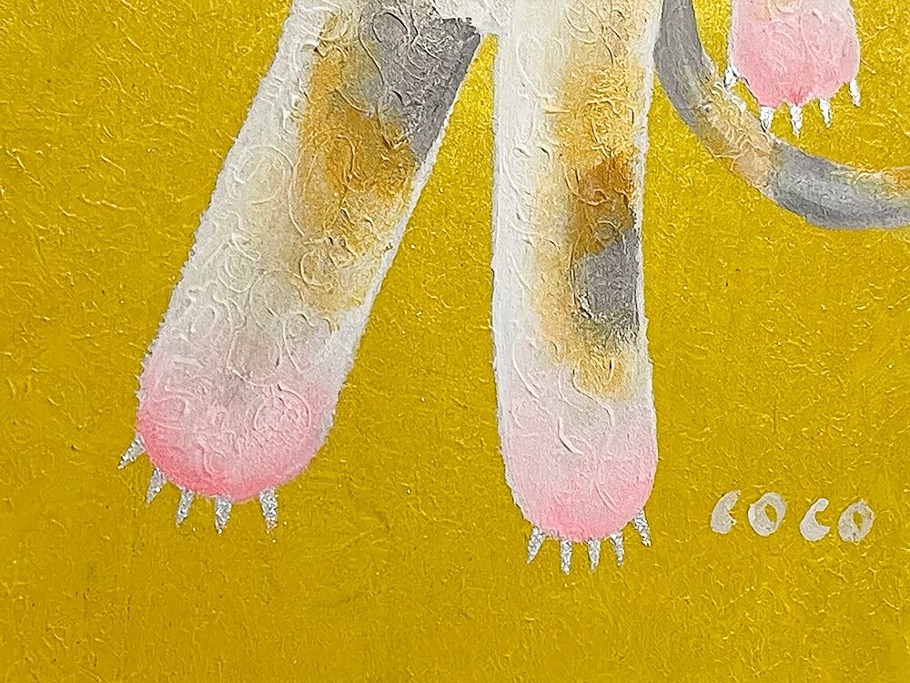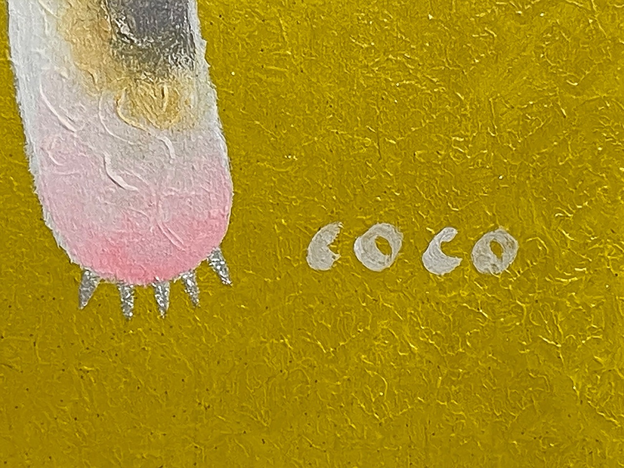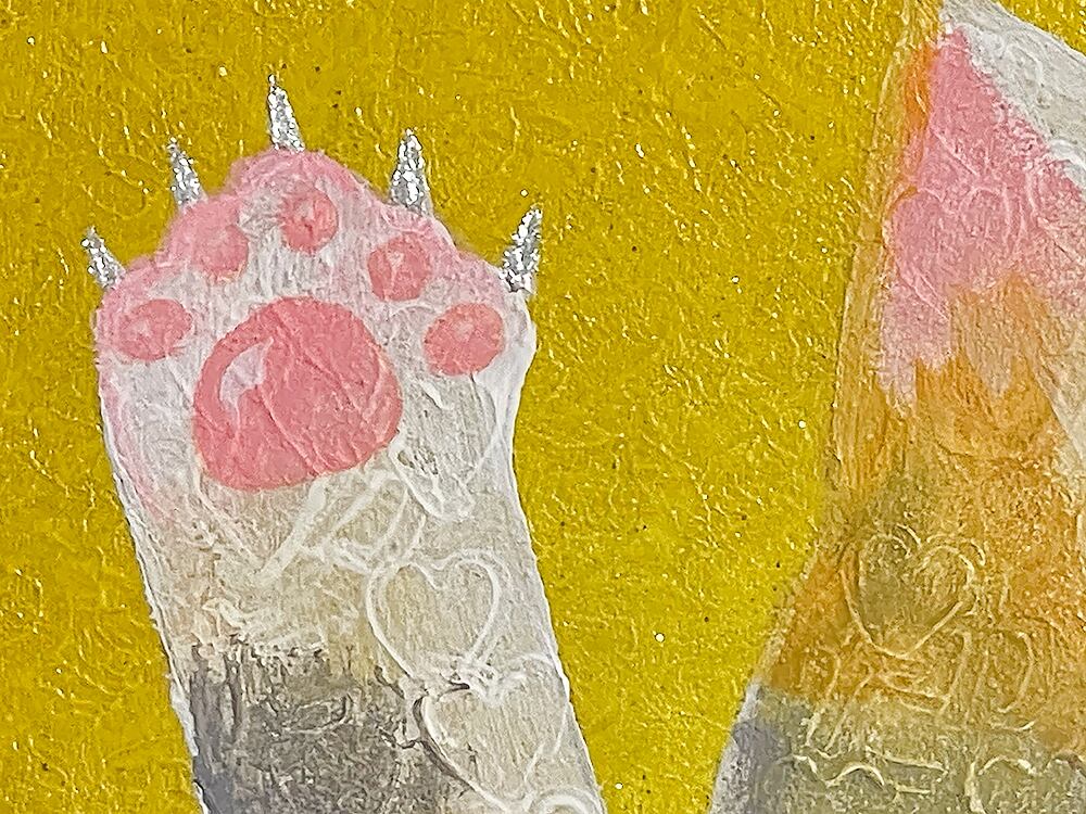 猫の爪を抜く人がいるという話を聞いて断固反対の思いでYouTube生ライブ配信で描いた猫の作品です。初めて描いた三毛猫です。大切な宝物である爪を高々と挙げ、抜かないでねというメッセージが込められていますが、手を伸ばして何かを掴み取ろうとするポーズにも見えます。