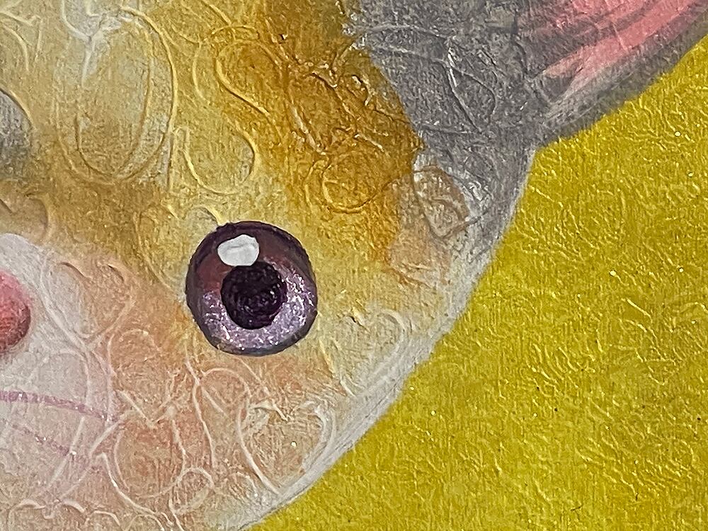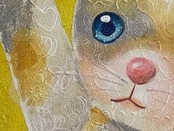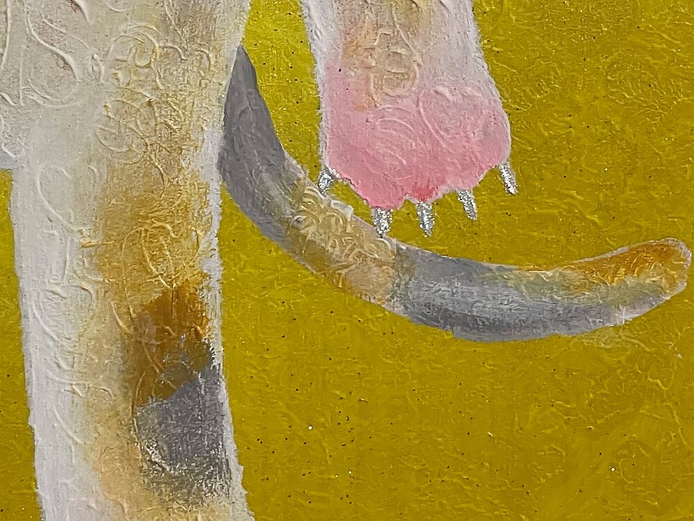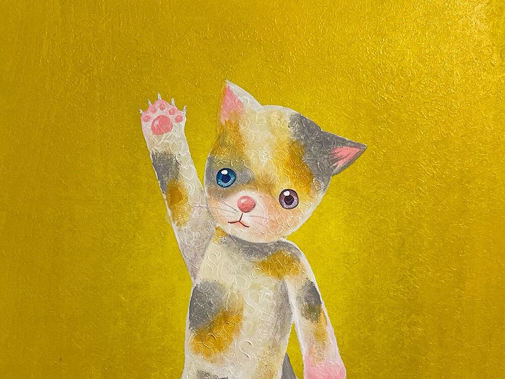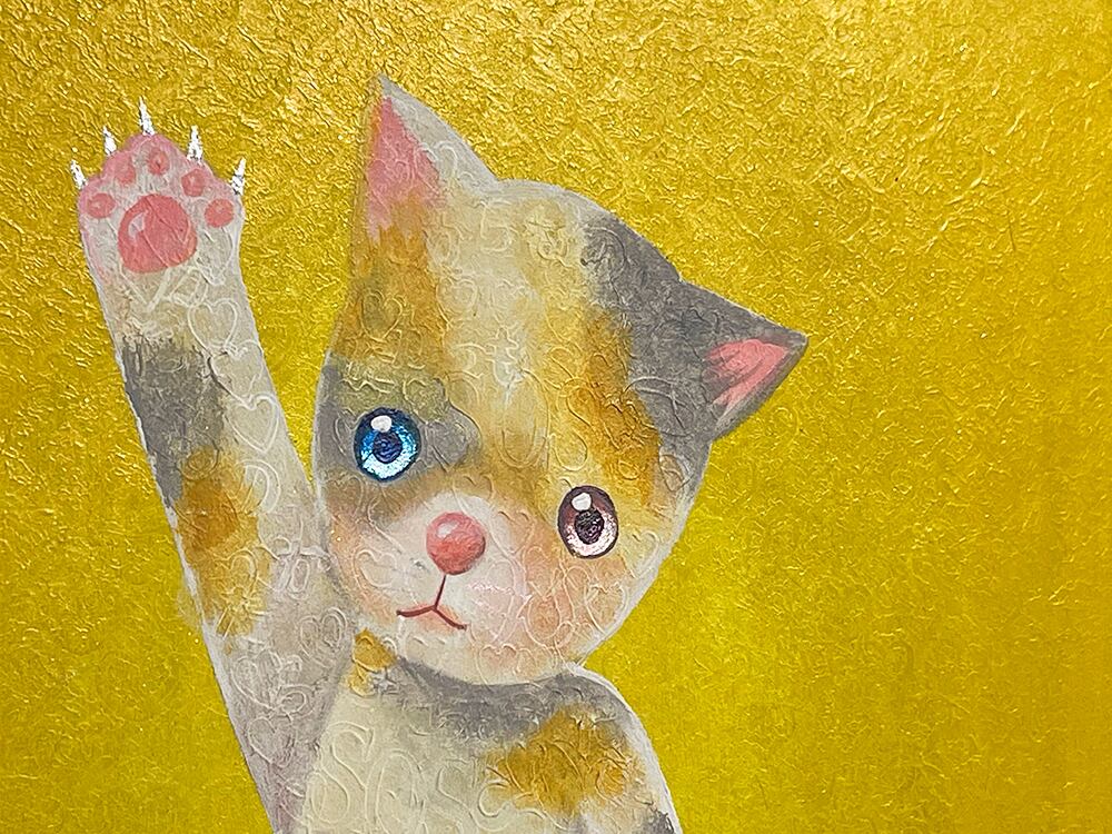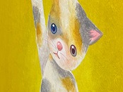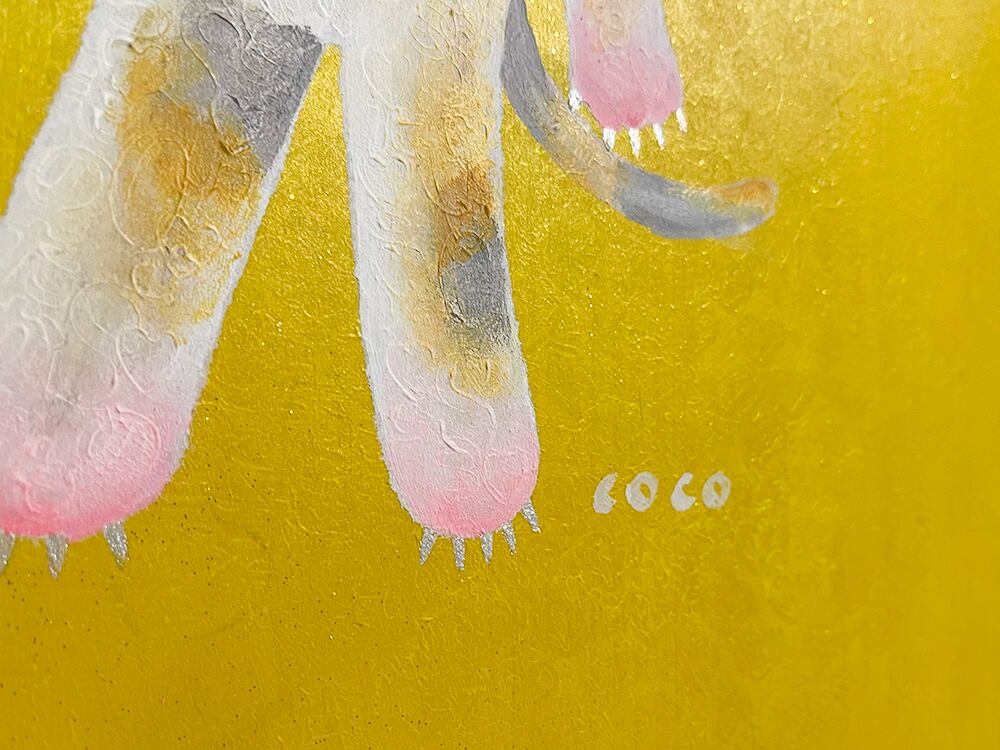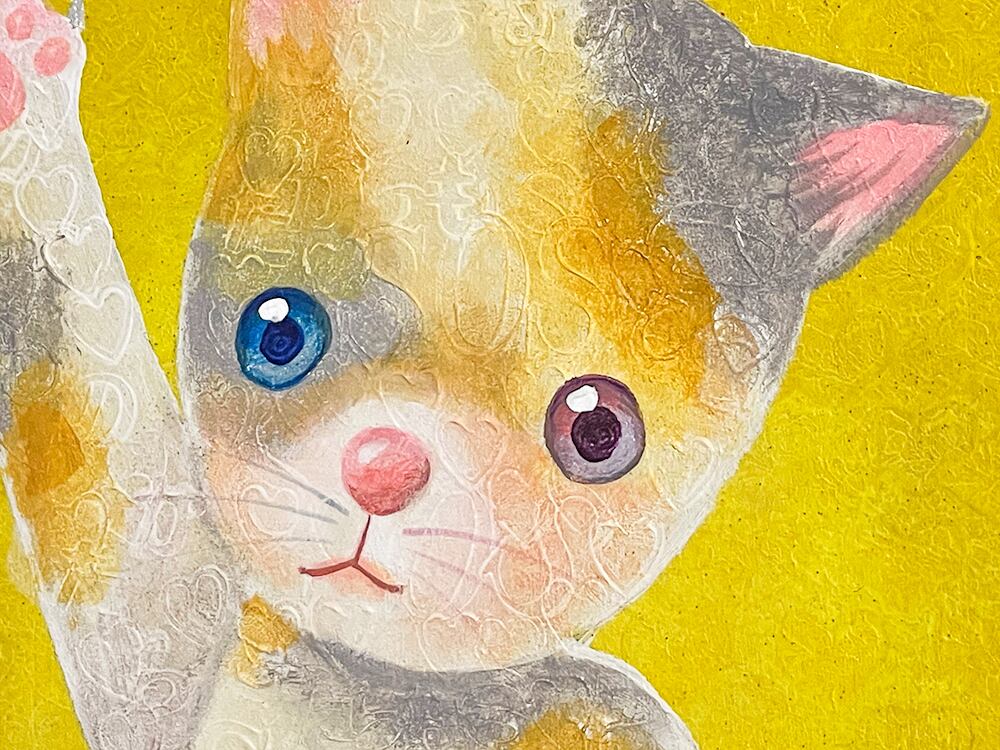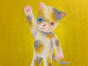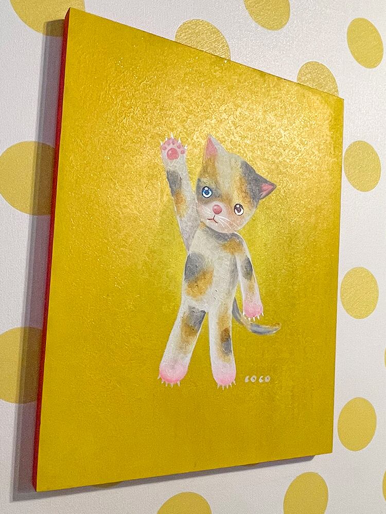 猫の爪を抜く人がいるという話を聞いて断固反対の思いでYouTube生ライブ配信で描いた猫の作品です。初めて描いた三毛猫です。大切な宝物である爪を高々と挙げ、抜かないでねというメッセージが込められていますが、手を伸ばして何かを掴み取ろうとするポーズにも見えます。