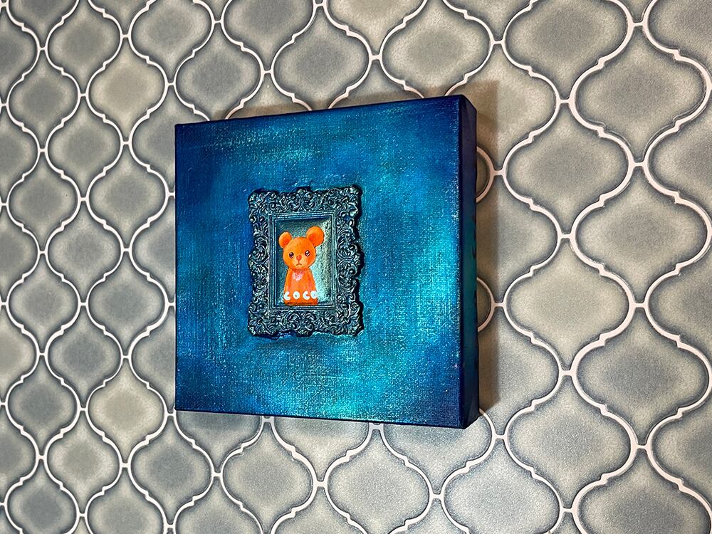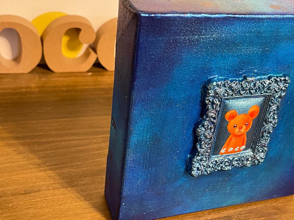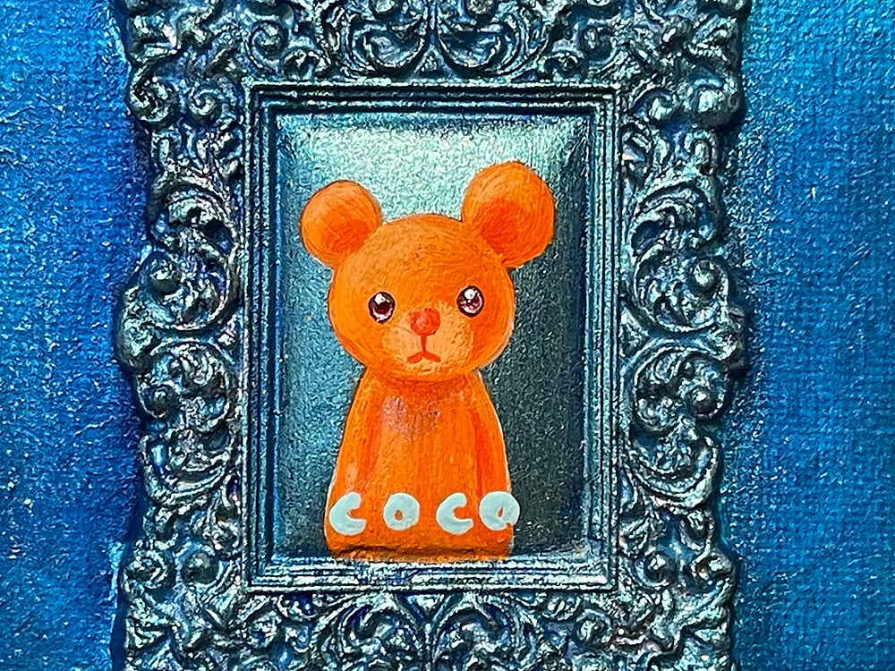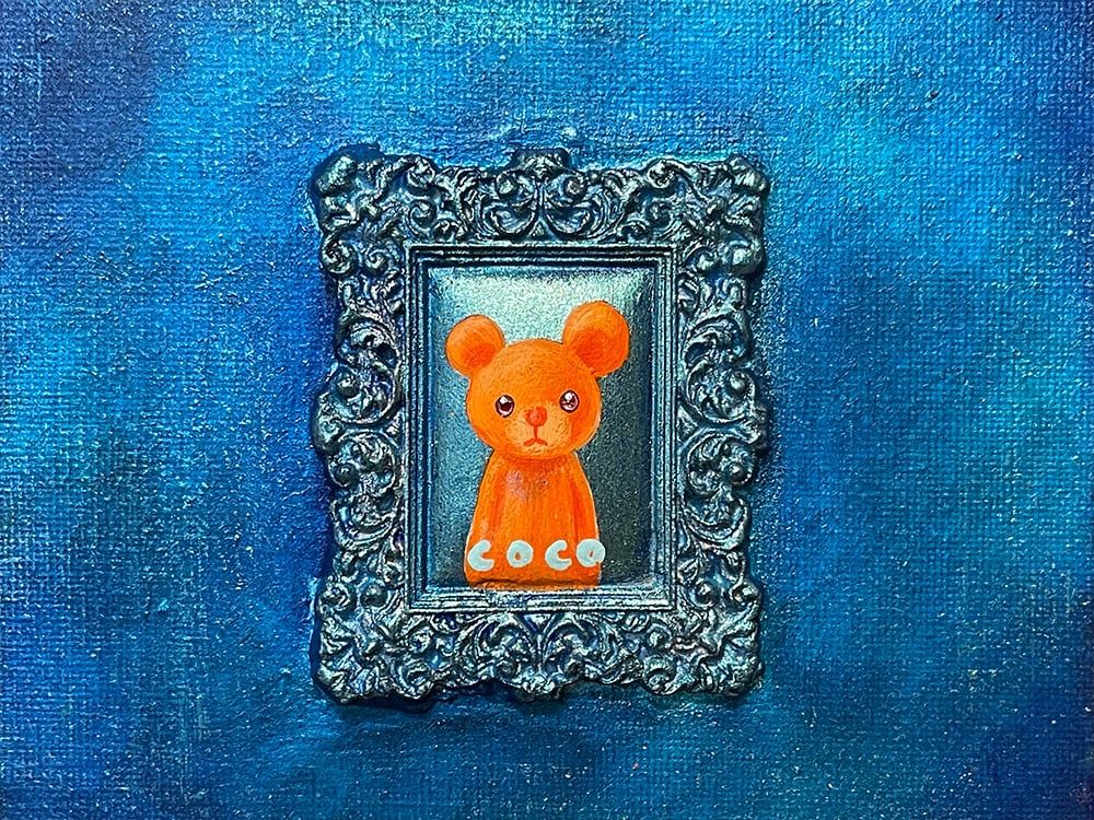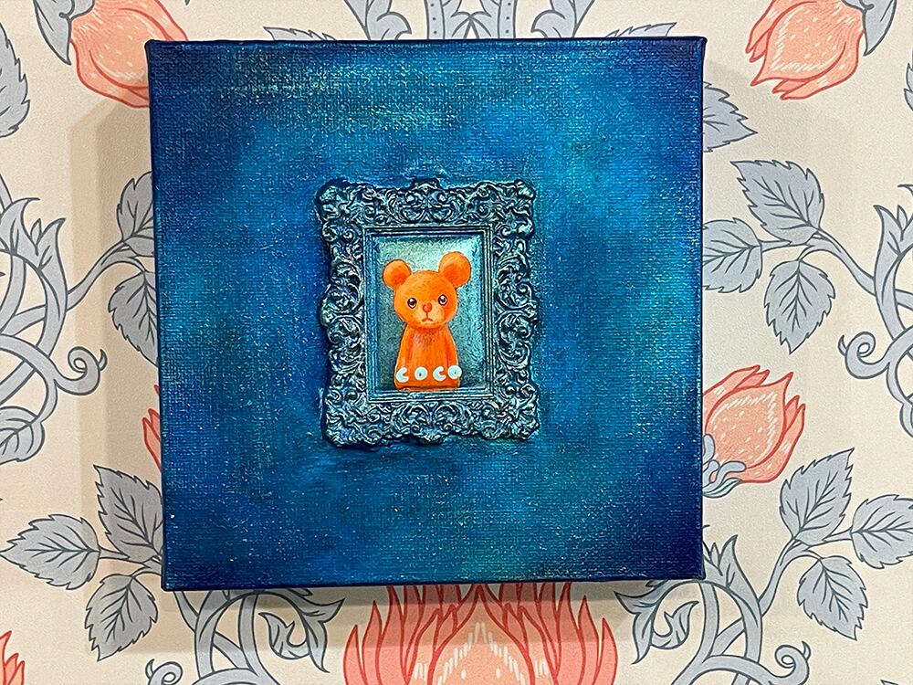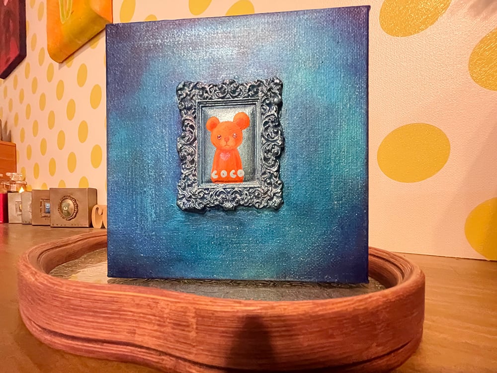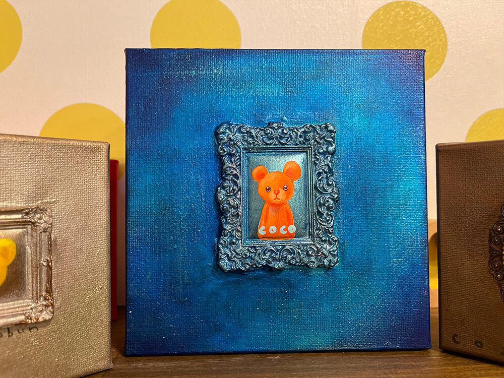 YouTube生ライブ配信で描いた作品です。粘土で作ったアンティーク風のミニチュア学に描かれたcocoくまが描かれた作品。壁に飾るのはもちろん、厚みがあるのでキャビネットやコレクションケースに置いた状態で飾ることができる3Dキャンバスに描かれた作品です。