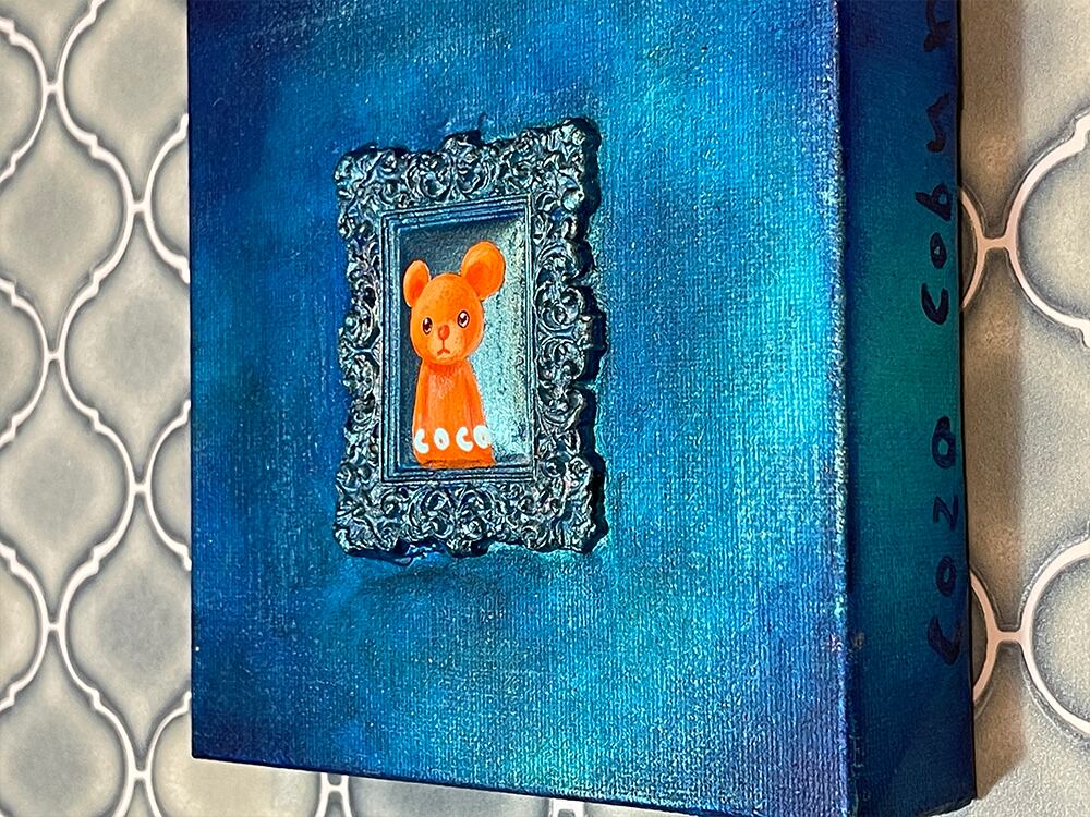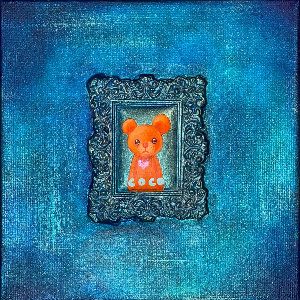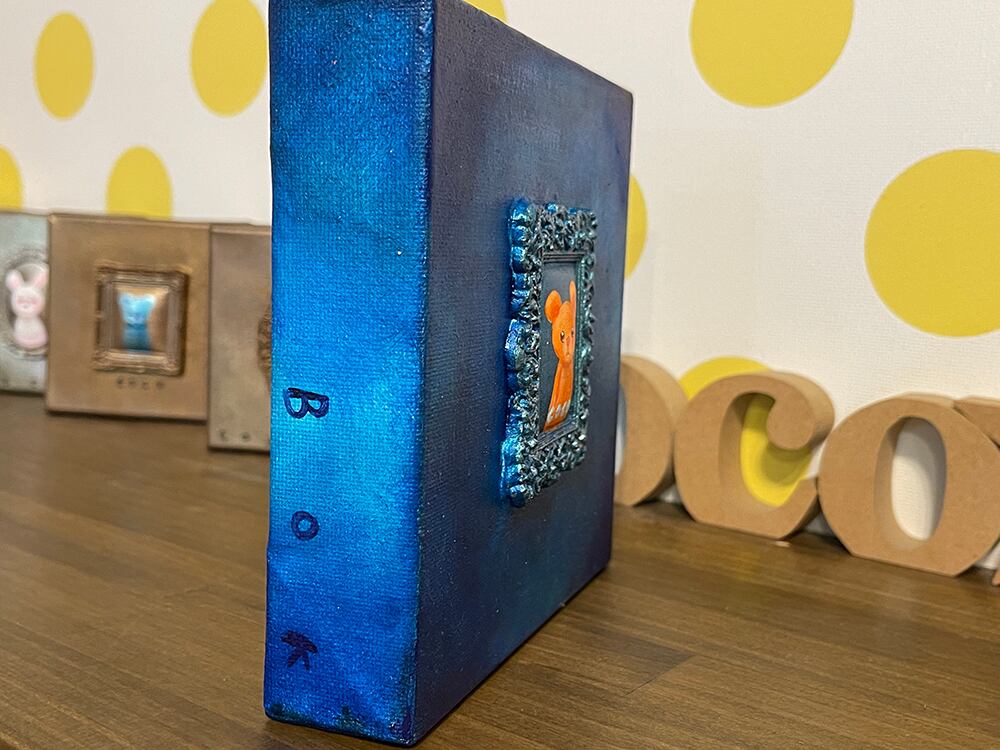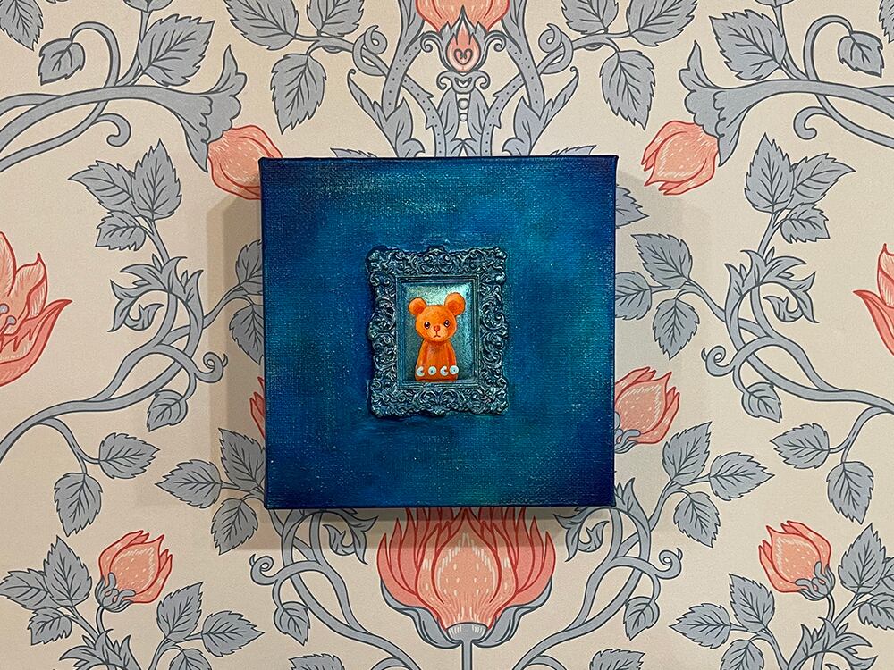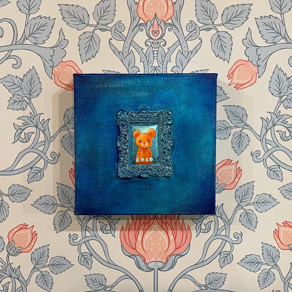 YouTube生ライブ配信で描いた作品です。粘土で作ったアンティーク風のミニチュア学に描かれたcocoくまが描かれた作品。壁に飾るのはもちろん、厚みがあるのでキャビネットやコレクションケースに置いた状態で飾ることができる3Dキャンバスに描かれた作品です。