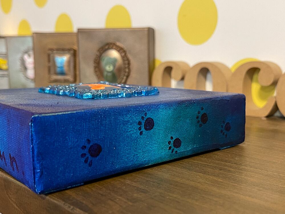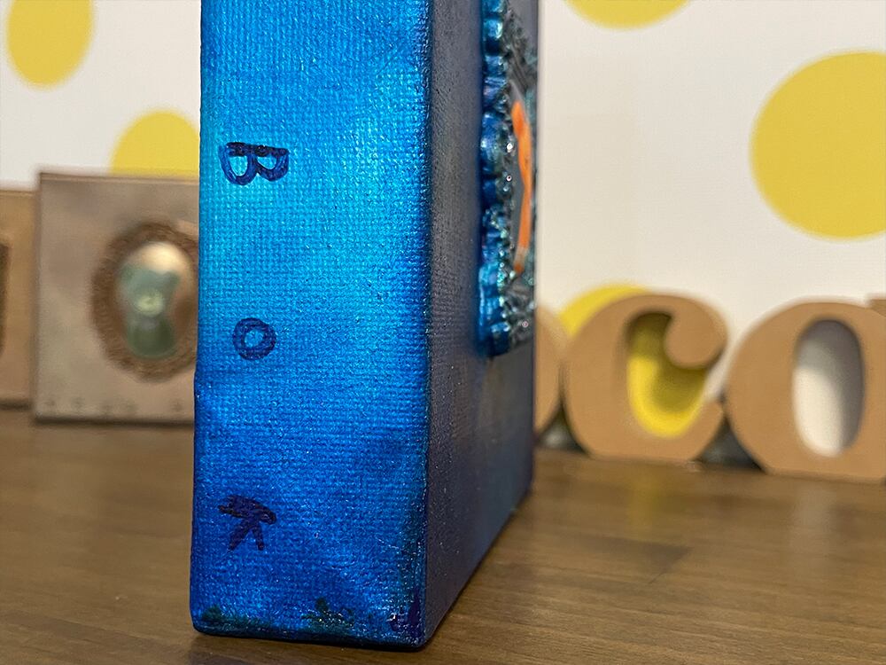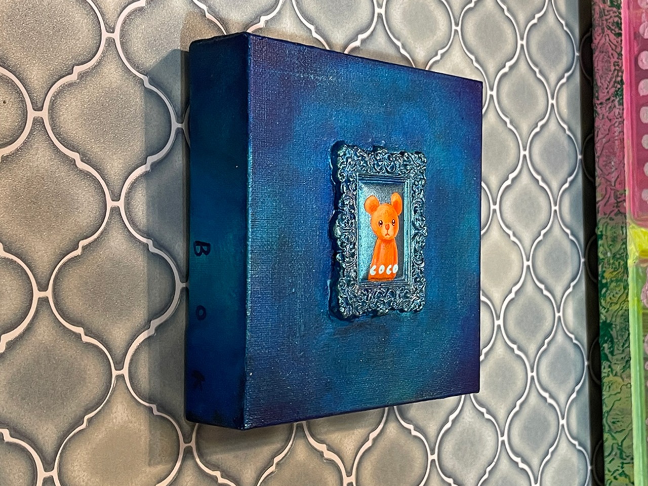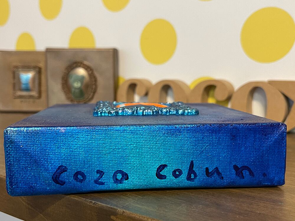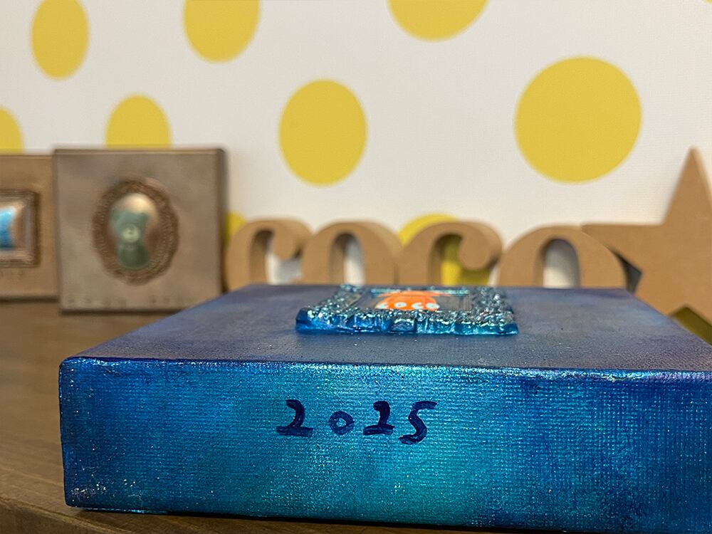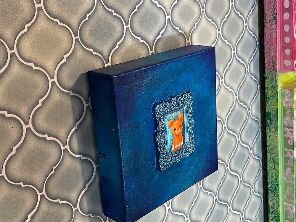 YouTube生ライブ配信で描いた作品です。粘土で作ったアンティーク風のミニチュア学に描かれたcocoくまが描かれた作品。壁に飾るのはもちろん、厚みがあるのでキャビネットやコレクションケースに置いた状態で飾ることができる3Dキャンバスに描かれた作品です。