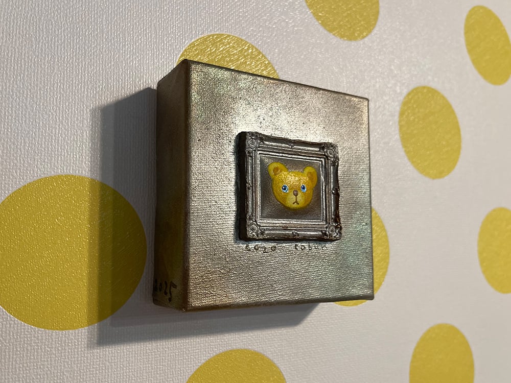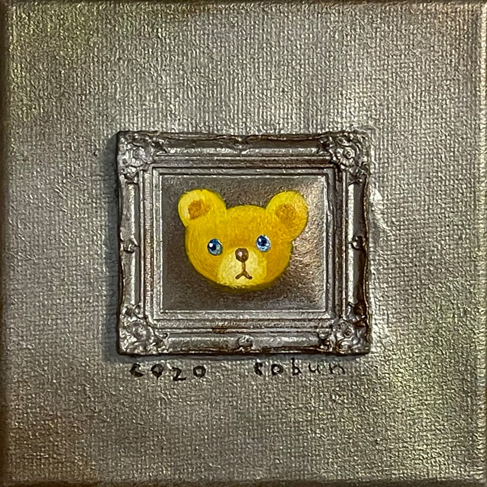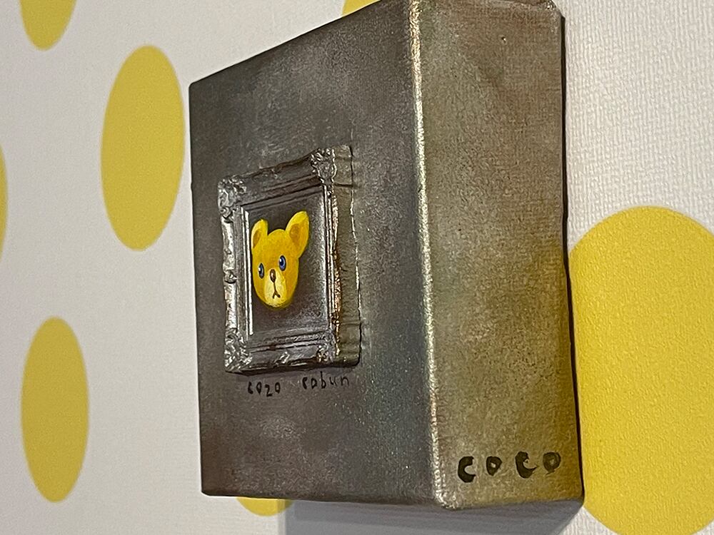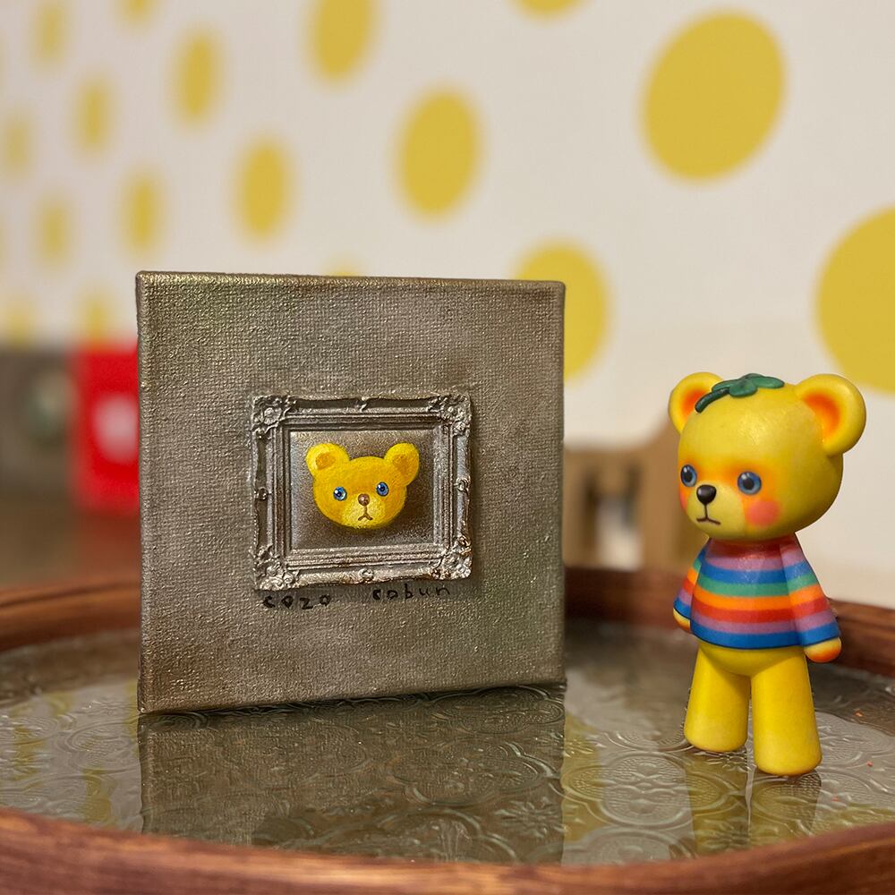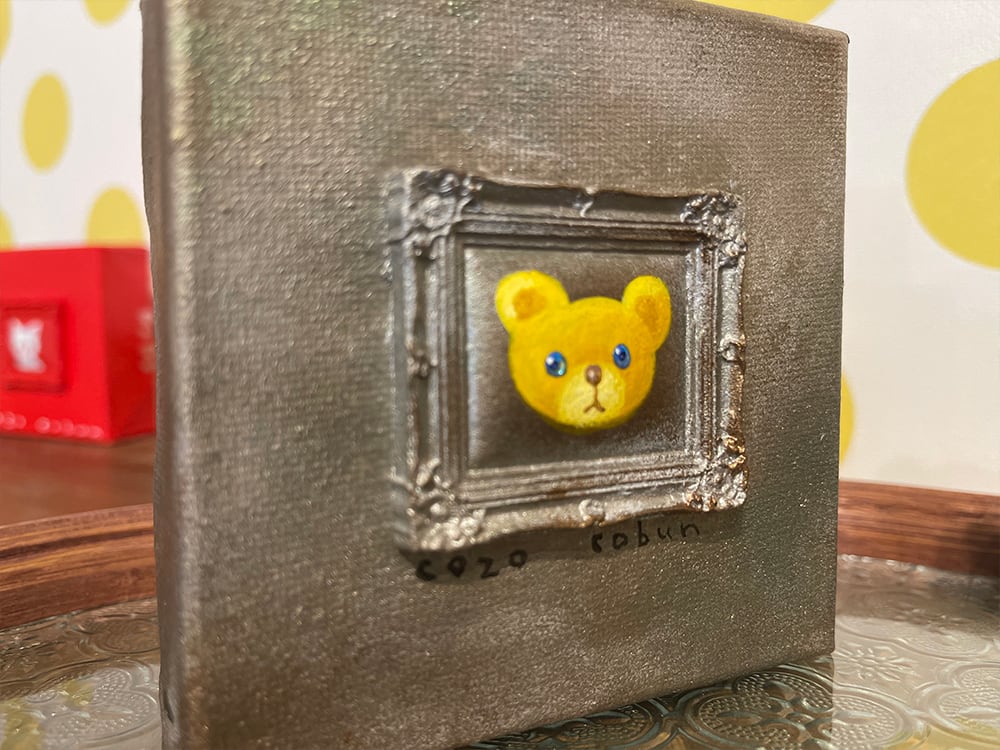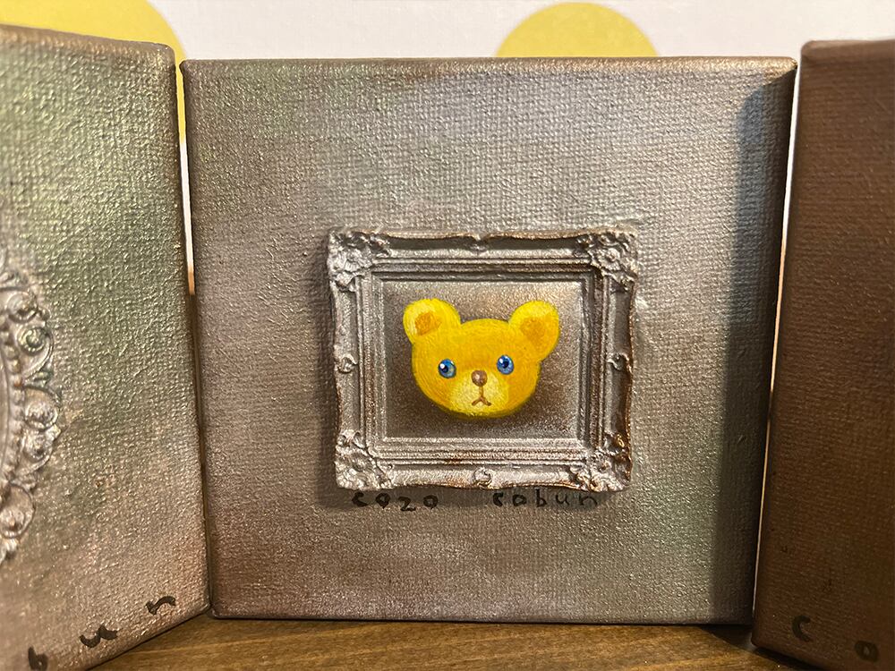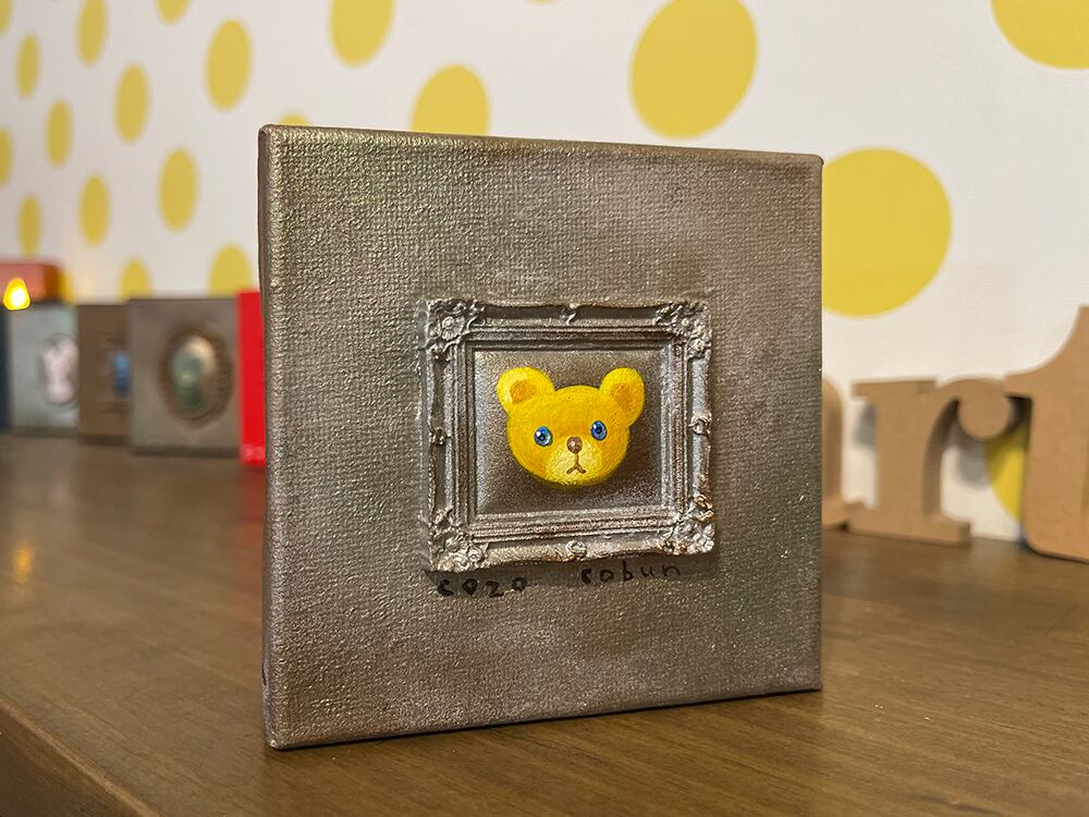 YouTube生ライブ配信で描いた作品です。粘土で作ったアンティーク風のミニチュア学に描かれたcocoくまが描かれた作品。壁に飾るのはもちろん、厚みがあるのでキャビネットやコレクションケースに置いた状態で飾ることができる3Dキャンバスに描かれた作品です。