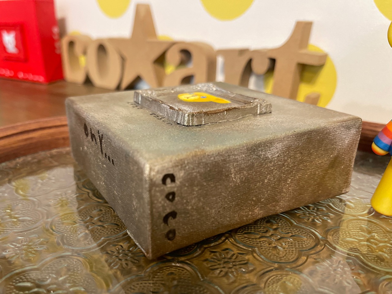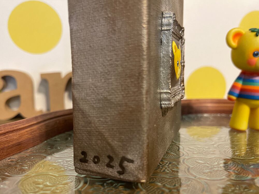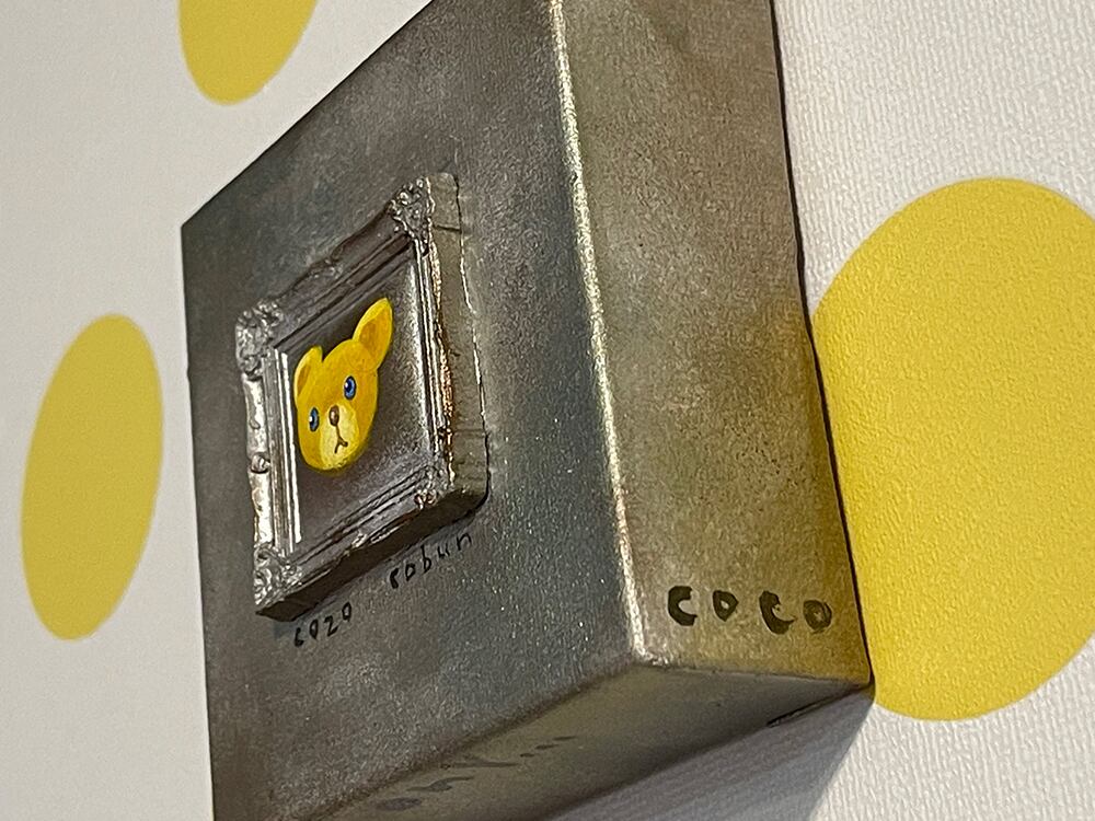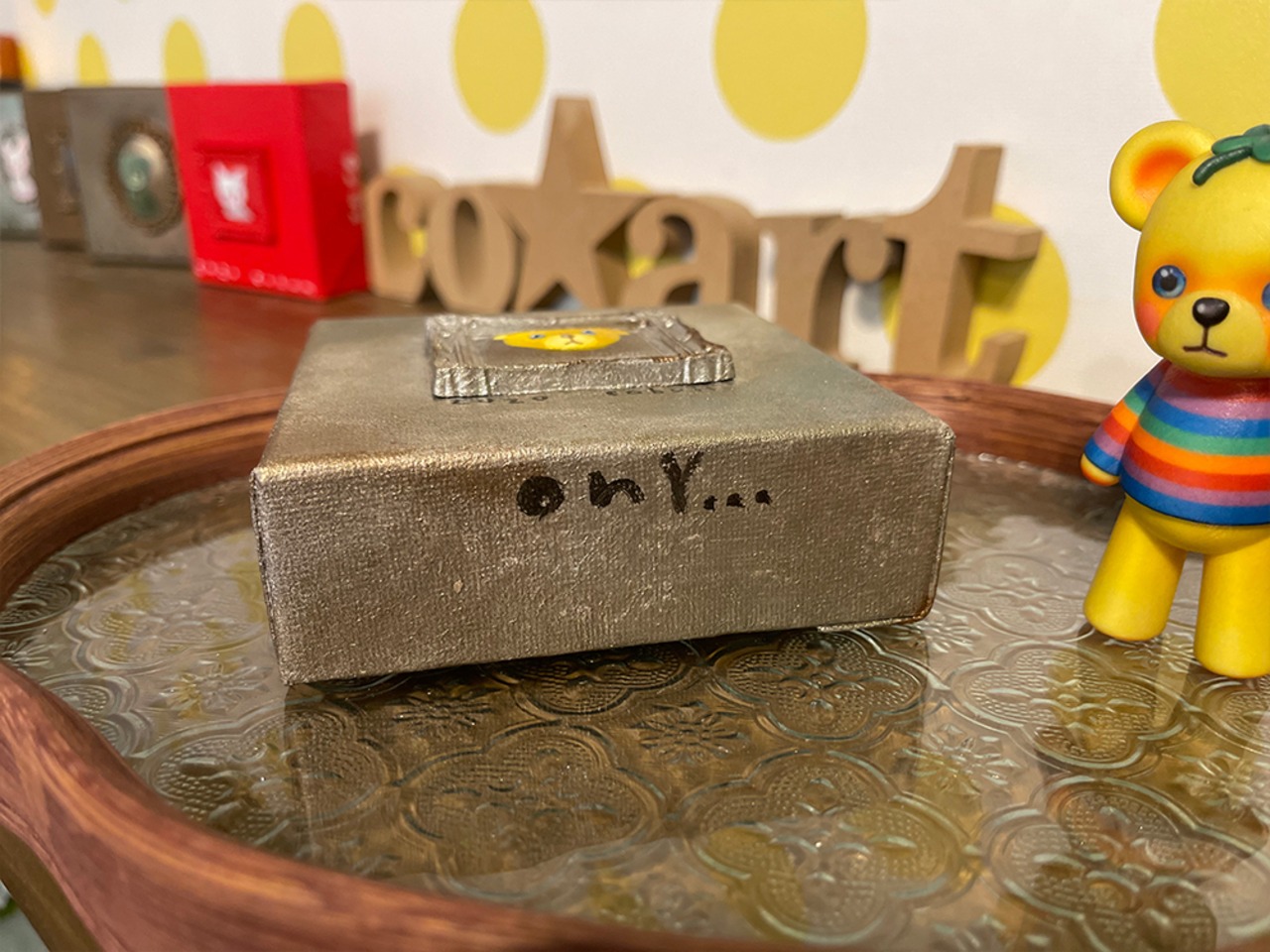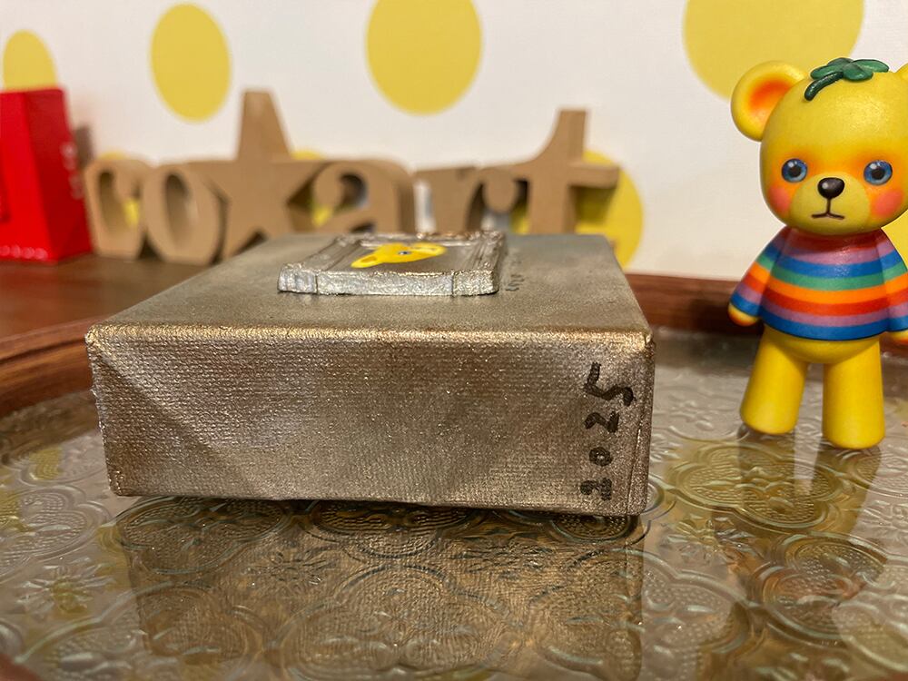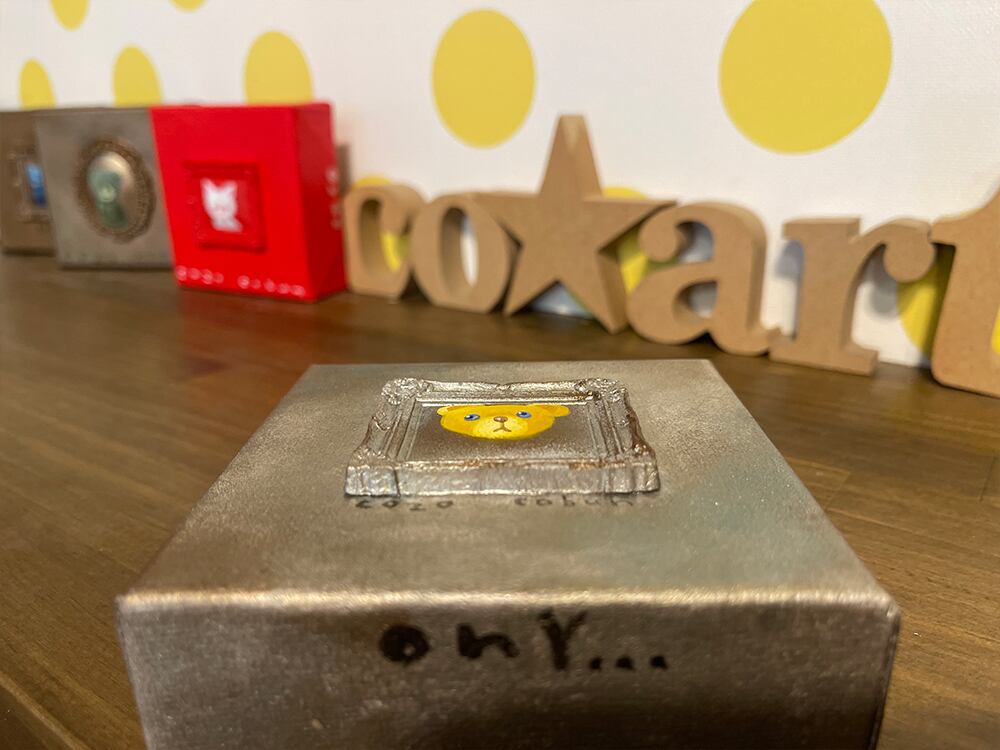 YouTube生ライブ配信で描いた作品です。粘土で作ったアンティーク風のミニチュア学に描かれたcocoくまが描かれた作品。壁に飾るのはもちろん、厚みがあるのでキャビネットやコレクションケースに置いた状態で飾ることができる3Dキャンバスに描かれた作品です。