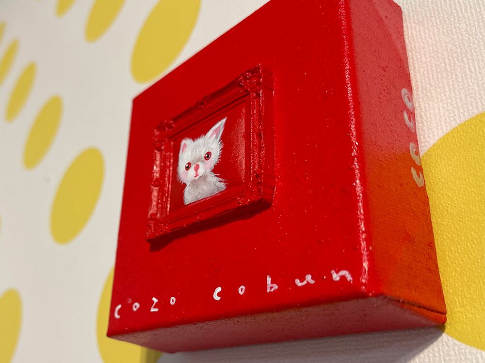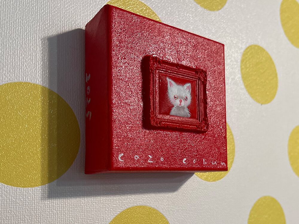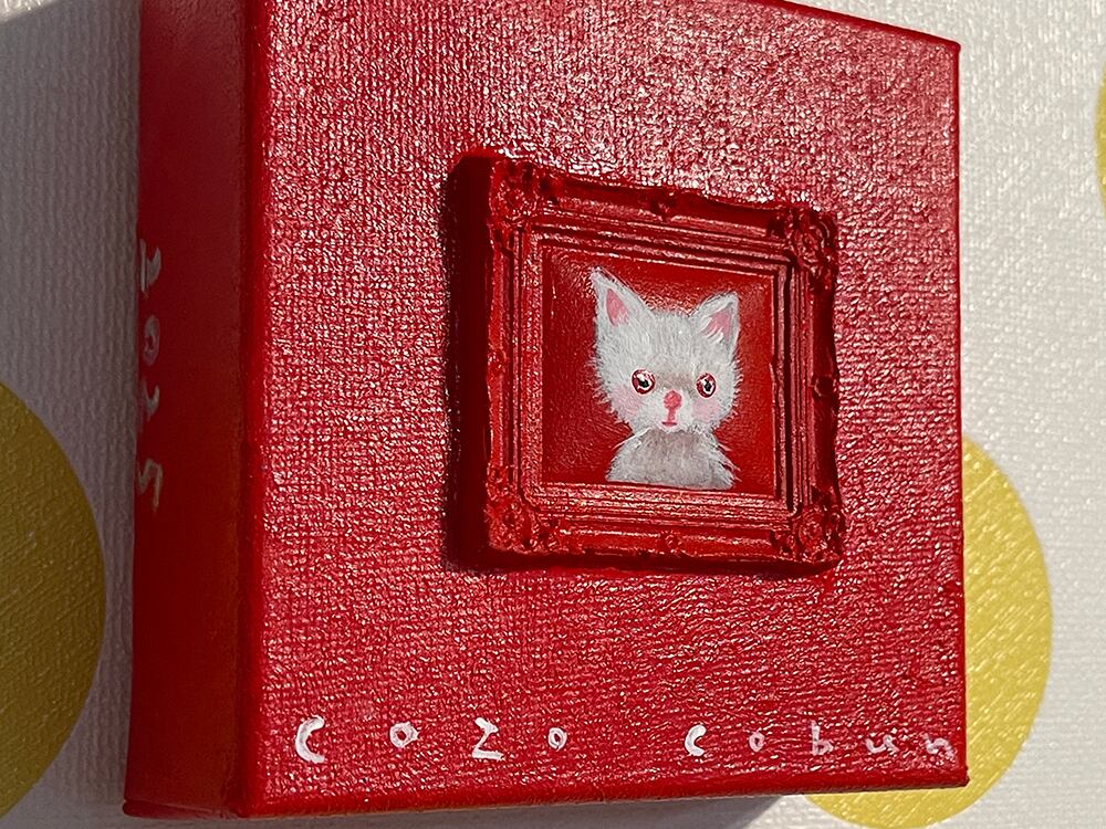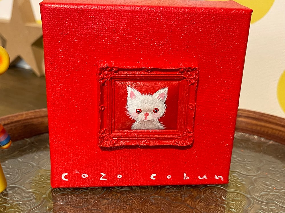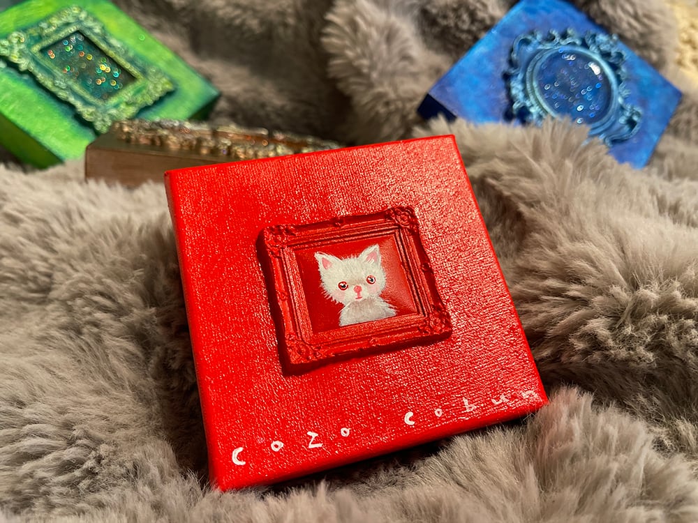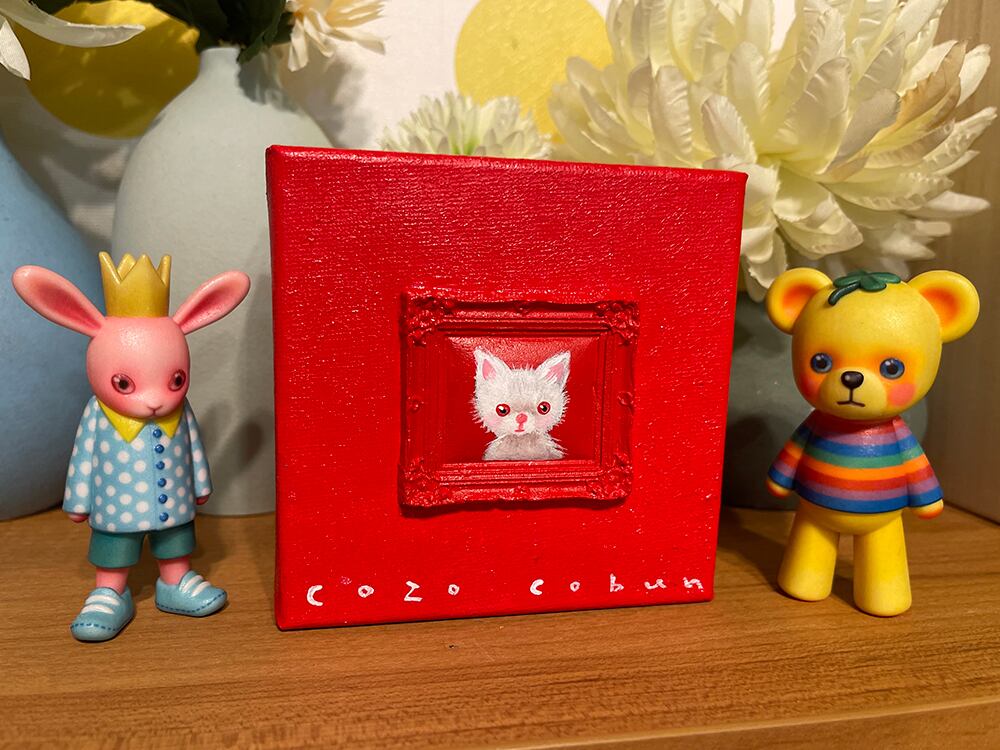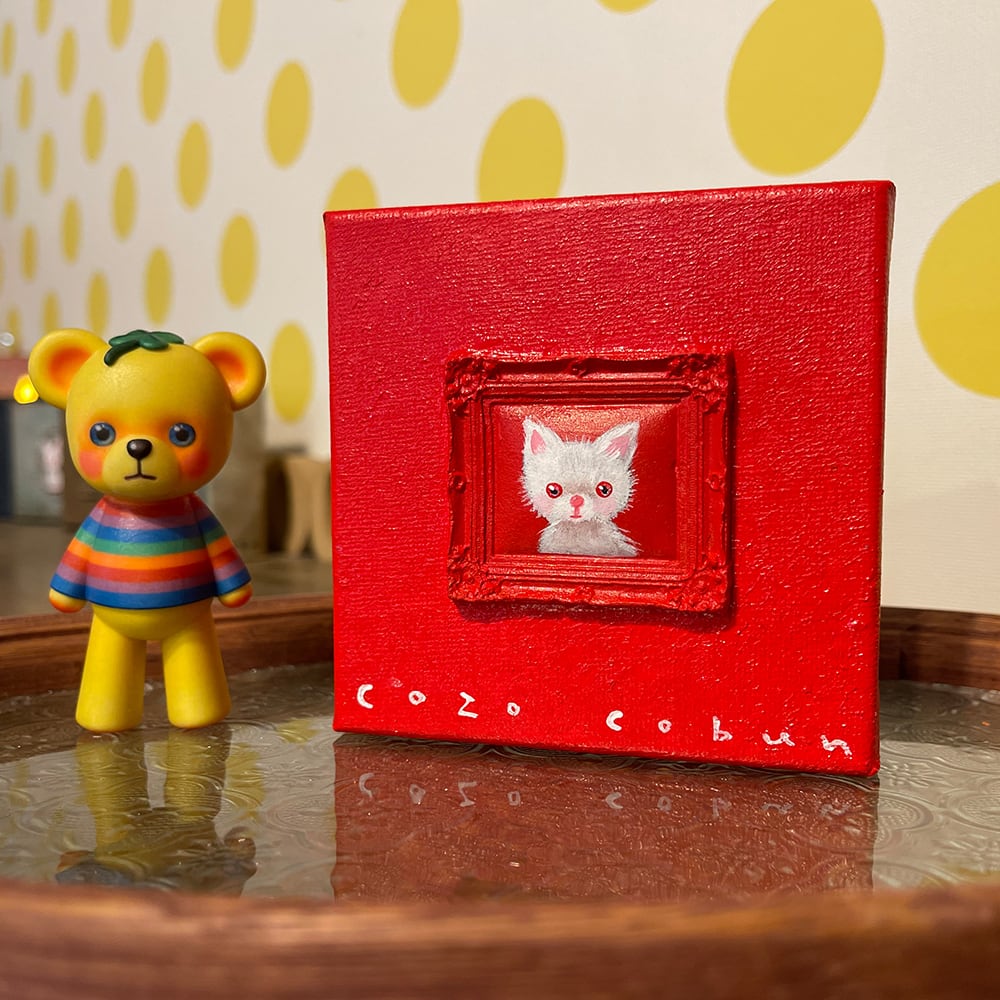 YouTube生ライブ配信で描いた作品です。粘土で作ったアンティーク風のミニチュア学に描かれたcocoくまが描かれた作品。壁に飾るのはもちろん、厚みがあるのでキャビネットやコレクションケースに置いた状態で飾ることができる3Dキャンバスに描かれた作品です。