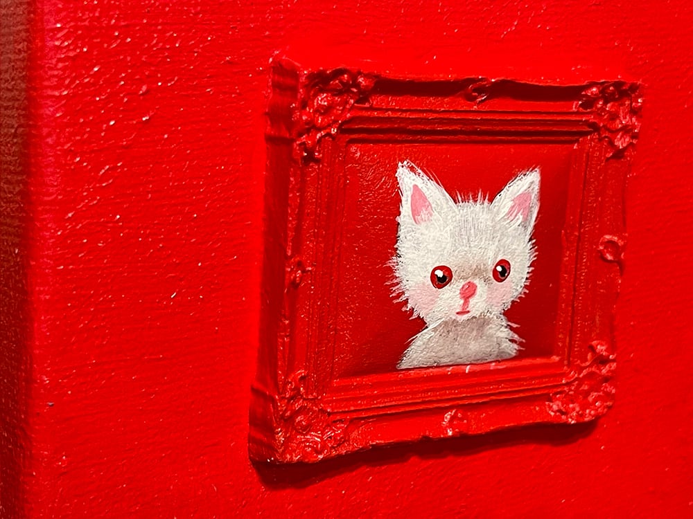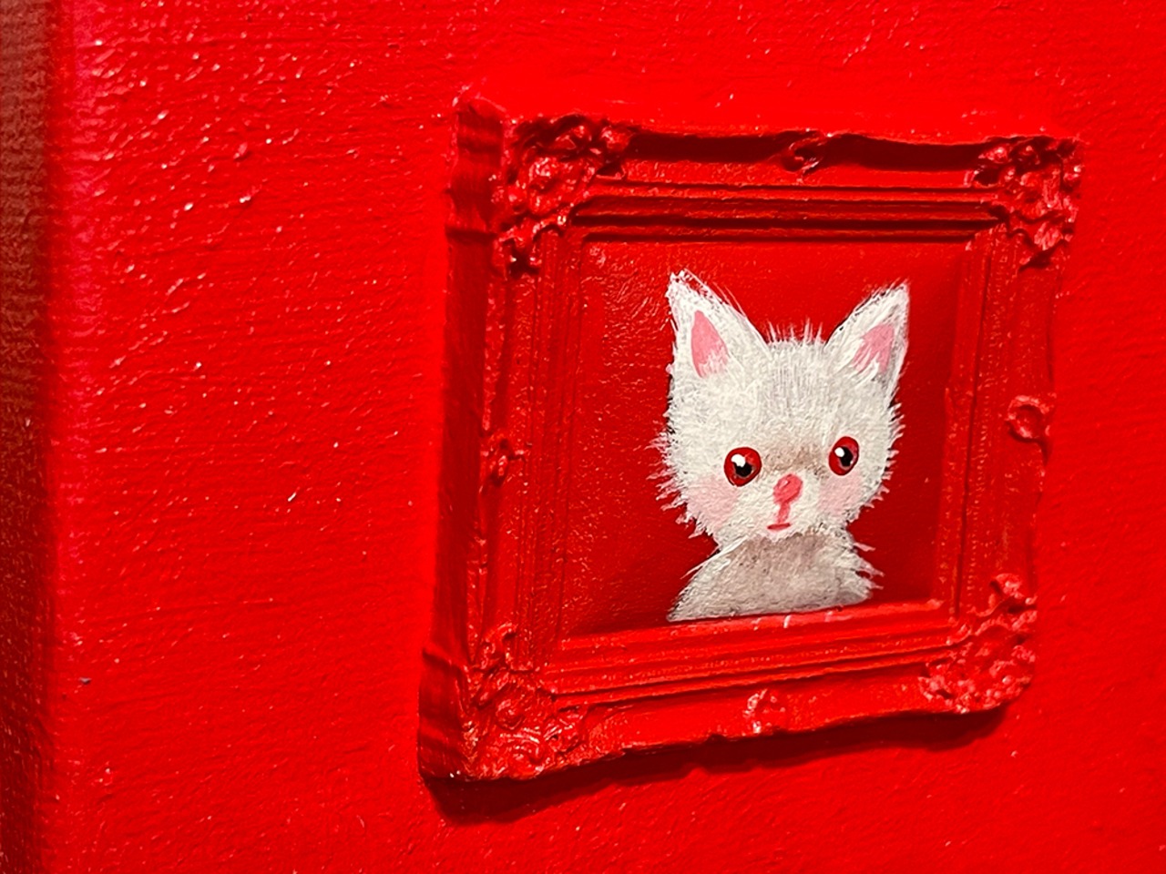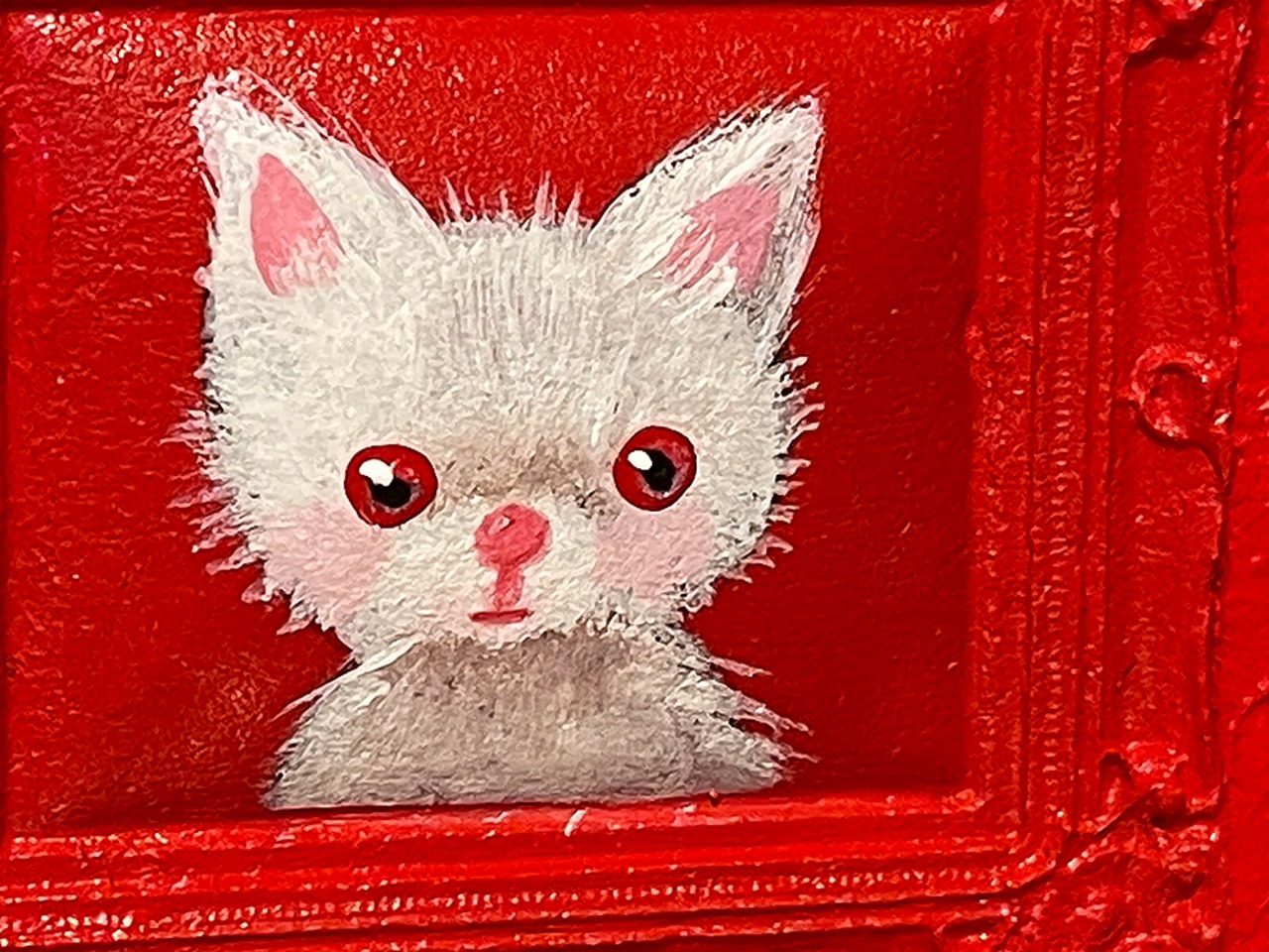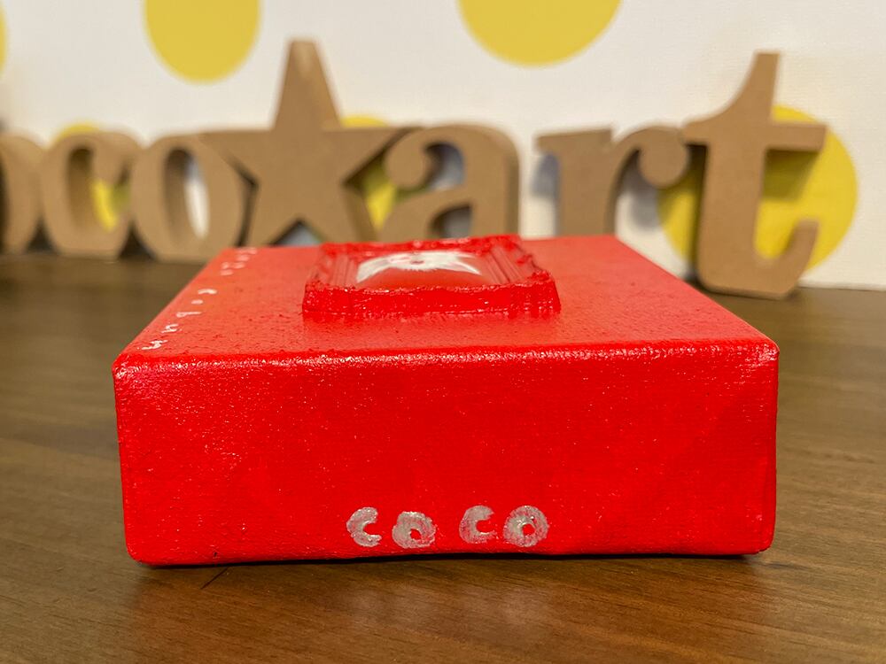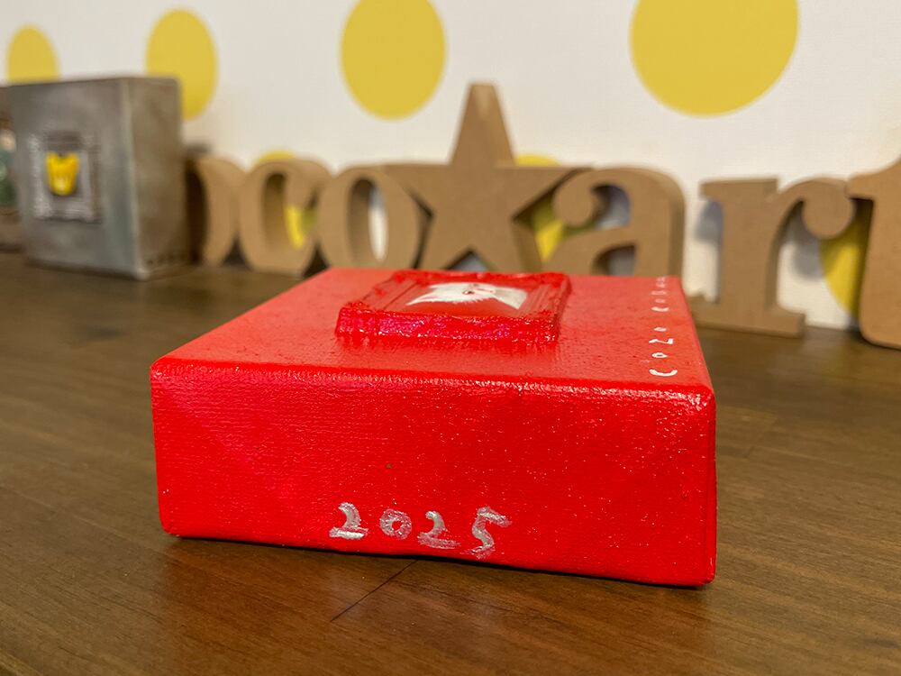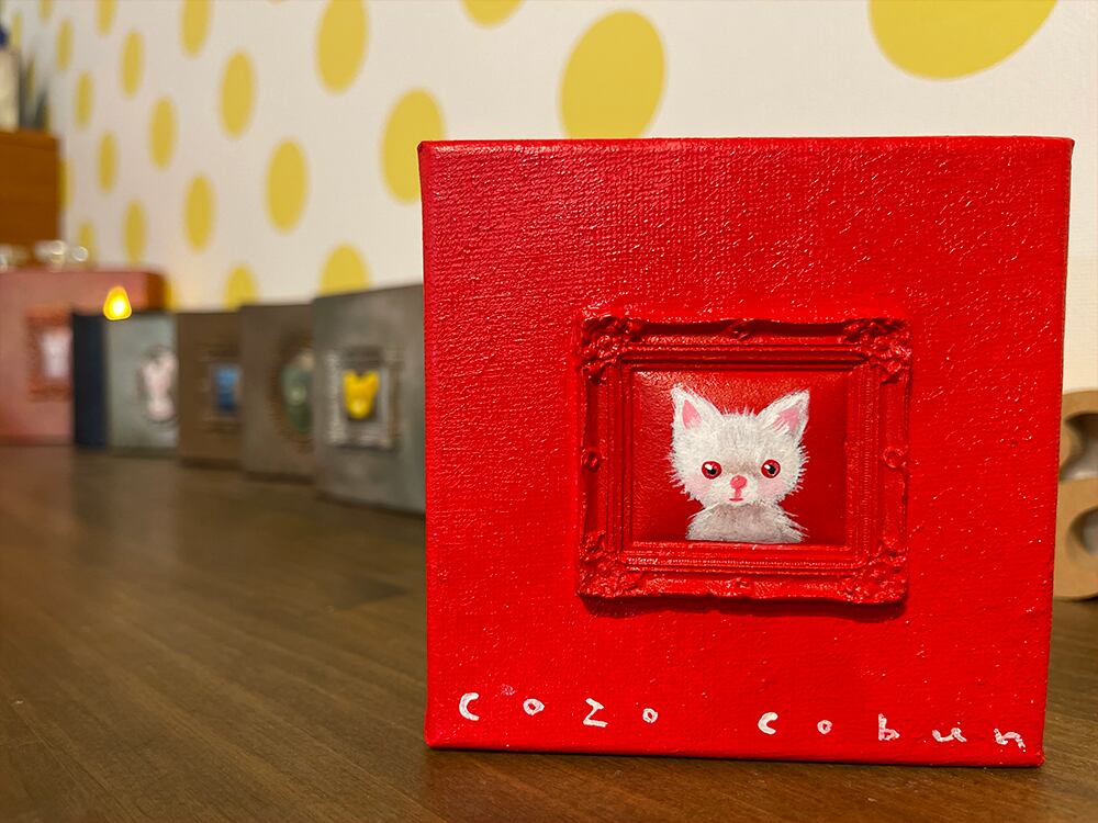 YouTube生ライブ配信で描いた作品です。粘土で作ったアンティーク風のミニチュア学に描かれたcocoくまが描かれた作品。壁に飾るのはもちろん、厚みがあるのでキャビネットやコレクションケースに置いた状態で飾ることができる3Dキャンバスに描かれた作品です。