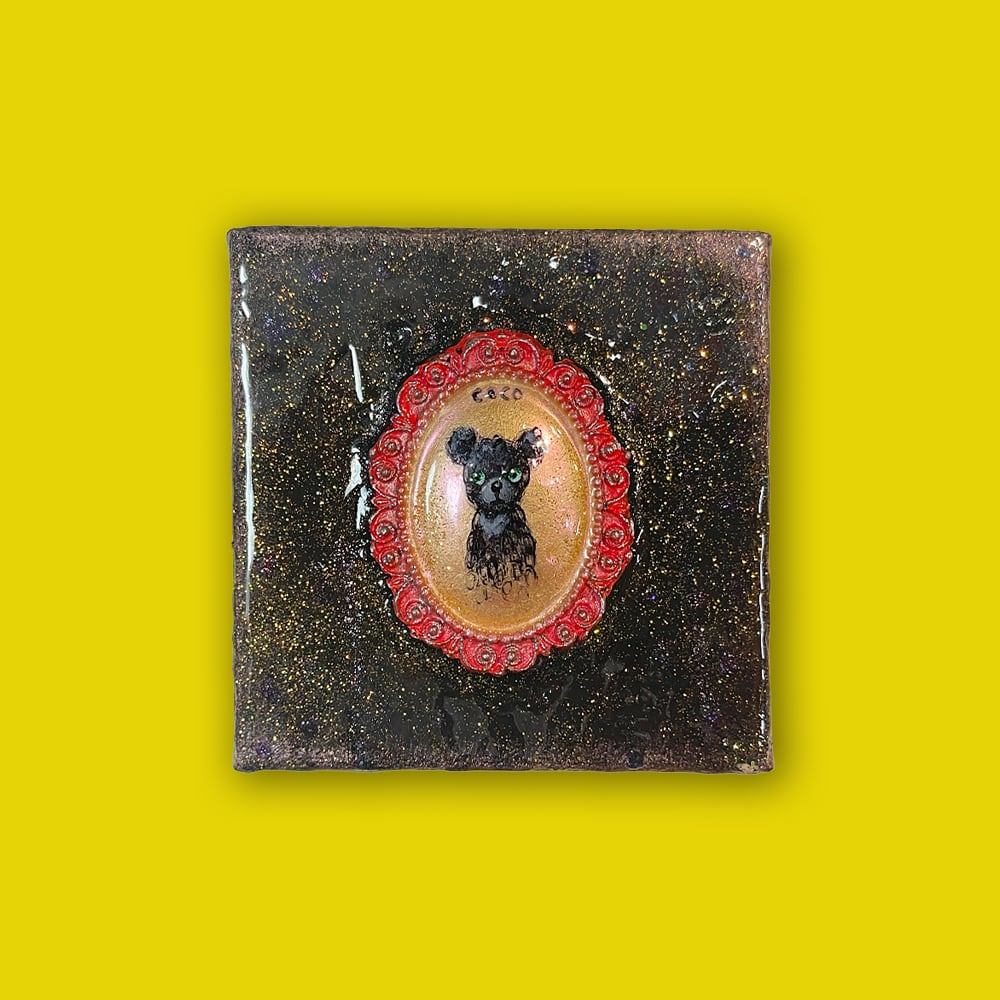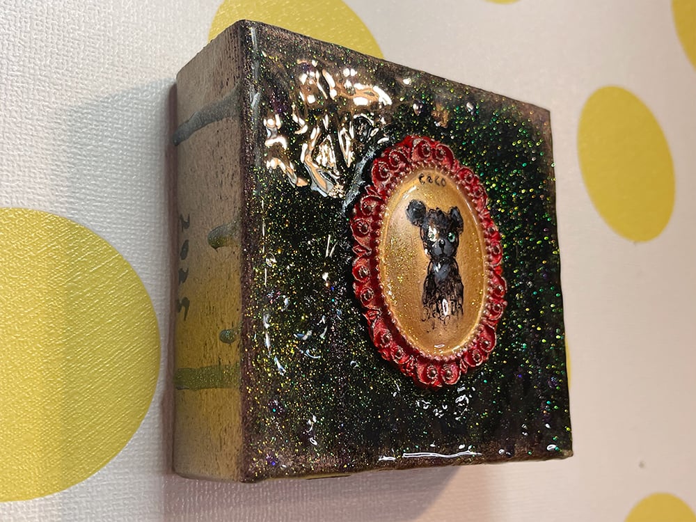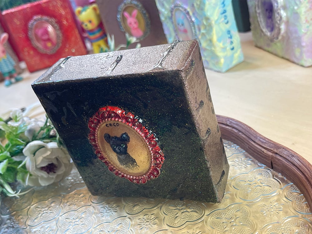 YouTube生ライブ配信で描いた作品です。独自配合した粘土で作ったアンティーク風のミニチュア額と、そこに【緑の目をした黒いcocoくま】が描かれた作品。2025年最後に完成した作品です。壁に飾るのはもちろん、厚みがあるのでキャビネットやコレクションケースに置いた状態で飾ることができる3Dキャンバスの作品です。