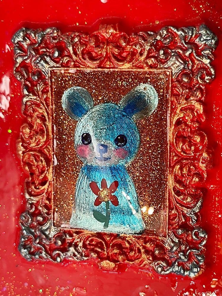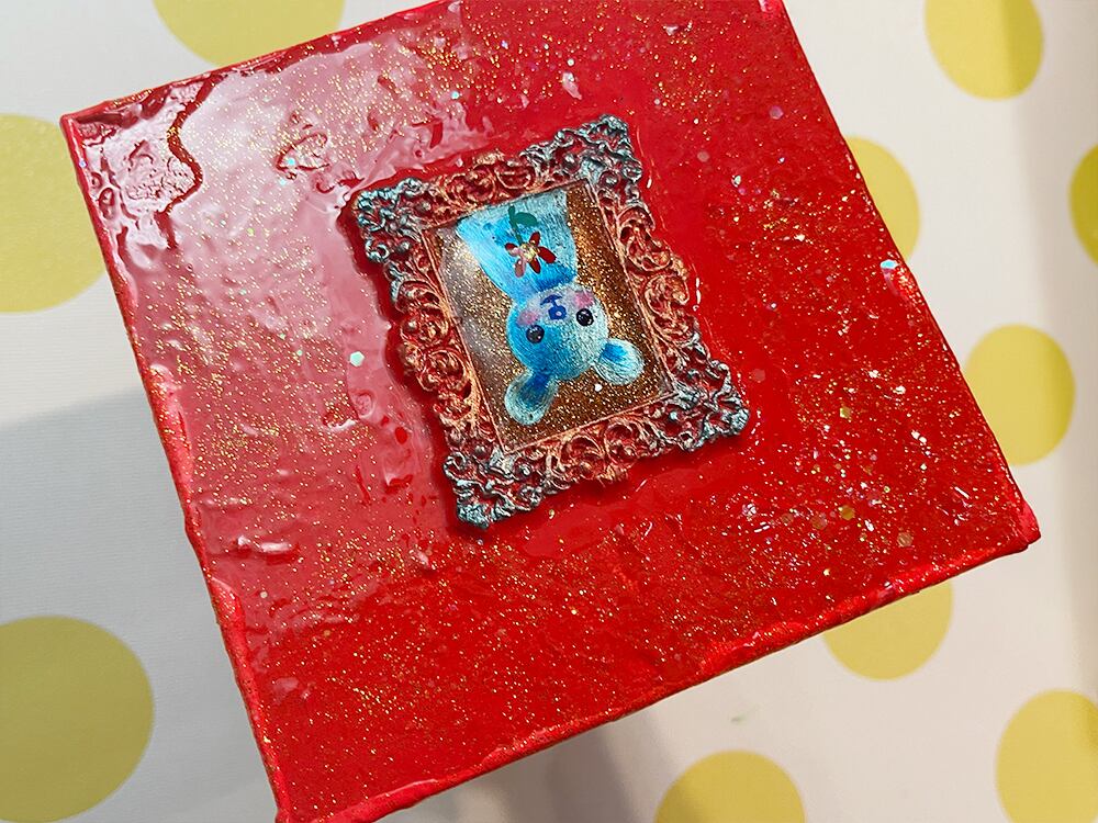 YouTube生ライブ配信で描いた作品です。独自配合した粘土で作ったアンティーク風のミニチュア額と、そこに【赤い花を持ったブルーに輝くcocoミミ】が描かれた作品。壁に飾るのはもちろん、厚みがあるのでキャビネットやコレクションケースに置いた状態で飾ることができる3Dキャンバスの作品です。