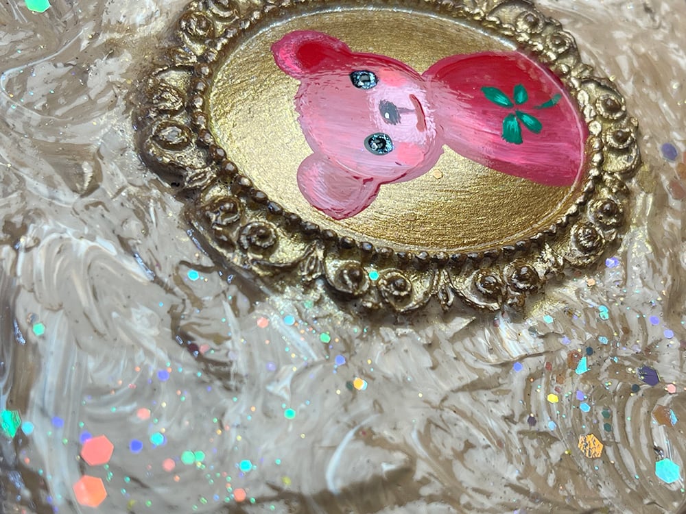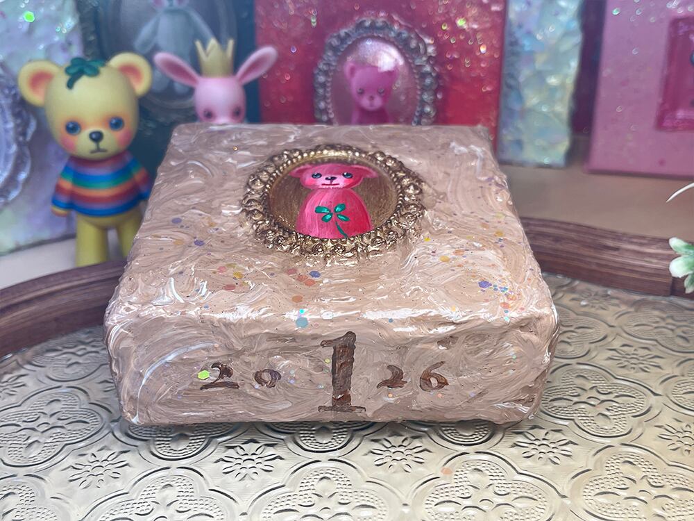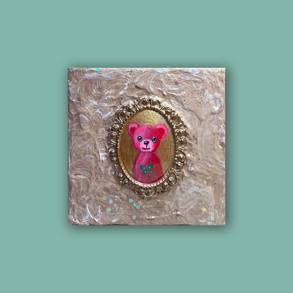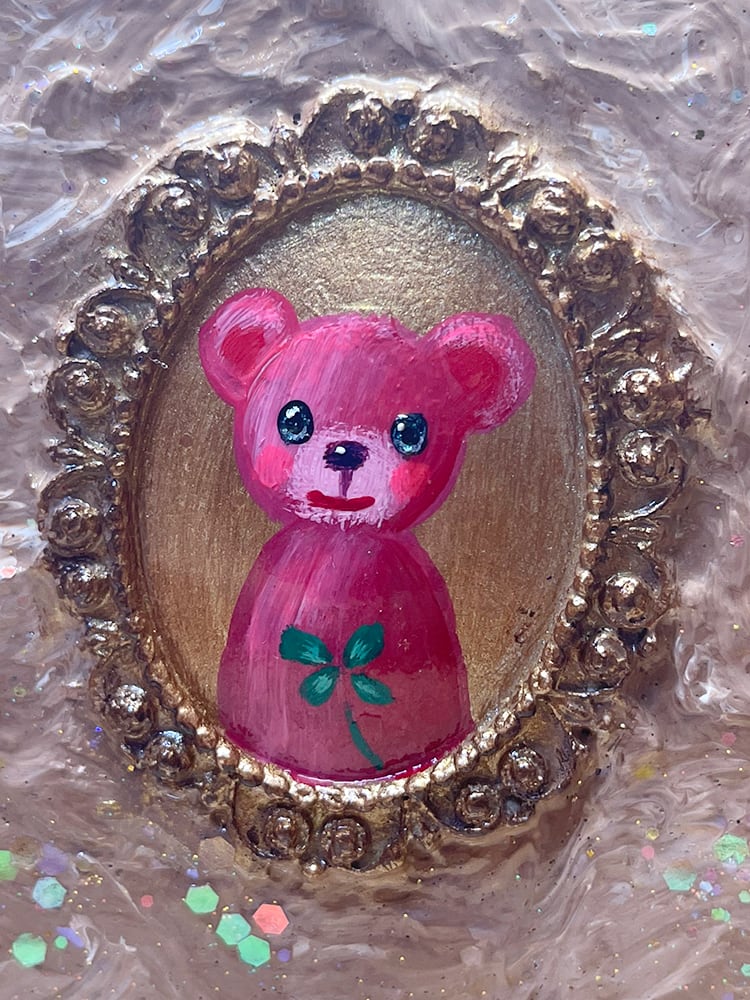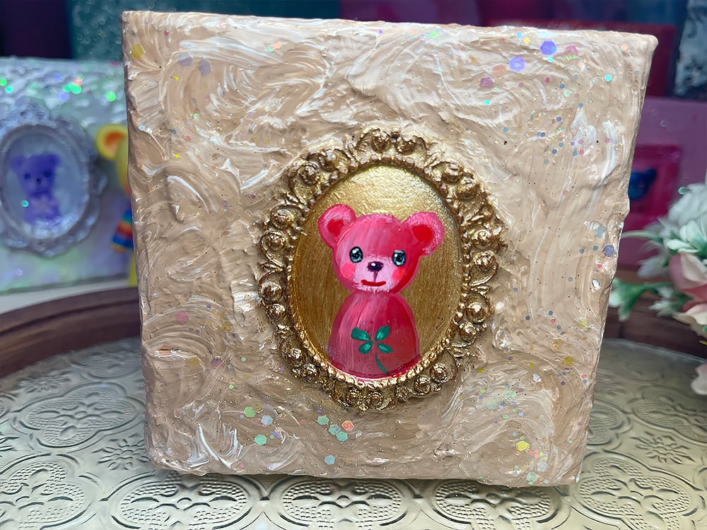 YouTube生ライブ配信で描いた作品です。独自配合した粘土で作ったアンティーク風のミニチュア額と、そこに【幸せを呼ぶ四つ葉のクローバーを持った赤いcocoくま】が描かれた作品。壁に飾るのはもちろん、厚みがあるのでキャビネットやコレクションケースに置いた状態で飾ることができる3Dキャンバスの作品です。
