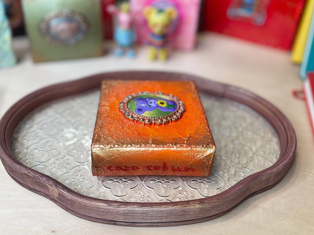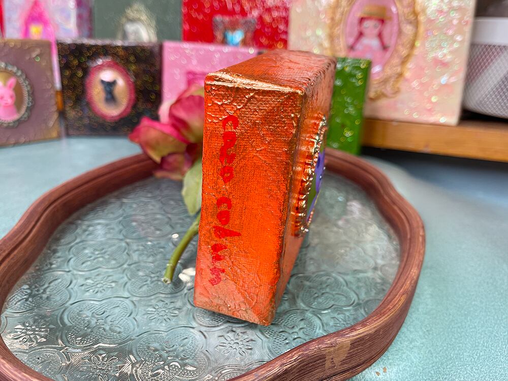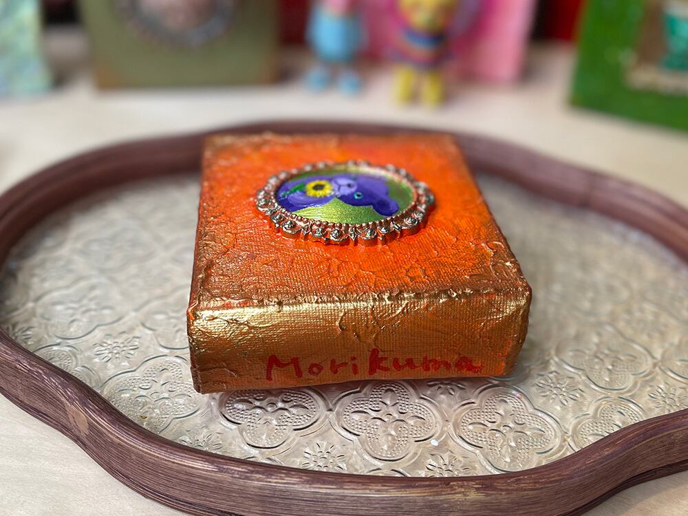 YouTube生ライブ配信で描いた作品です。独自配合した粘土で作ったアンティーク風のミニチュア額と、そこに【ひまわりを持った紫色のcocoくま】が、描かれた作品。壁に飾るのはもちろん、厚みがあるのでキャビネットやコレクションケースに置いた状態で飾ることができる3Dキャンバスの作品です。
