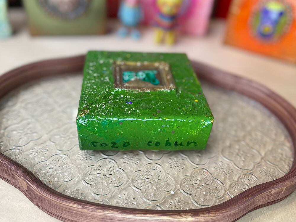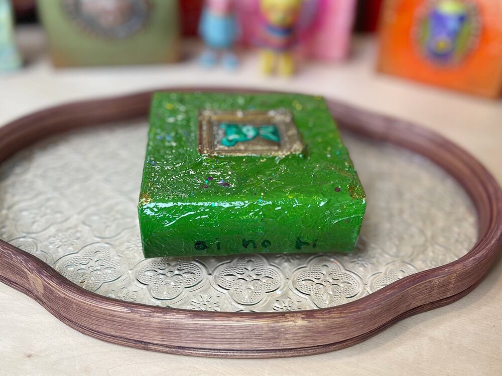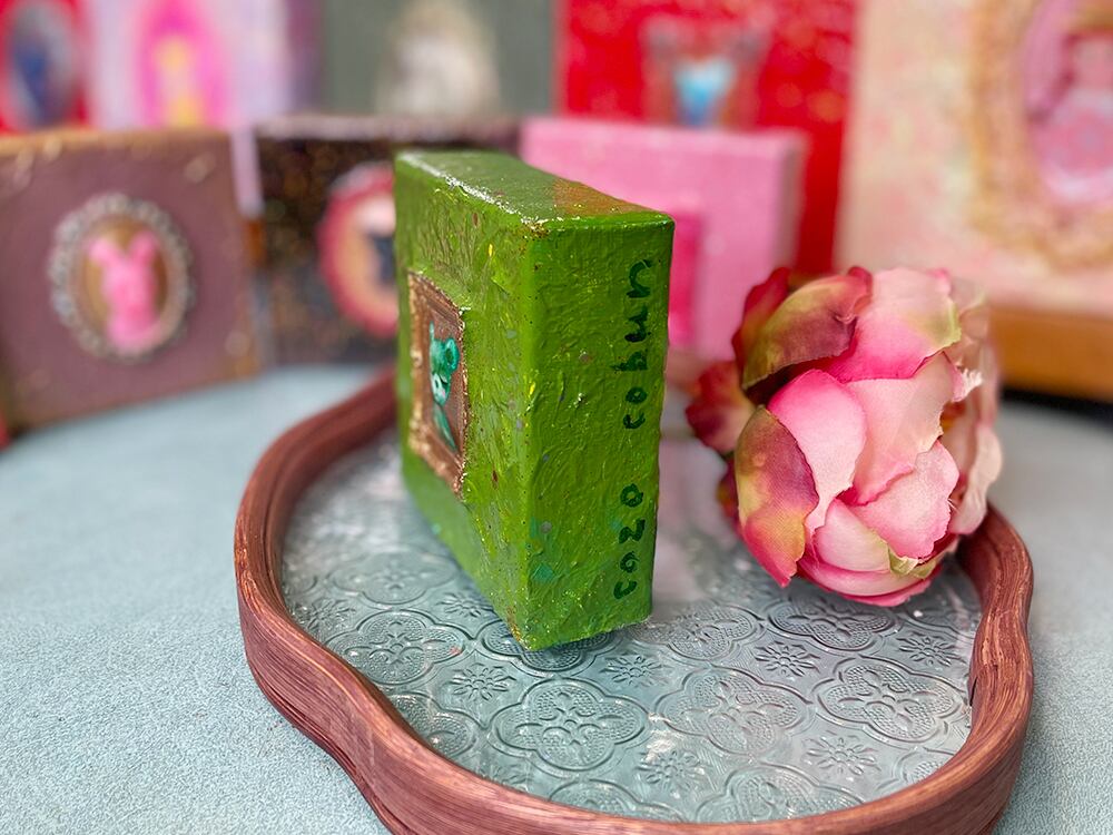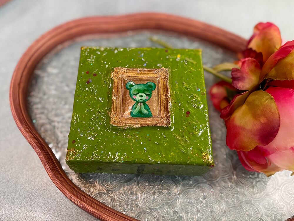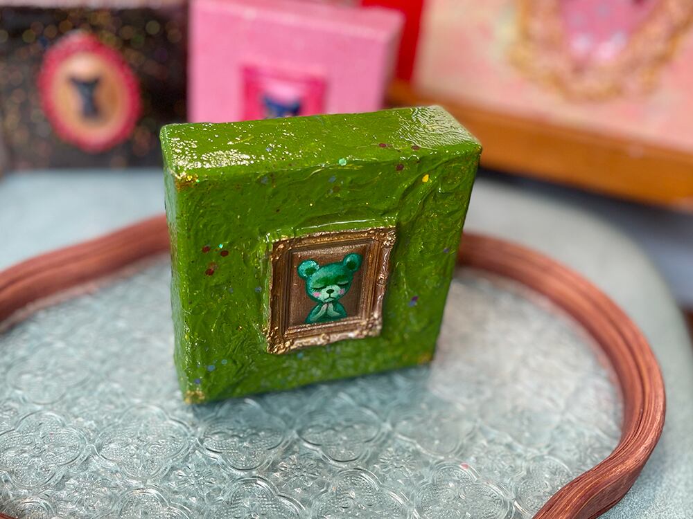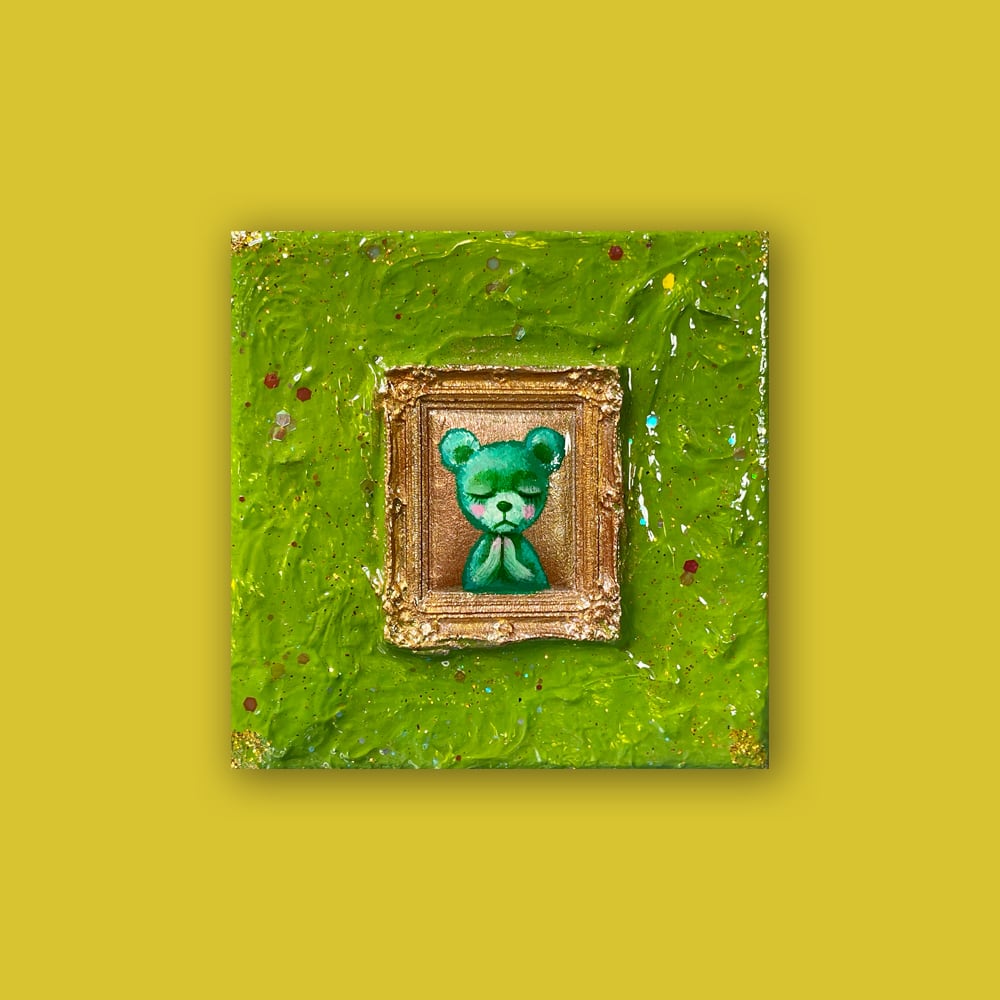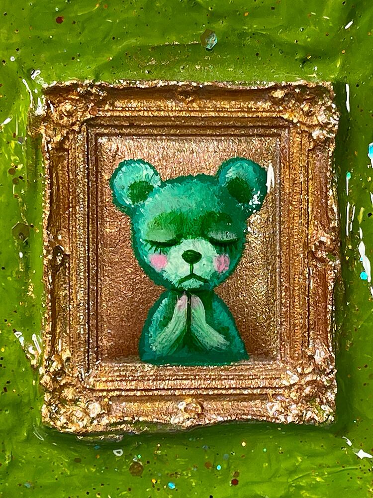 YouTube生ライブ配信で描いた作品です。独自配合した粘土で作ったアンティーク風のミニチュア額と、そこに【目を瞑りお祈りをしている緑のcocoくま】が描かれた作品。壁に飾るのはもちろん、厚みがあるのでキャビネットやコレクションケースに置いた状態で飾ることができる3Dキャンバスの作品です。