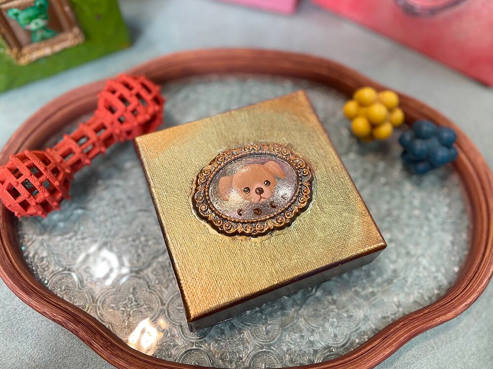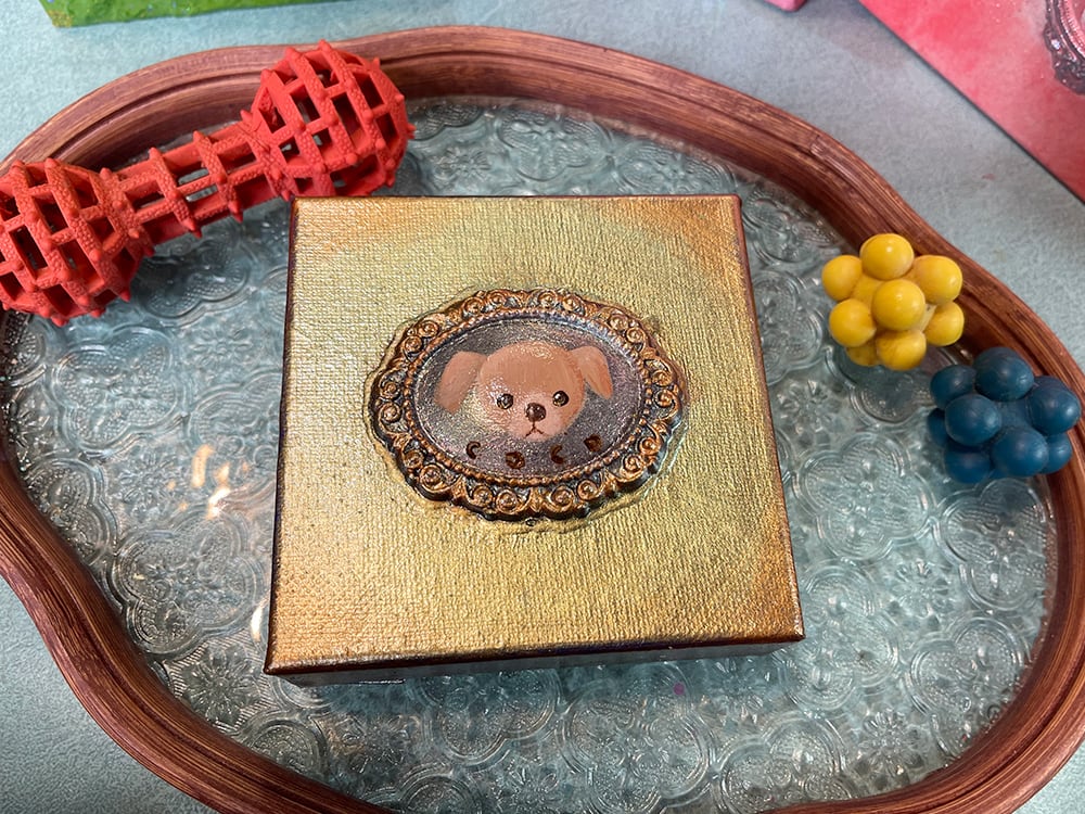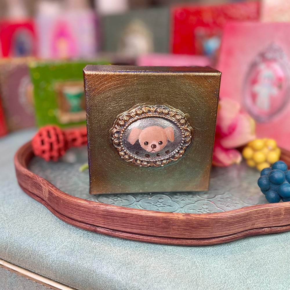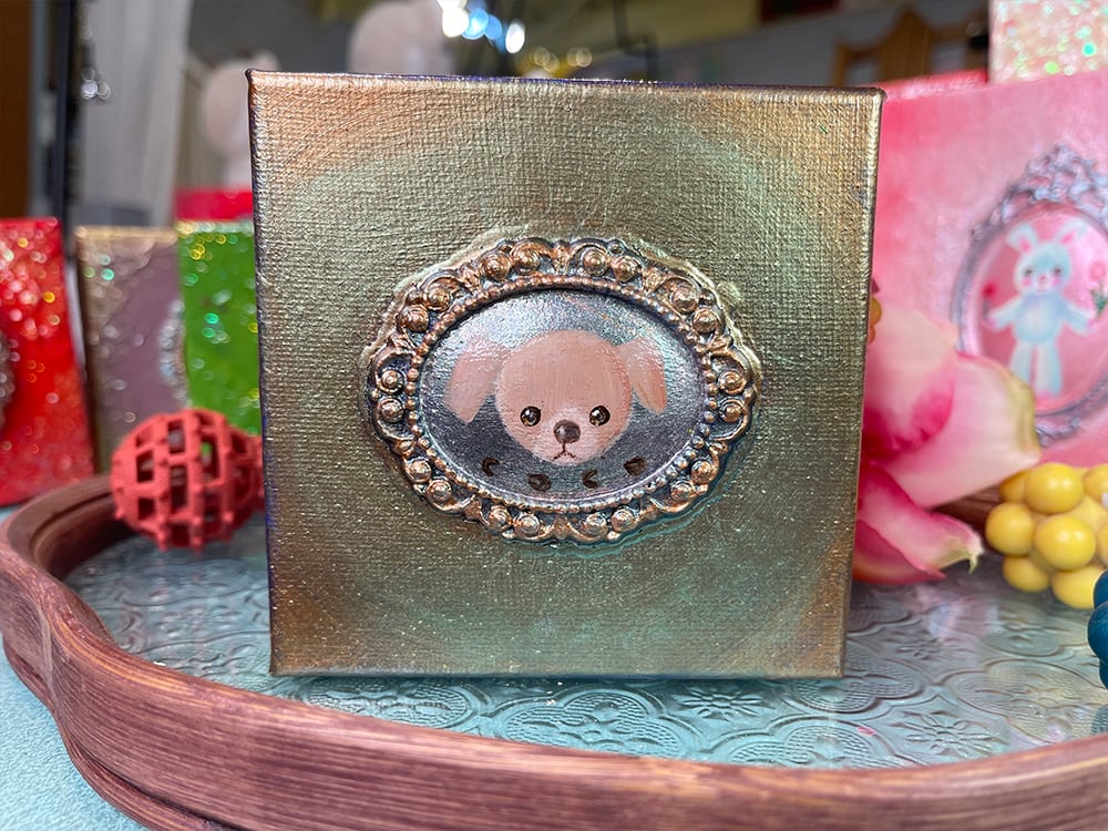 YouTube生ライブ配信で描いた作品です。独自配合した粘土で作ったアンティーク風のミニチュア額と、そこに【cocoの愛犬Ryuくんをモチーフ】に描かれた作品。壁に飾るのはもちろん、厚みがあるのでキャビネットやコレクションケースに置いた状態で飾ることができる3Dキャンバスの作品です。