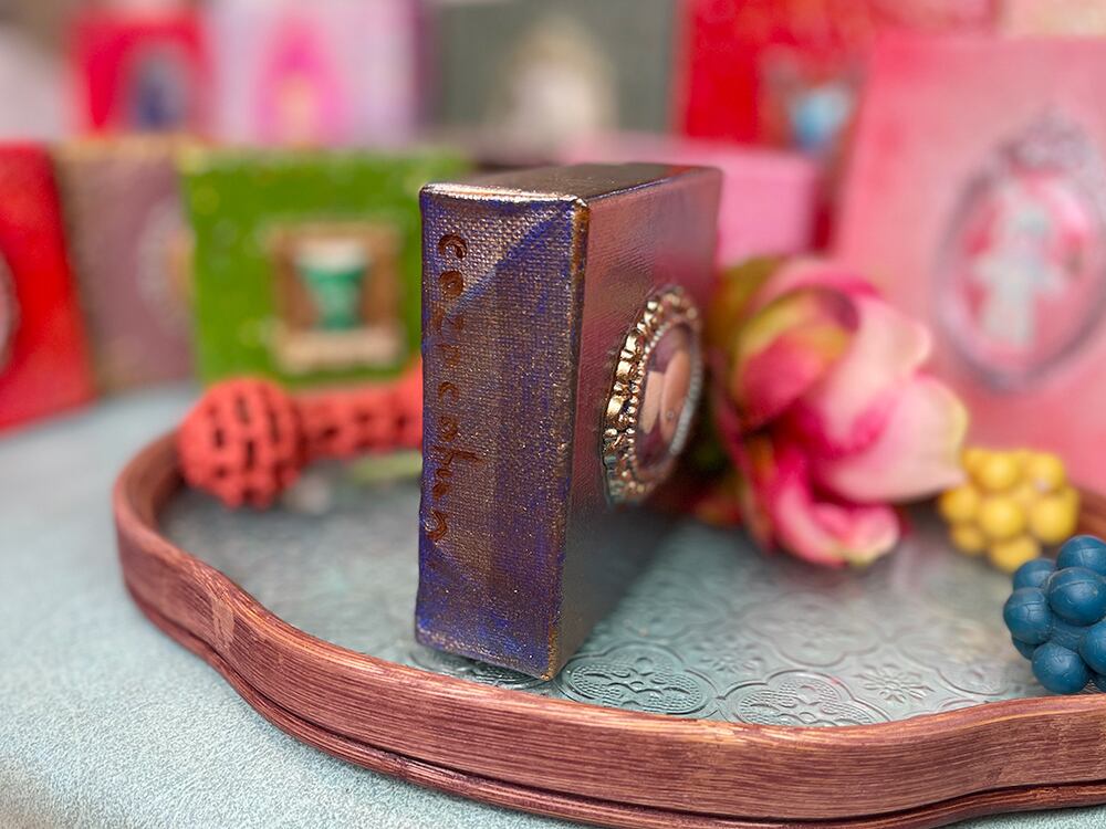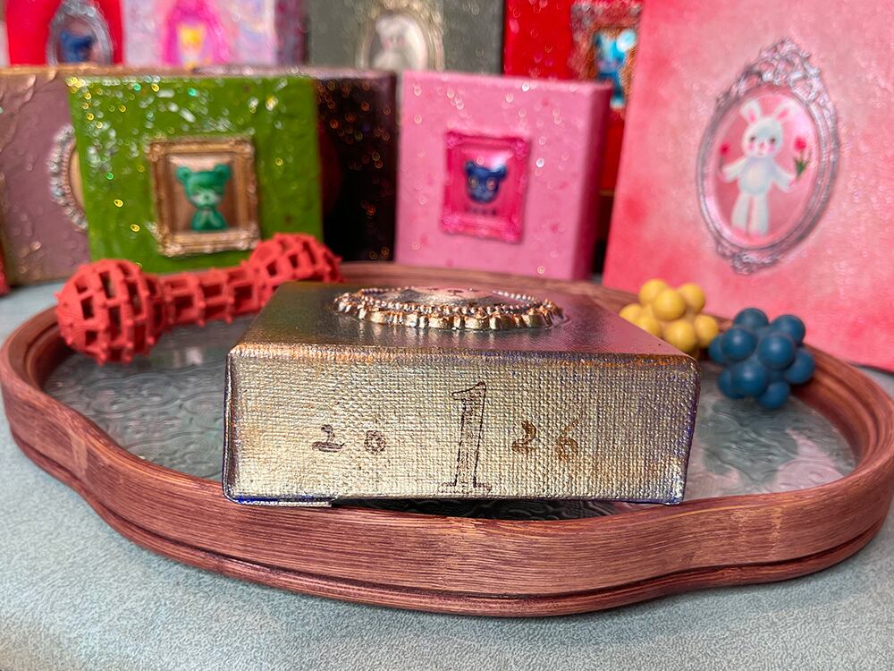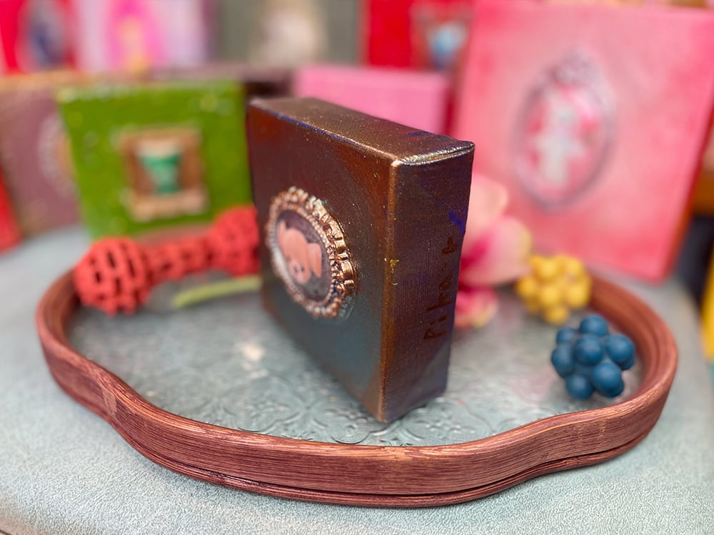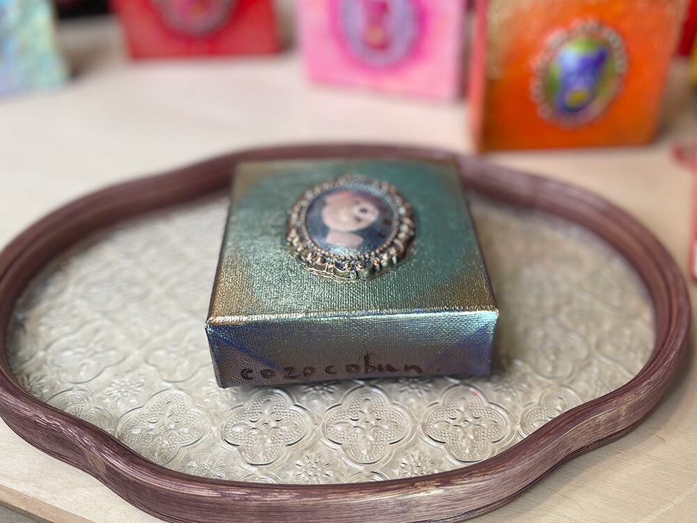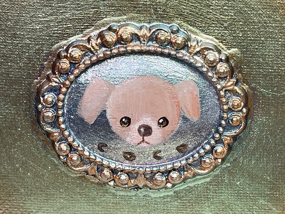 YouTube生ライブ配信で描いた作品です。独自配合した粘土で作ったアンティーク風のミニチュア額と、そこに【cocoの愛犬Ryuくんをモチーフ】に描かれた作品。壁に飾るのはもちろん、厚みがあるのでキャビネットやコレクションケースに置いた状態で飾ることができる3Dキャンバスの作品です。