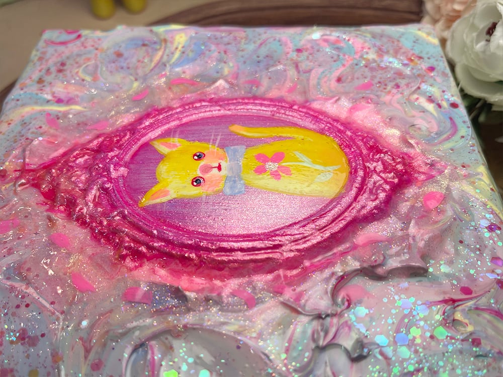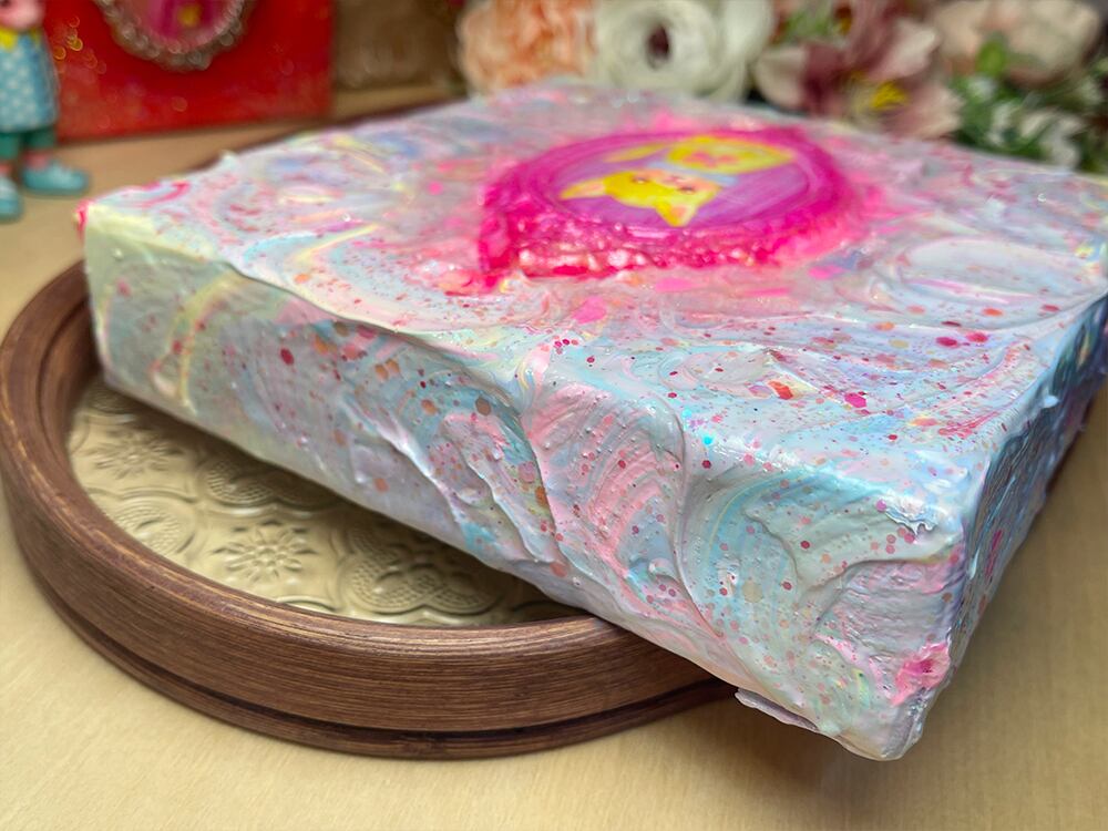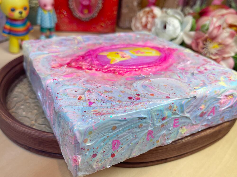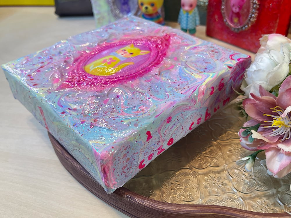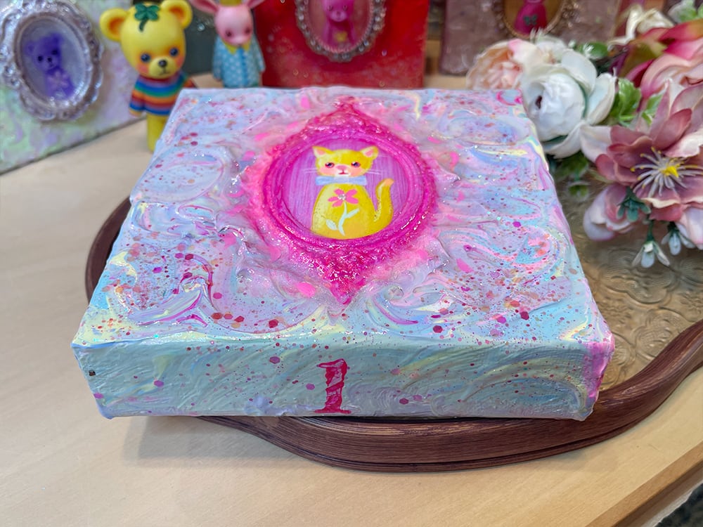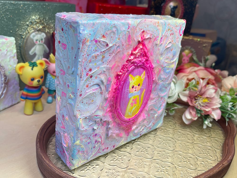 YouTube生ライブ配信で描いた作品です。独自配合した粘土で作ったアンティーク風のミニチュア額と、そこに【蝶ネクタイをした黄色のcocoミミ】が描かれた作品。壁に飾るのはもちろん、厚みがあるのでキャビネットやコレクションケースに置いた状態で飾ることができる3Dキャンバスの作品です。
