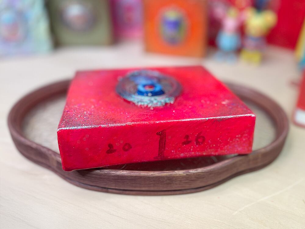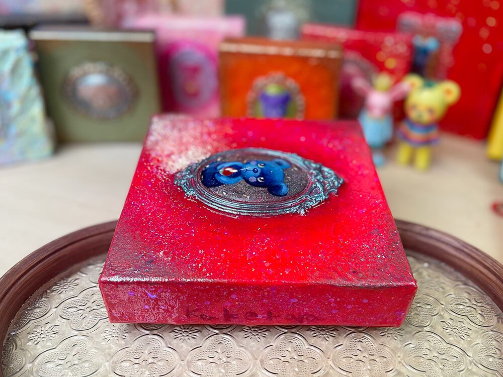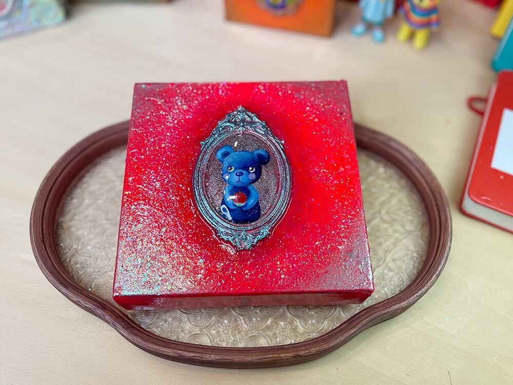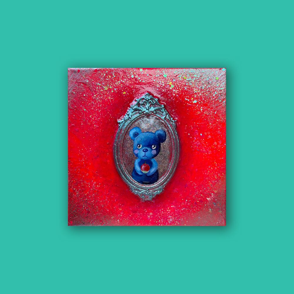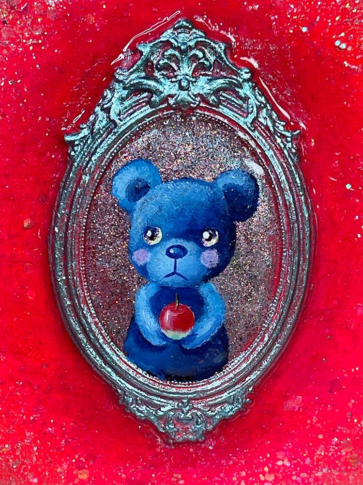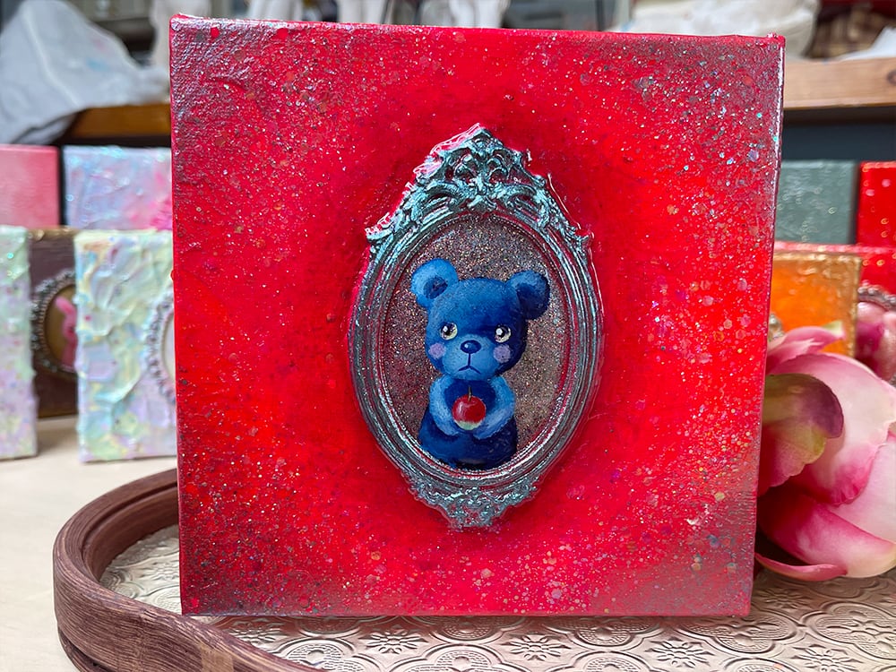 YouTube生ライブ配信で描いた作品です。独自配合した粘土で作ったアンティーク風のミニチュア額と、そこに【りんごを持った青いcocoくま】が描かれた作品。壁に飾るのはもちろん、厚みがあるのでキャビネットやコレクションケースに置いた状態で飾ることができる3Dキャンバスの作品です。