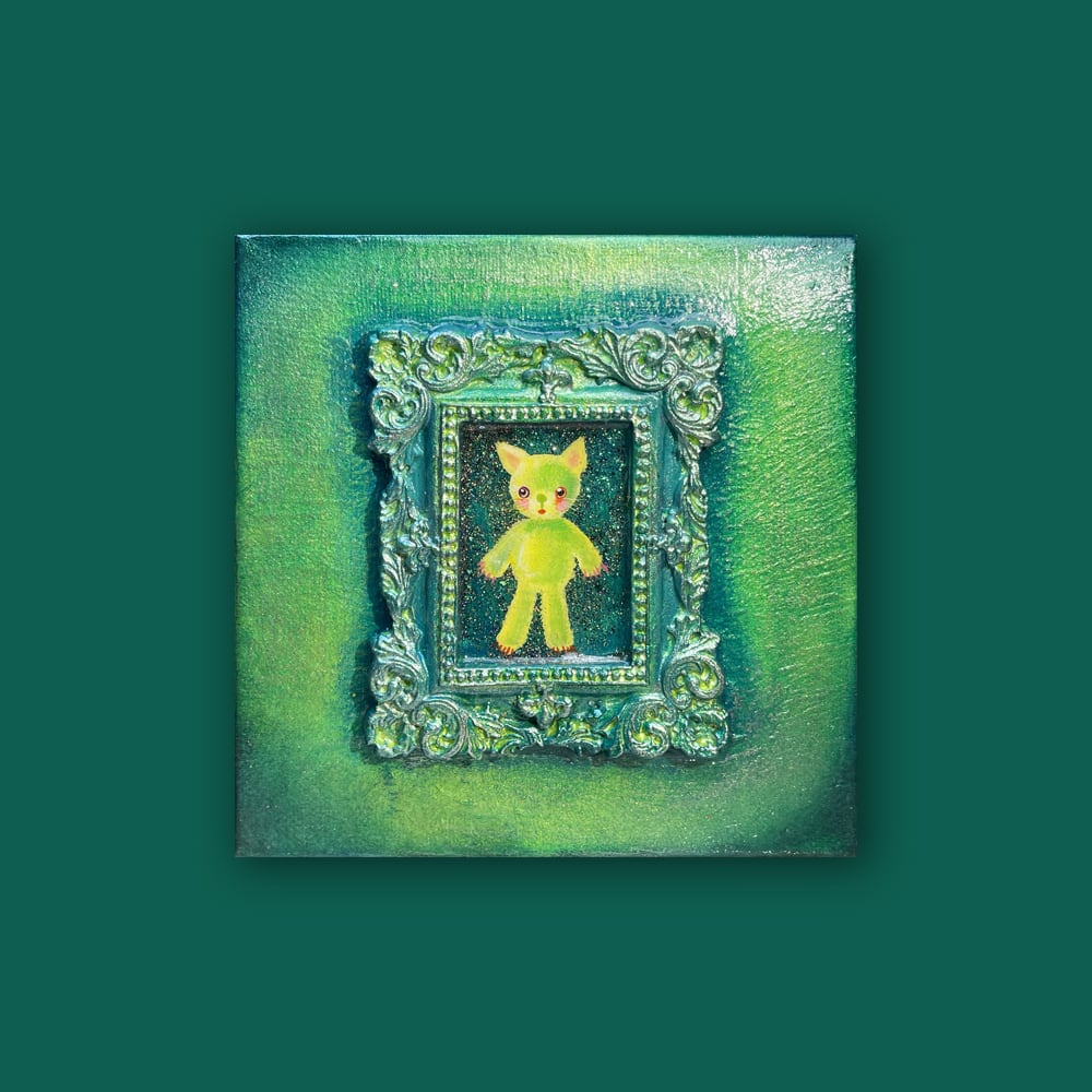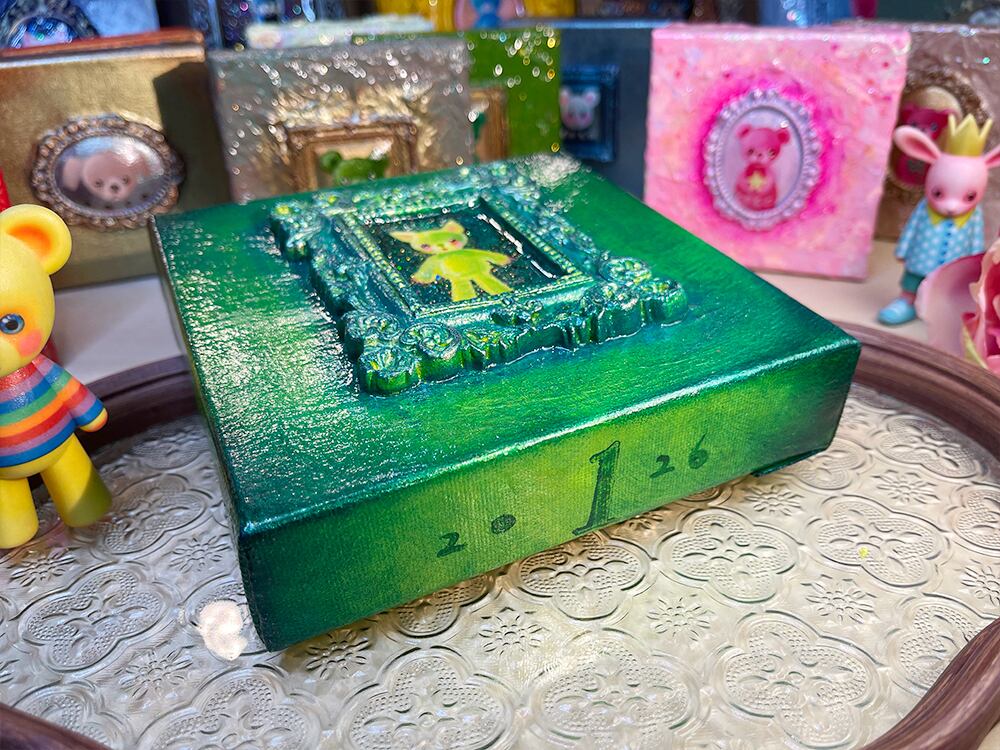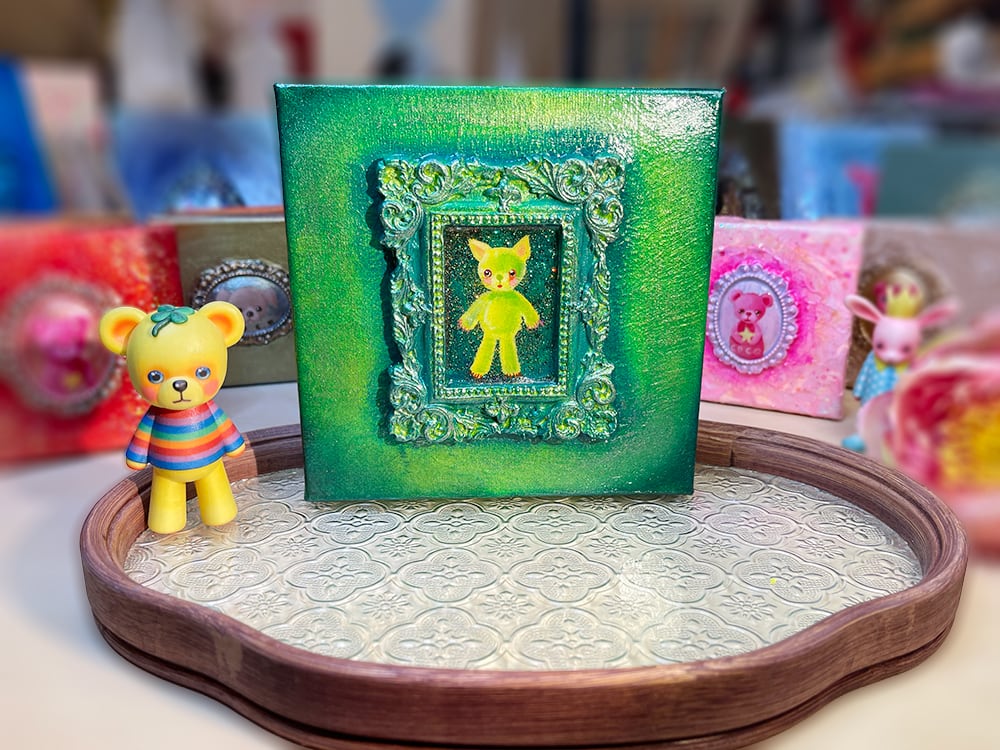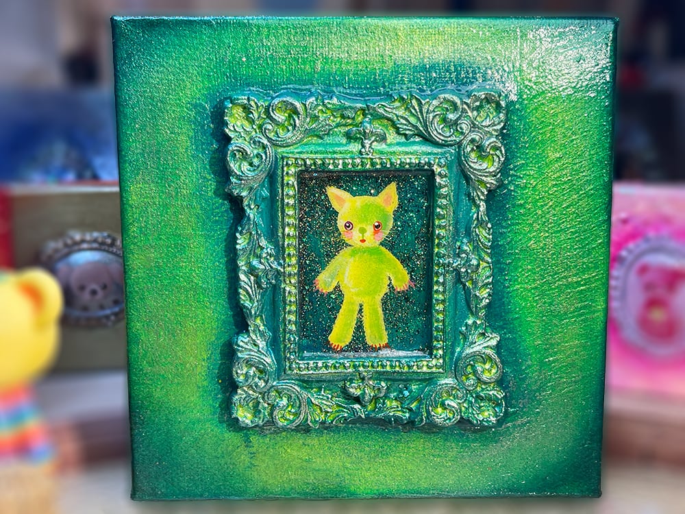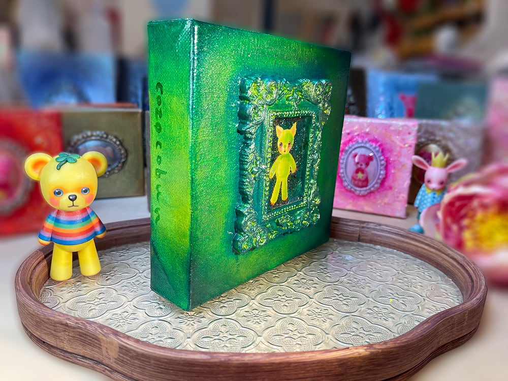 YouTube生ライブ配信で描いた作品です。独自配合した粘土で作ったアンティーク風のミニチュア額と、そこに【愛らしい表情の黄色のcocoみみ】が描かれた作品。壁に飾るのはもちろん、厚みがあるのでキャビネットやコレクションケースに置いた状態で飾ることができる3Dキャンバスの作品です。