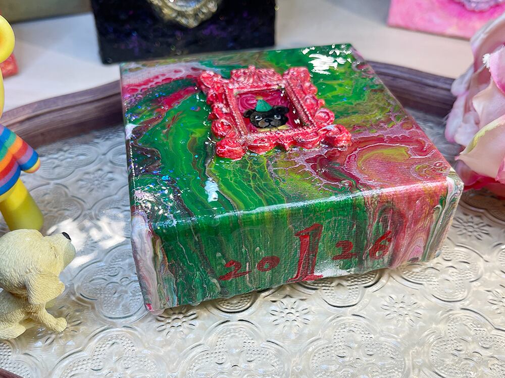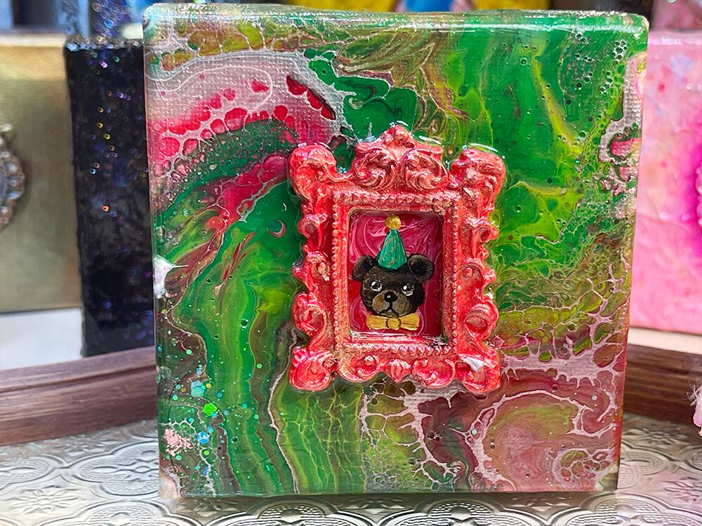 YouTube生ライブ配信で描いた作品です。独自配合した粘土で作ったアンティーク風のミニチュア額と、そこに【パーティ三角帽を被って蝶ネクタイをしたcocoくま】が描かれた作品。壁に飾るのはもちろん、厚みがあるのでキャビネットやコレクションケースに置いた状態で飾ることができる3Dキャンバスの作品です。