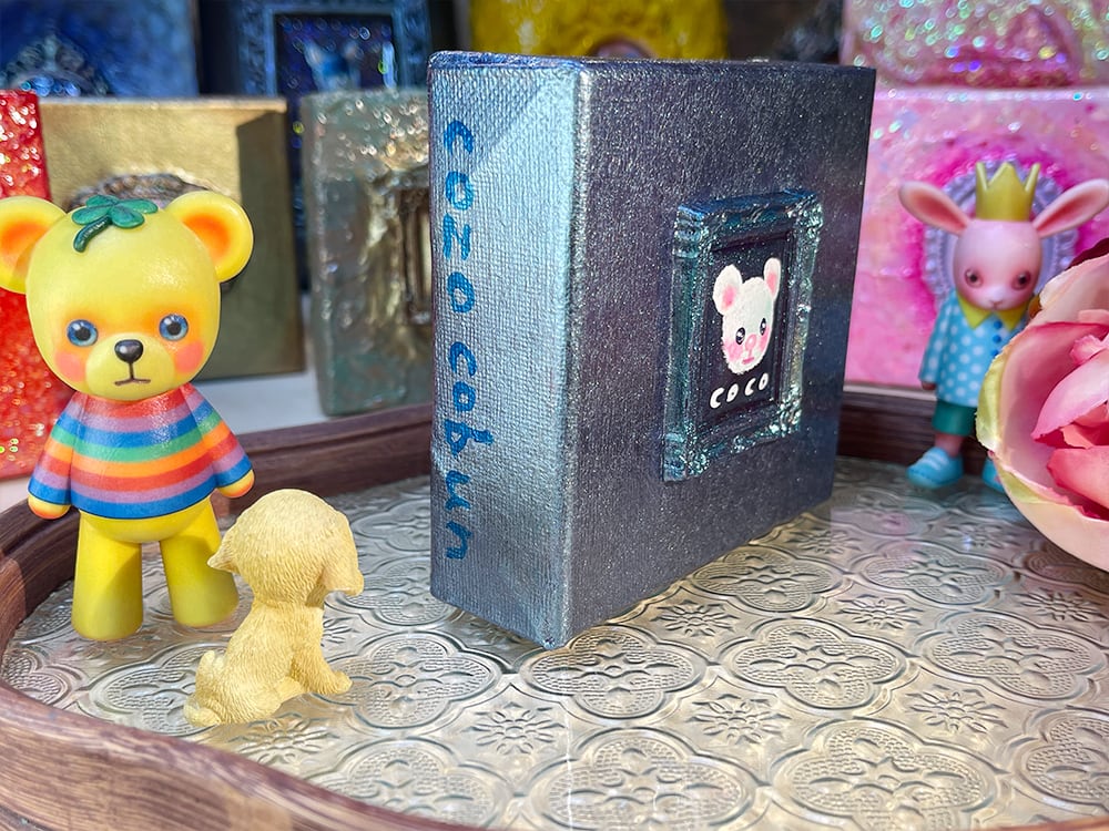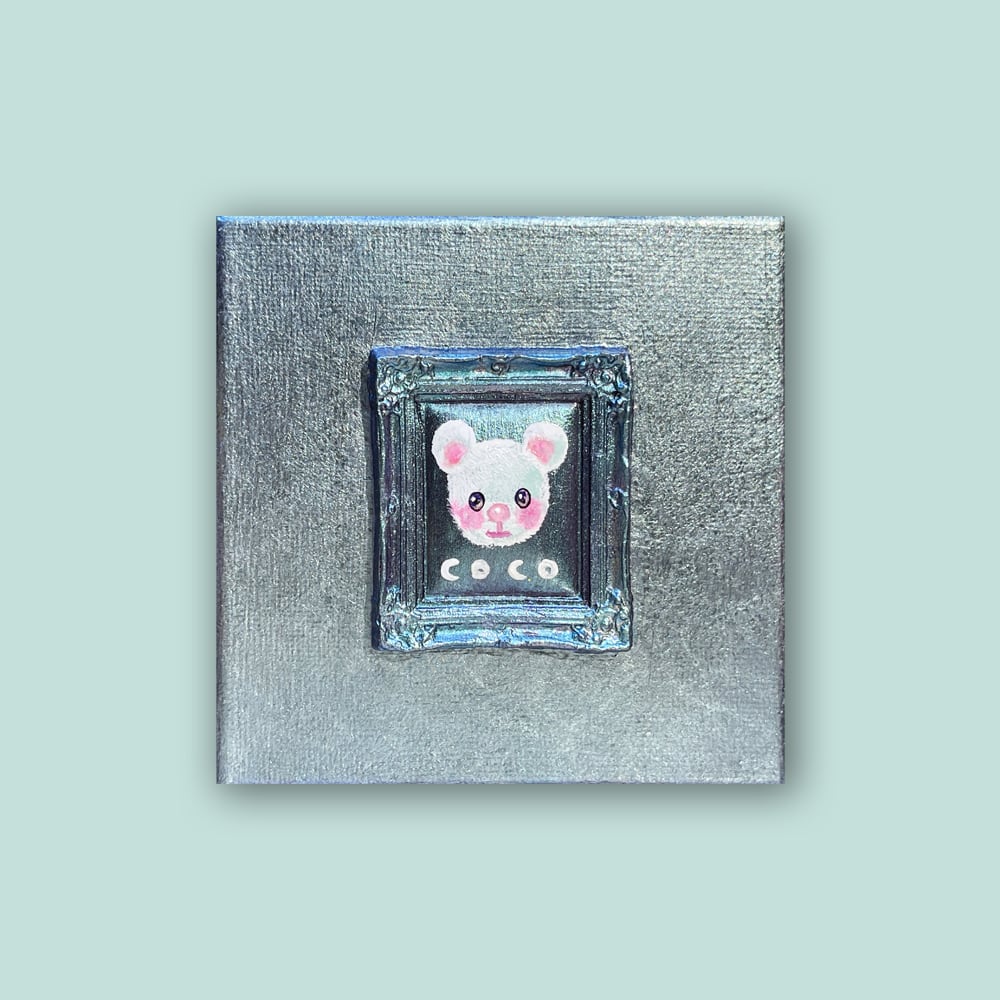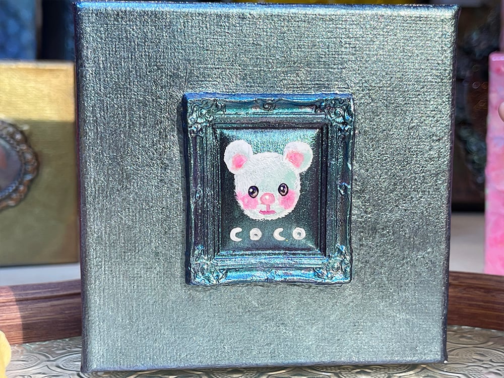 YouTube生ライブ配信で描いた作品です。独自配合した粘土で作ったアンティーク風のミニチュア額と、そこに【ピンクのほっぺの白いcocoくま】が描かれた作品。壁に飾るのはもちろん、厚みがあるのでキャビネットやコレクションケースに置いた状態で飾ることができる3Dキャンバスの作品です。