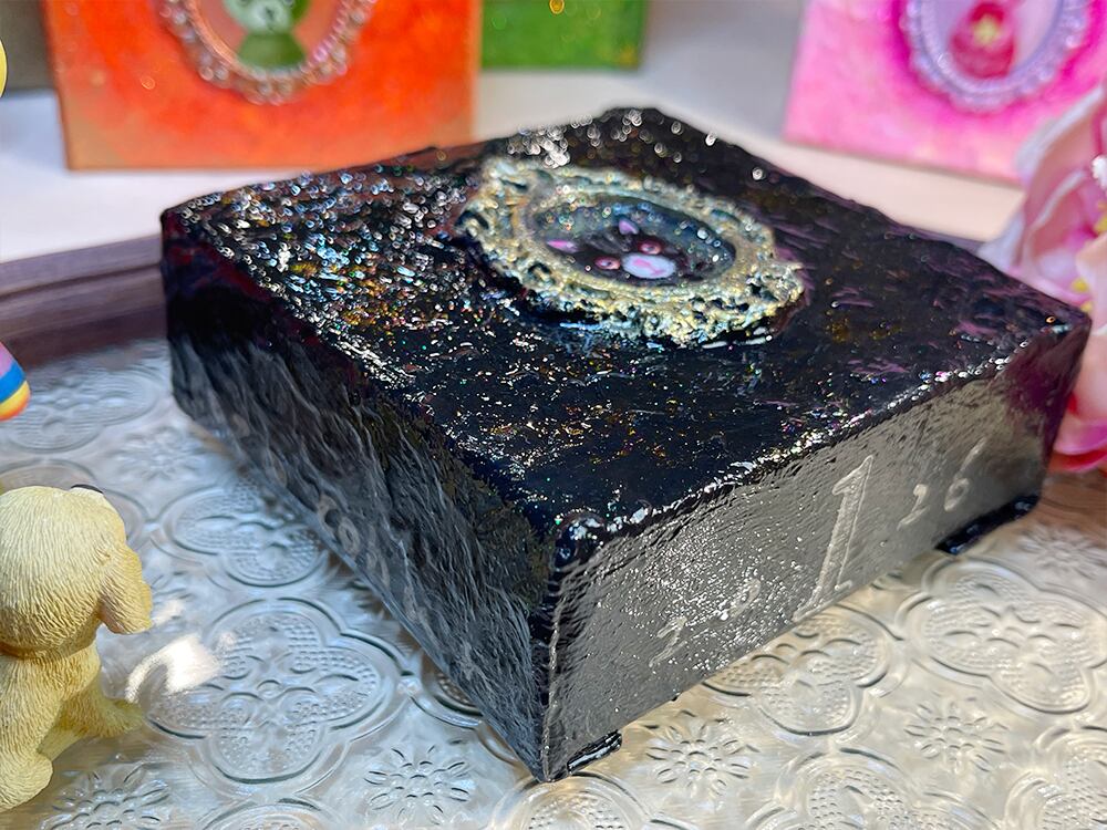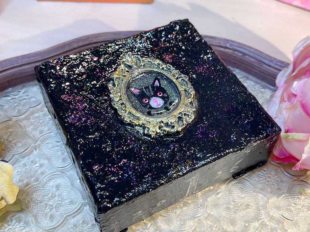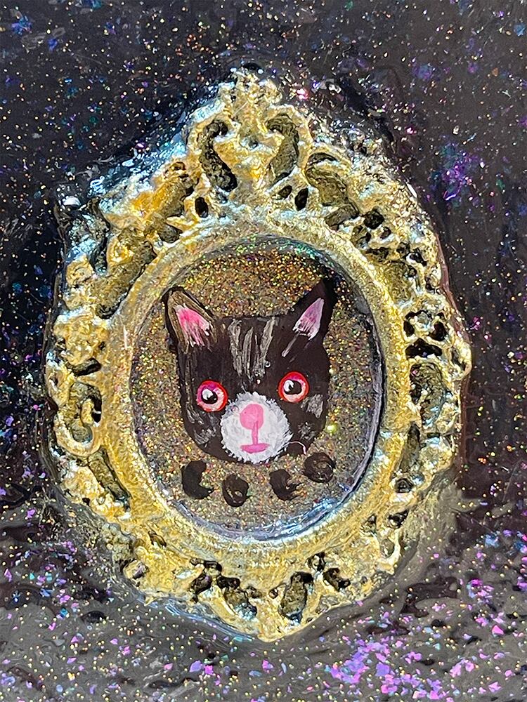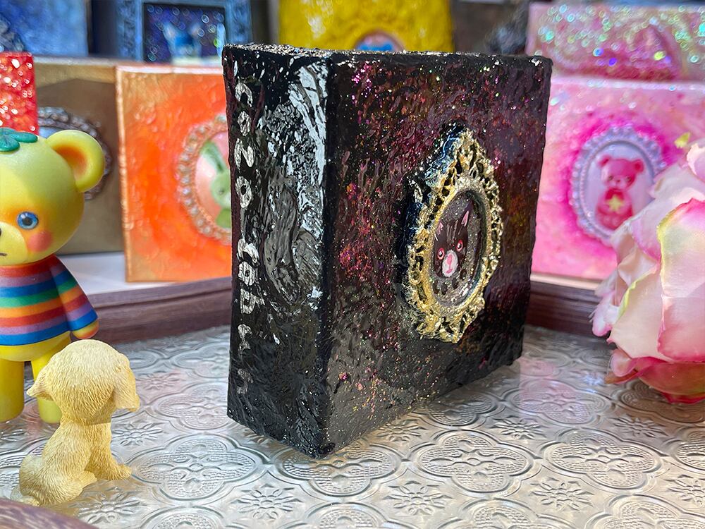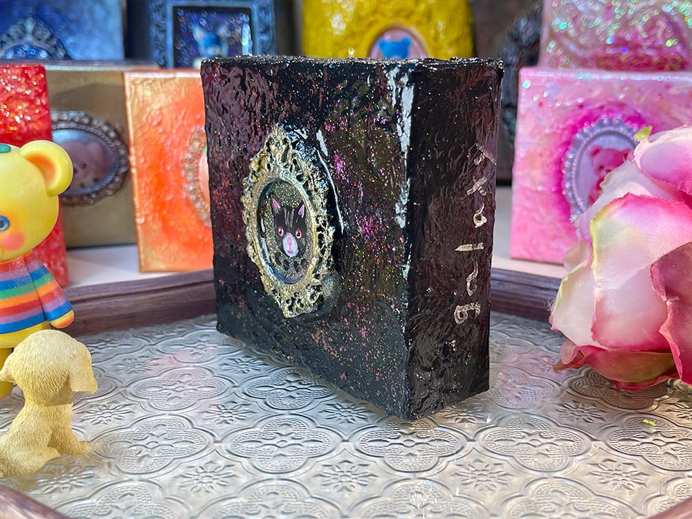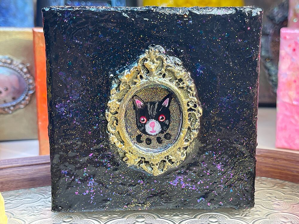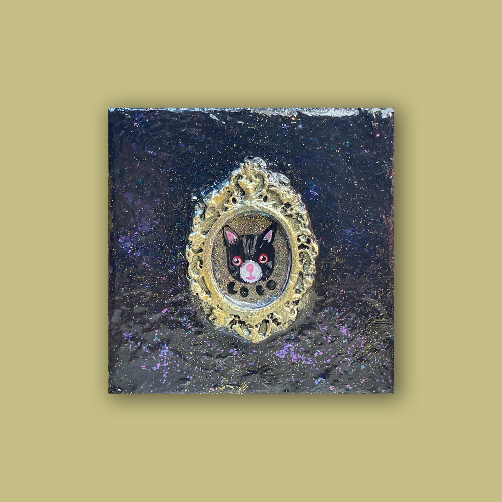 YouTube生ライブ配信で描いた作品です。独自配合した粘土で作ったアンティーク風のミニチュア額と、そこに【白いシマの黒いcocoみみ】が描かれた作品。壁に飾るのはもちろん、厚みがあるのでキャビネットやコレクションケースに置いた状態で飾ることができる3Dキャンバスの作品です。