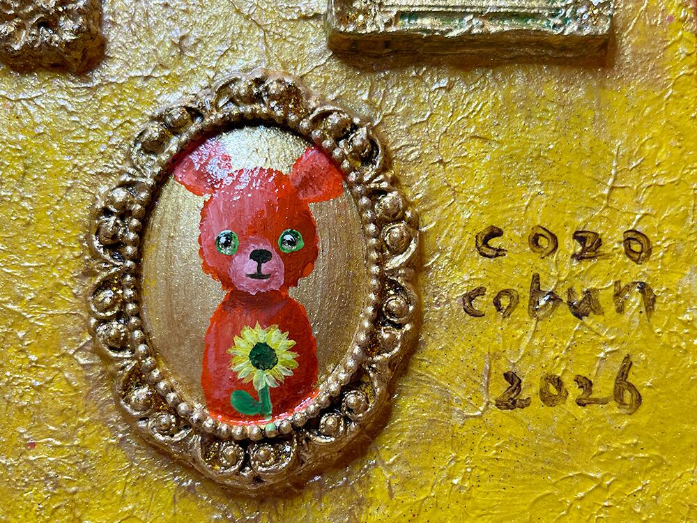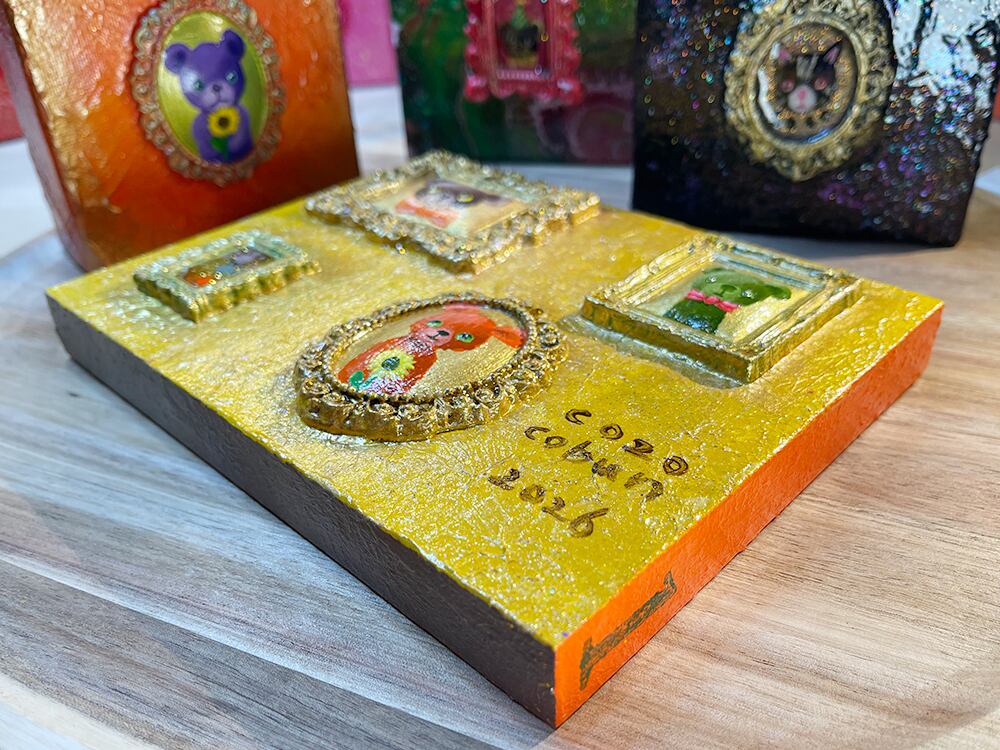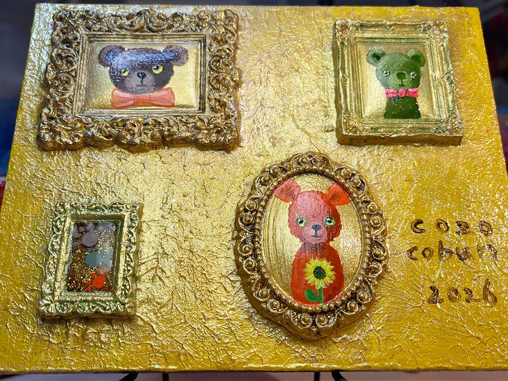 金色にきらめくテクスチャの下地に、独自配合した粘土で作ったアンティーク風のミニチュア額が浮き上がり、見る角度で光が変わる。