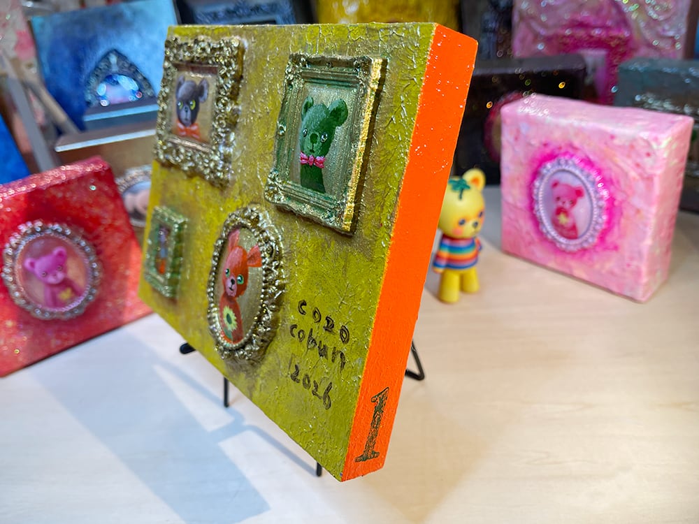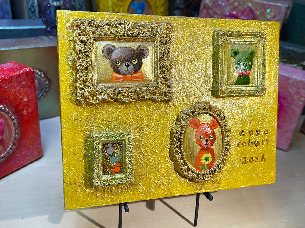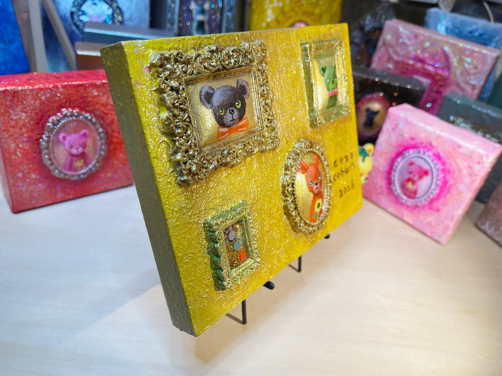 ひとつのウッドパネルの上に、複数の額縁=物語を並べたまさにミニチュア美術館のような作品 です。