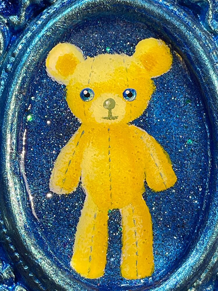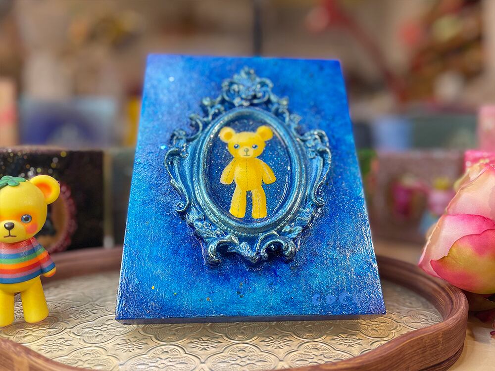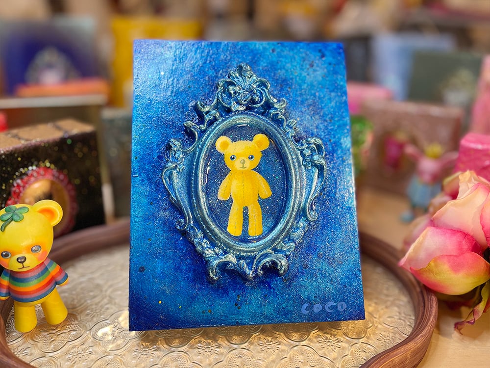 その中に佇むのは、まっすぐ前を向く 黄色いcocoくま作品です。