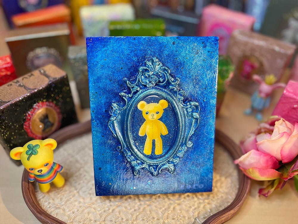 深いブルーの夜空みたいな背景に、ひとつだけ浮かぶ独自配合した粘土で作ったアンティーク風の小さな額縁。
