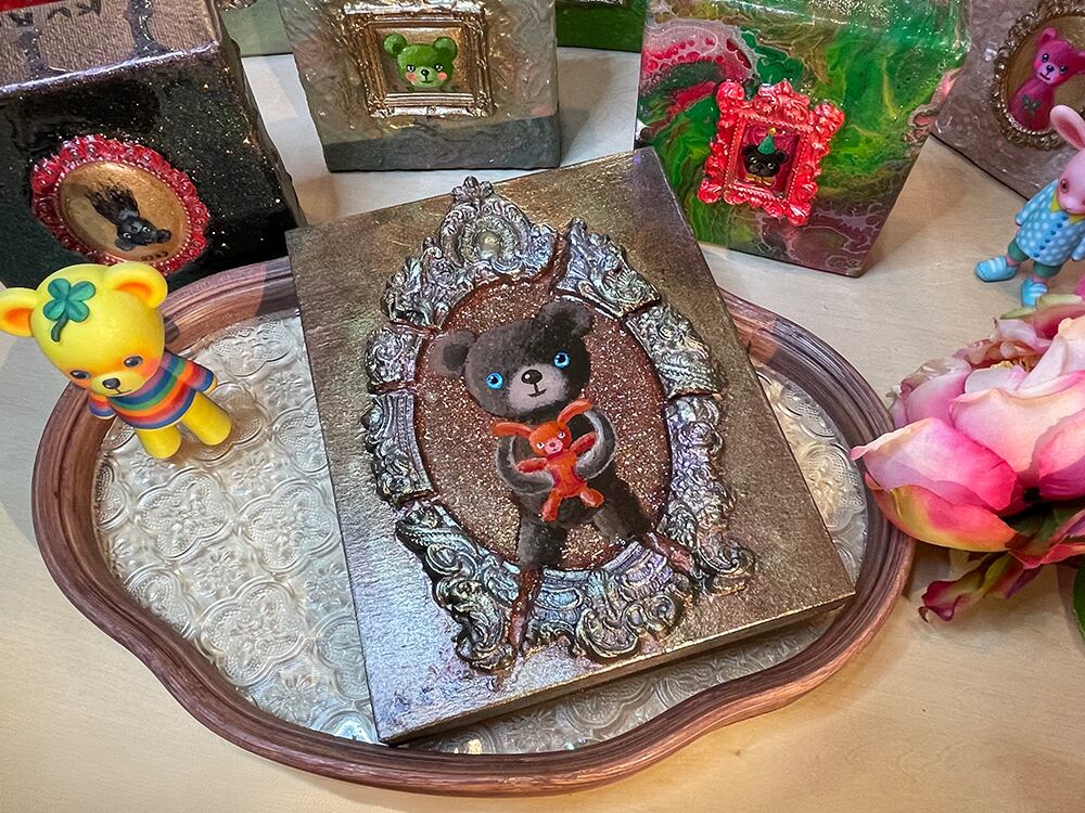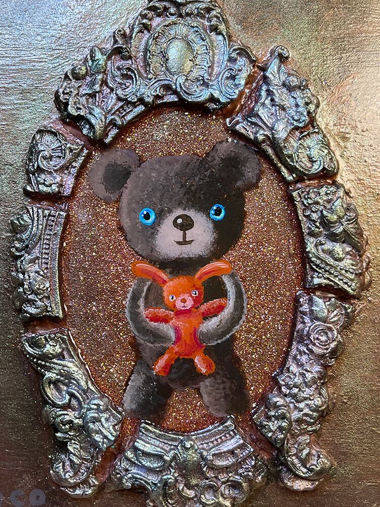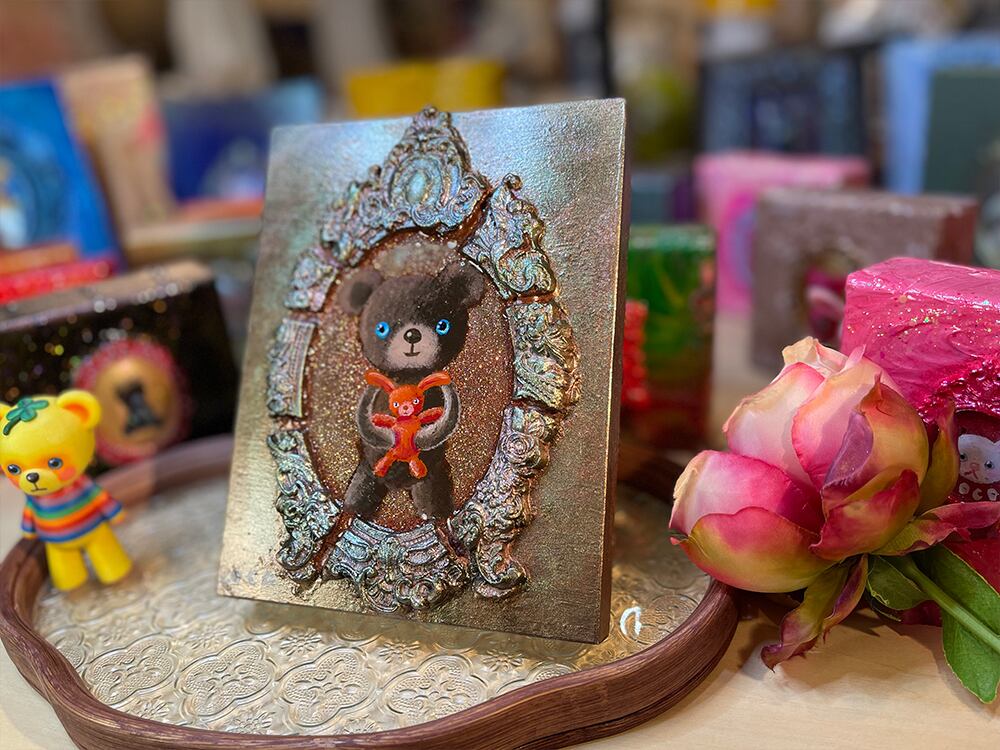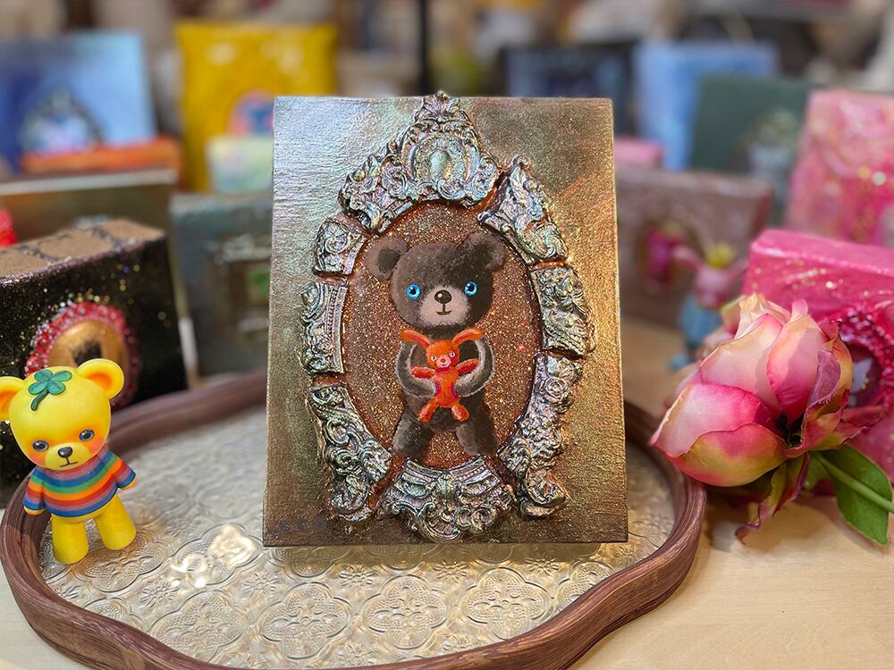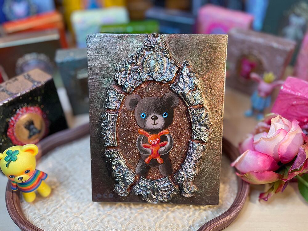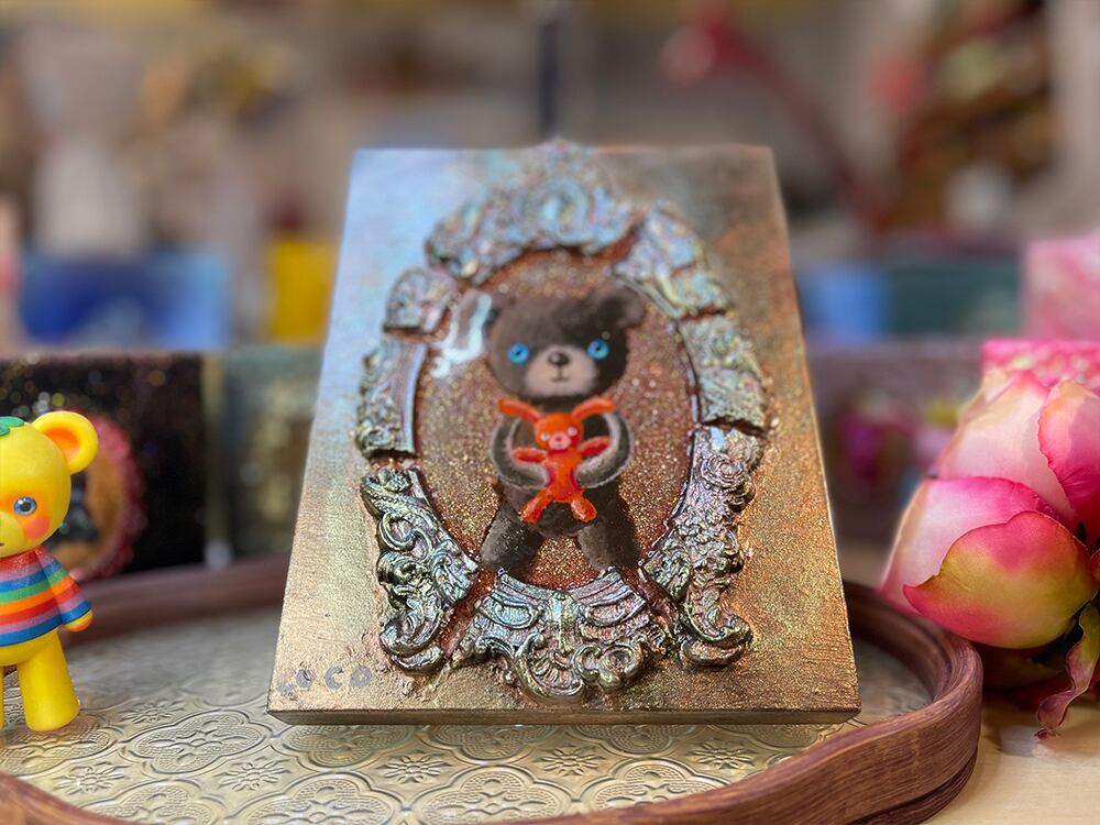 さらに、フレームは絵の外へ立ち上がる立体造形なので、平面作品というより 小さな宝箱のようなオブジェ として空間に映えます。