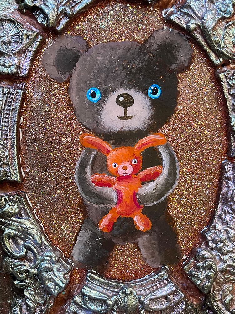 独自配合した粘土で作ったアンティーク風の大きな銀の装飾額の中に、そっと収まるチョコレート色のcocoくま。